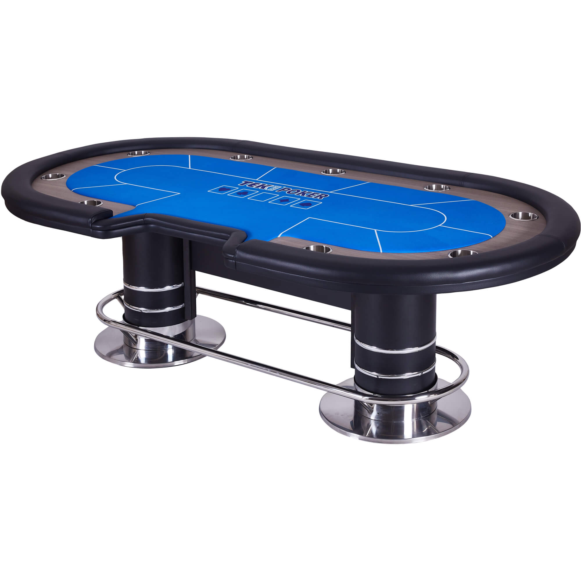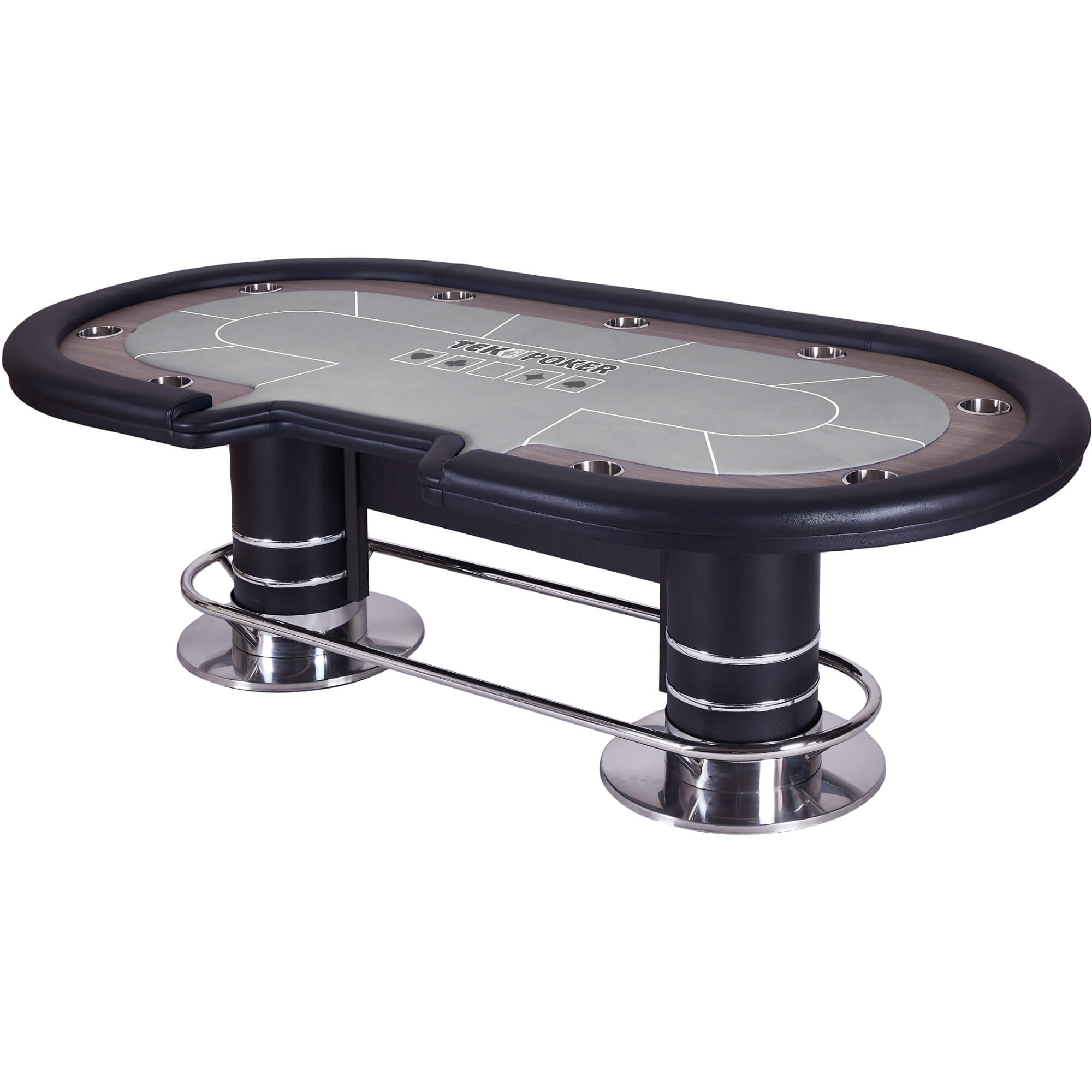 The quality baize, mounted on foam for a springy texture and easy card collection, is available in a choice of three colours and is clearly marked with player zones. A deep, comfy, cushioned armrest surrounds the whole table. Inside this, an elegant wood finish racetrack is inset with nine drinks holders - one for each player. Each drinks holder is large enough to hold a British pint glass, unlike American poker tables that often can only hold bottles. The chromed foot rail allows for a relaxed seating position for players of all heights and sizes.