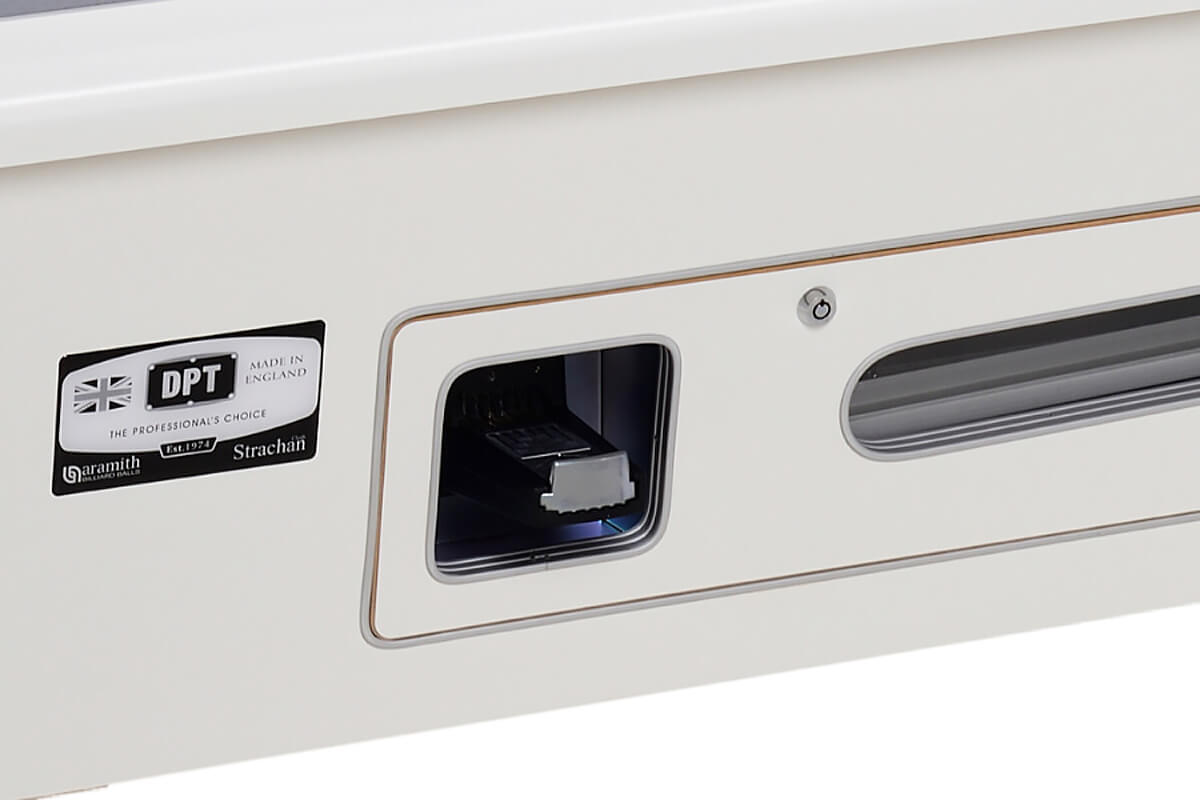 The main table body is topped with a removable top frame, secured with 10 clip fixings, that allows access to the cloth and slate. The rail is wider than many tables, and each high-performance cushion is mounted in four places, rather than the usual three. This increases the consistency of the cushion rebound right along its length.