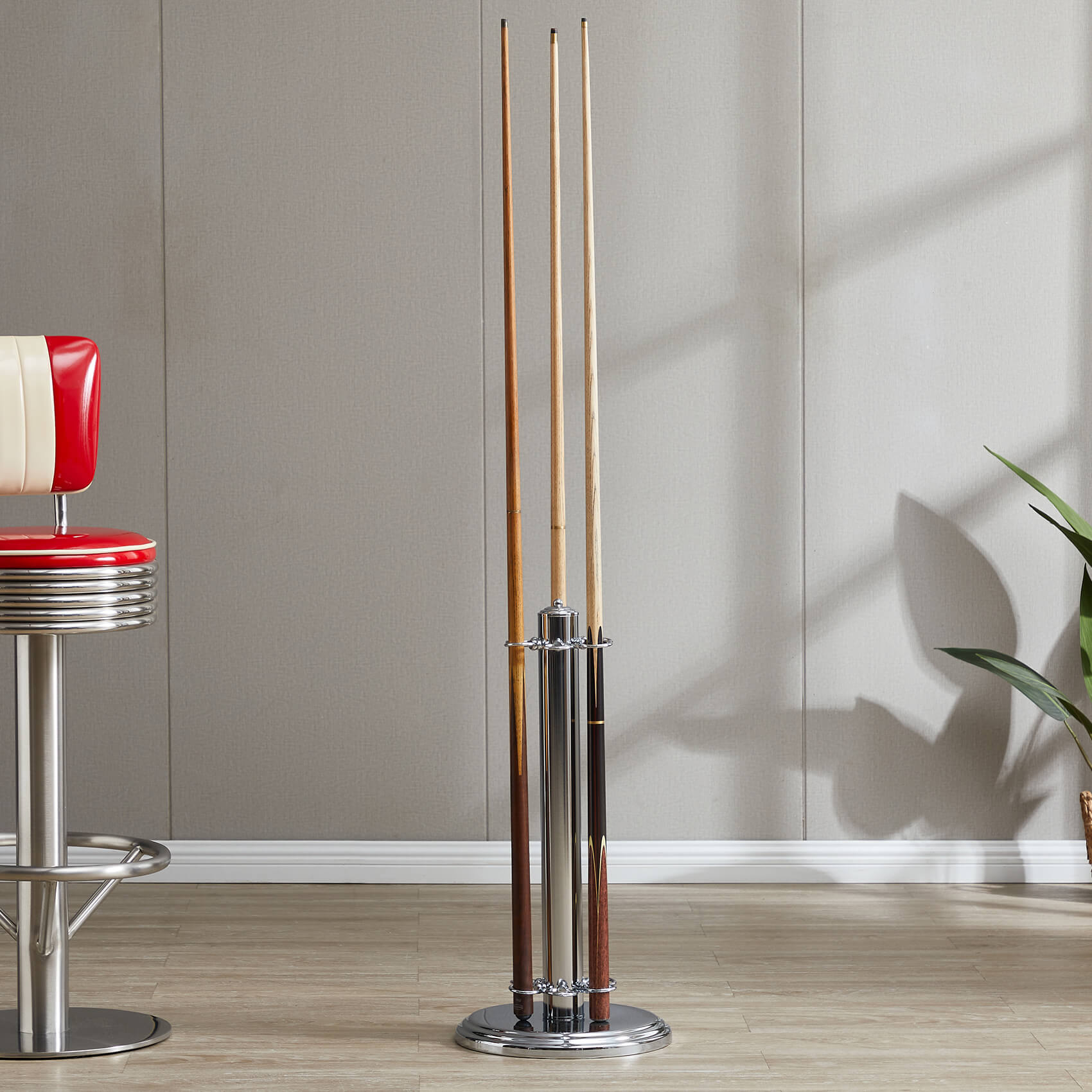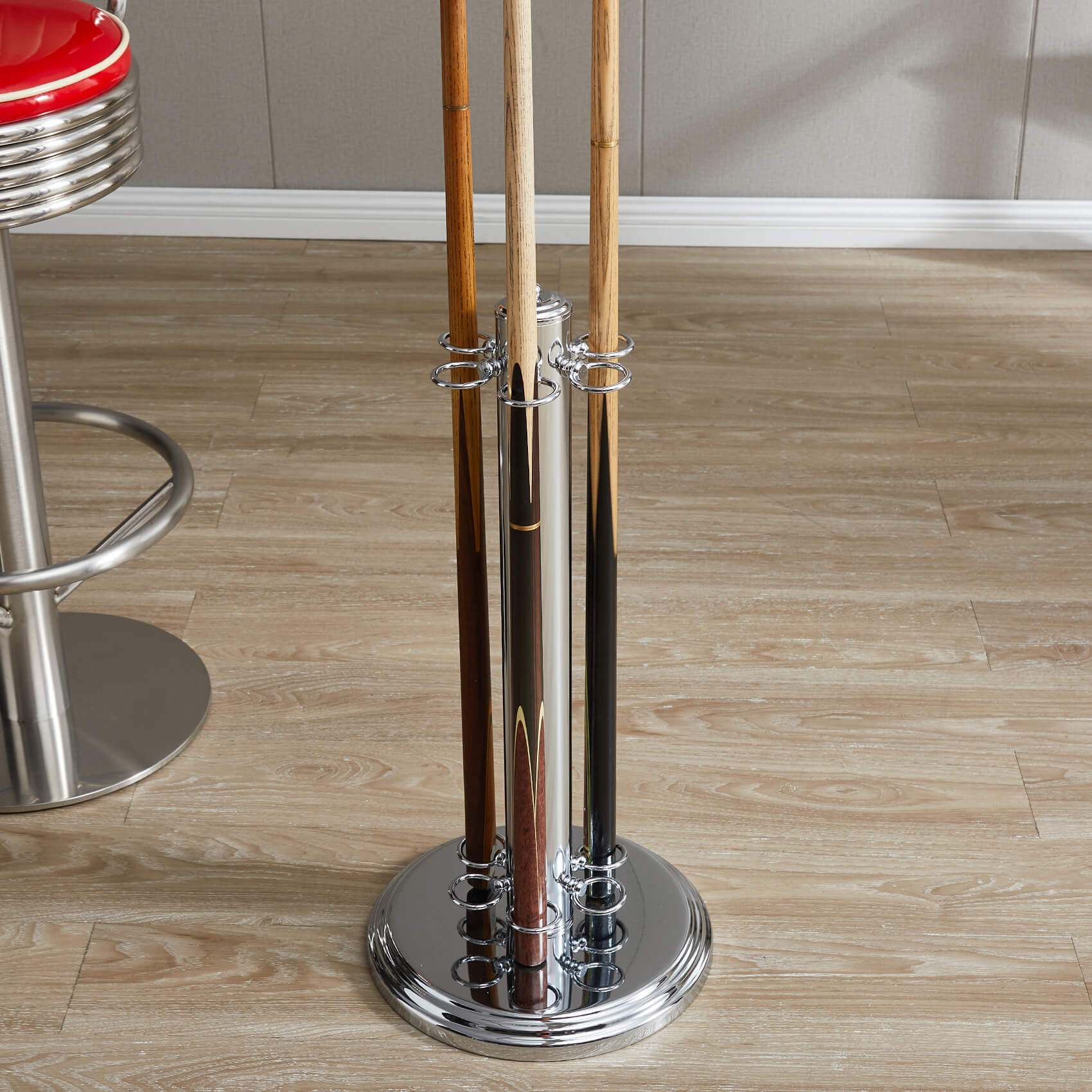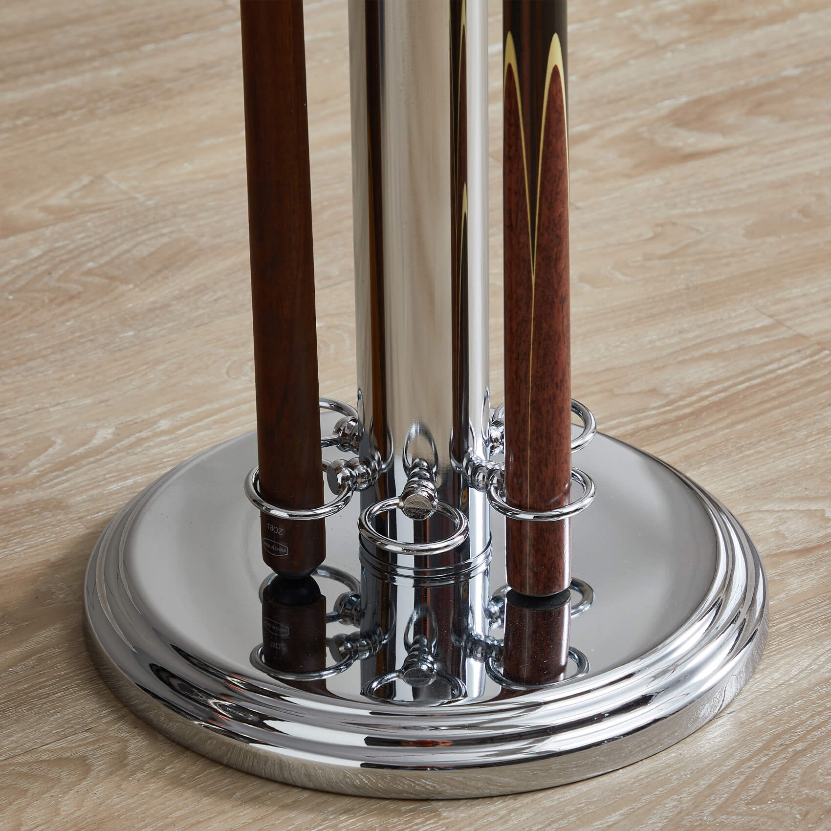 • Elegant chrome cue stand.