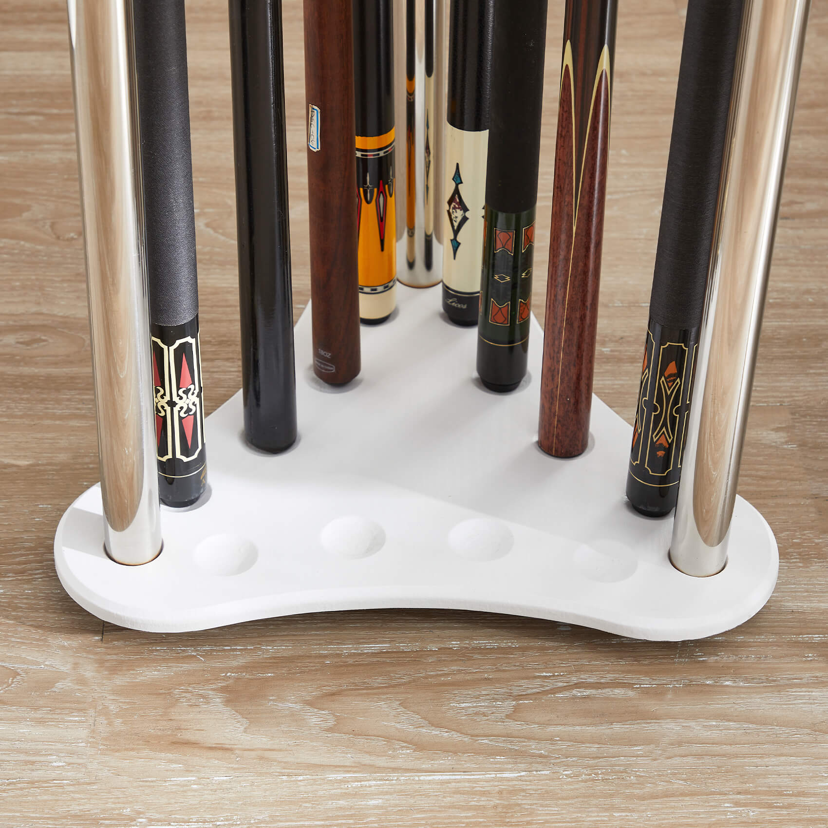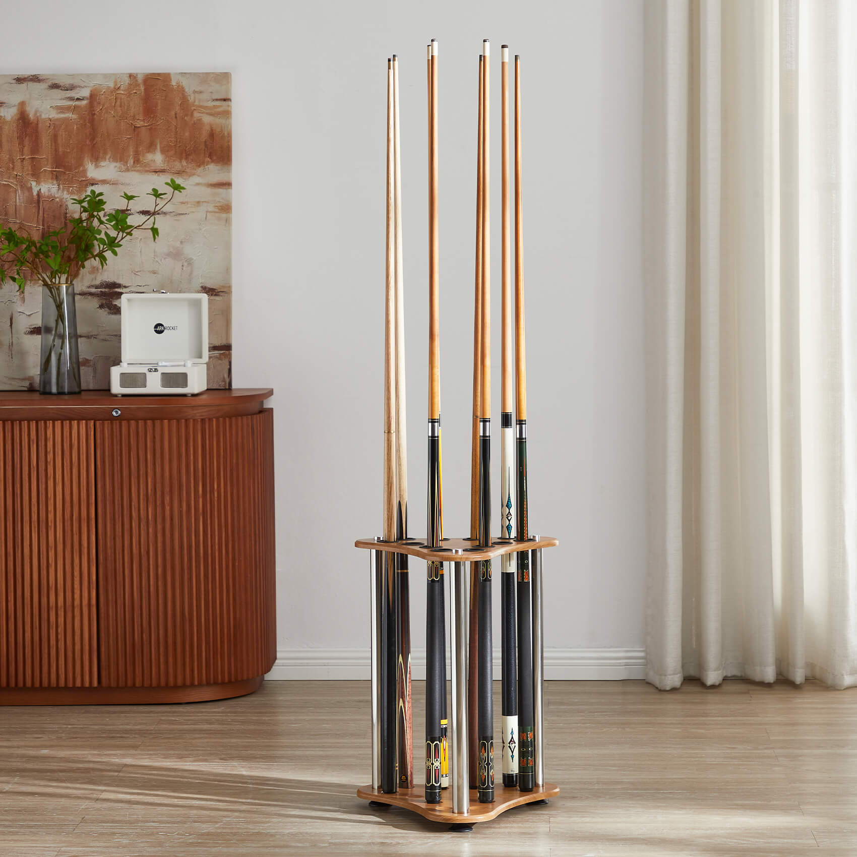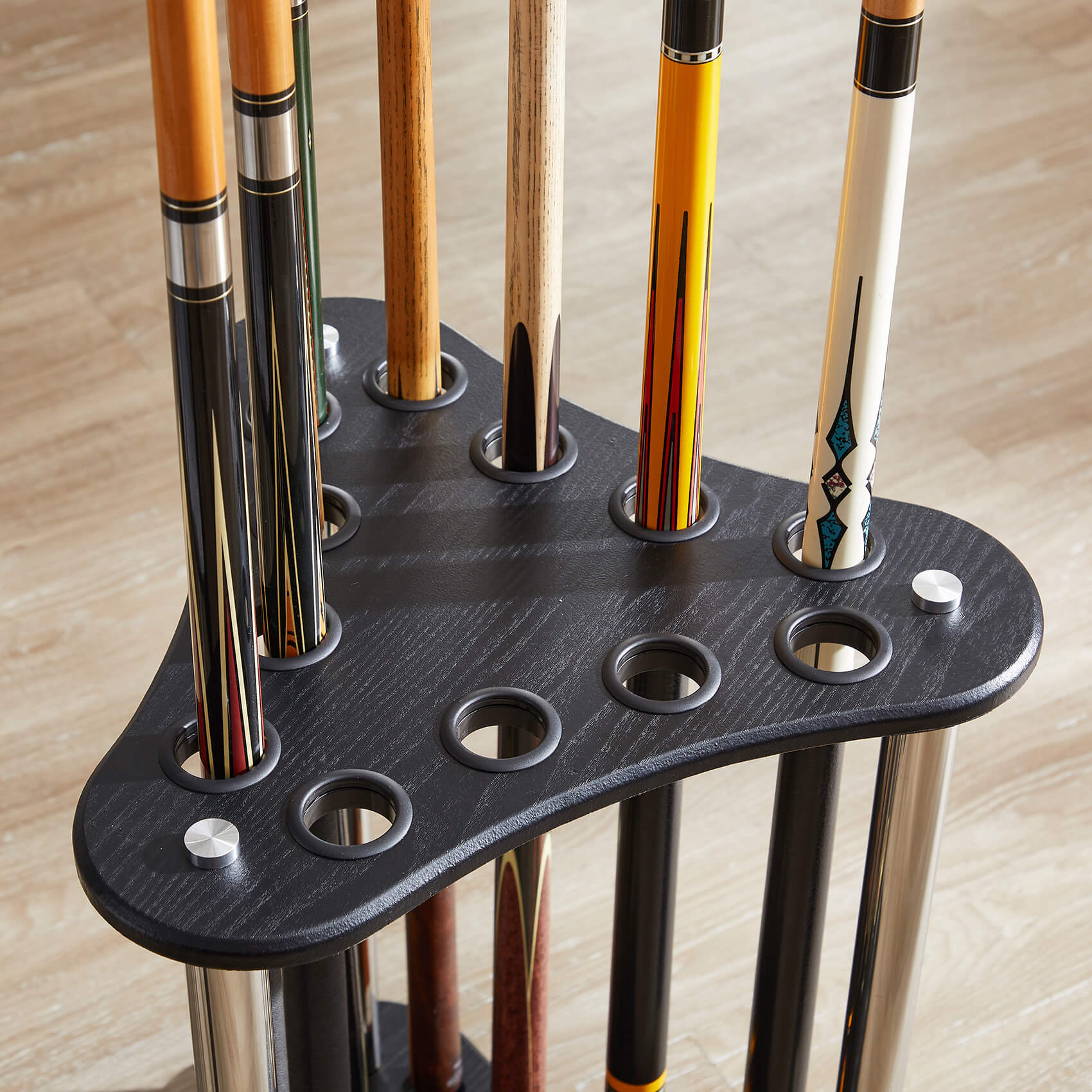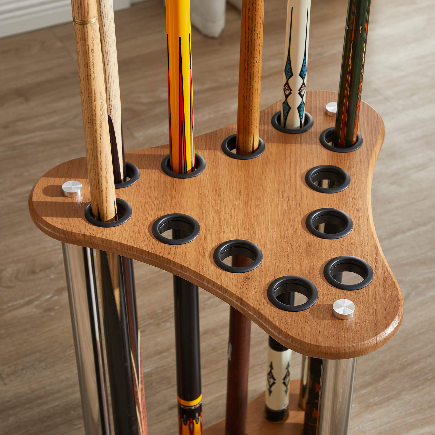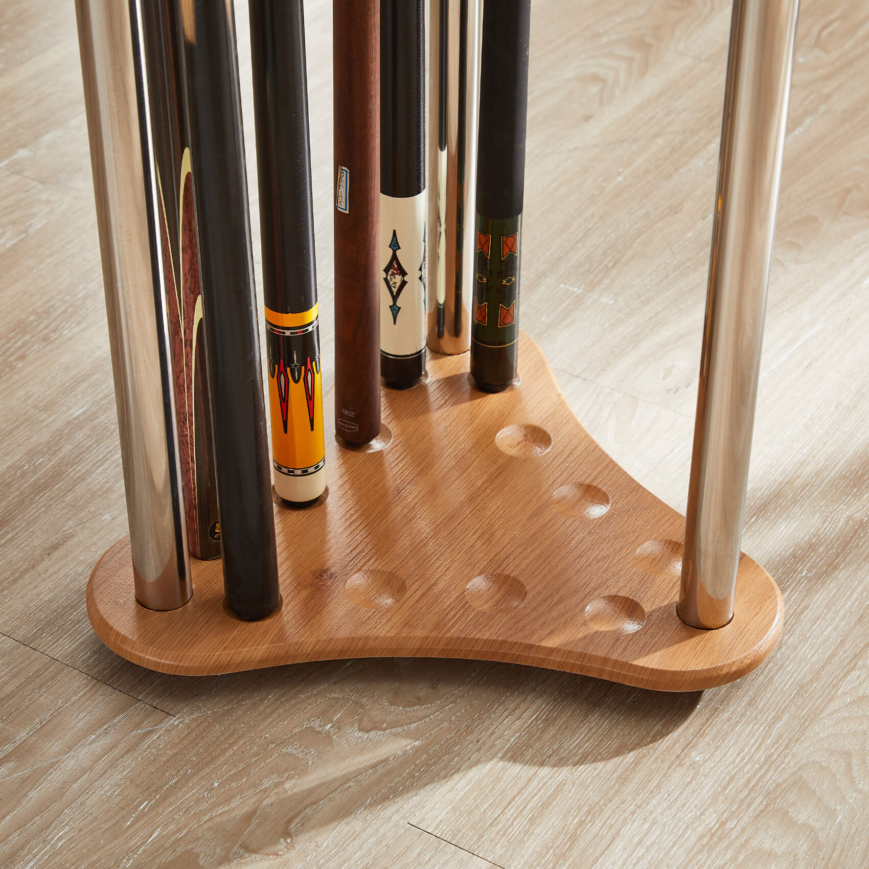 It holds 12 cues, arranging four on each of the three sides. This clever design means your favourite cue is always within easy reach.