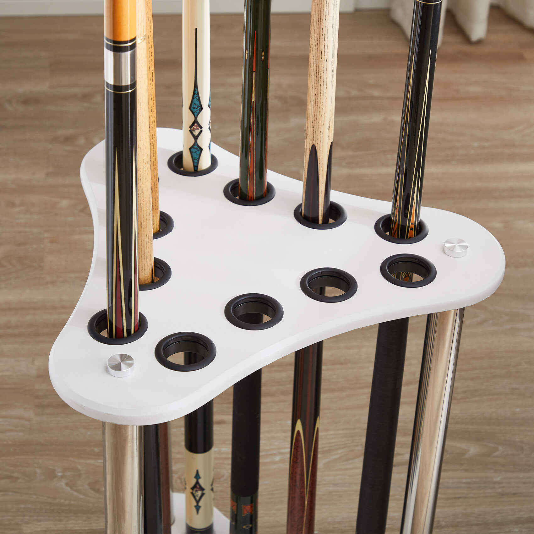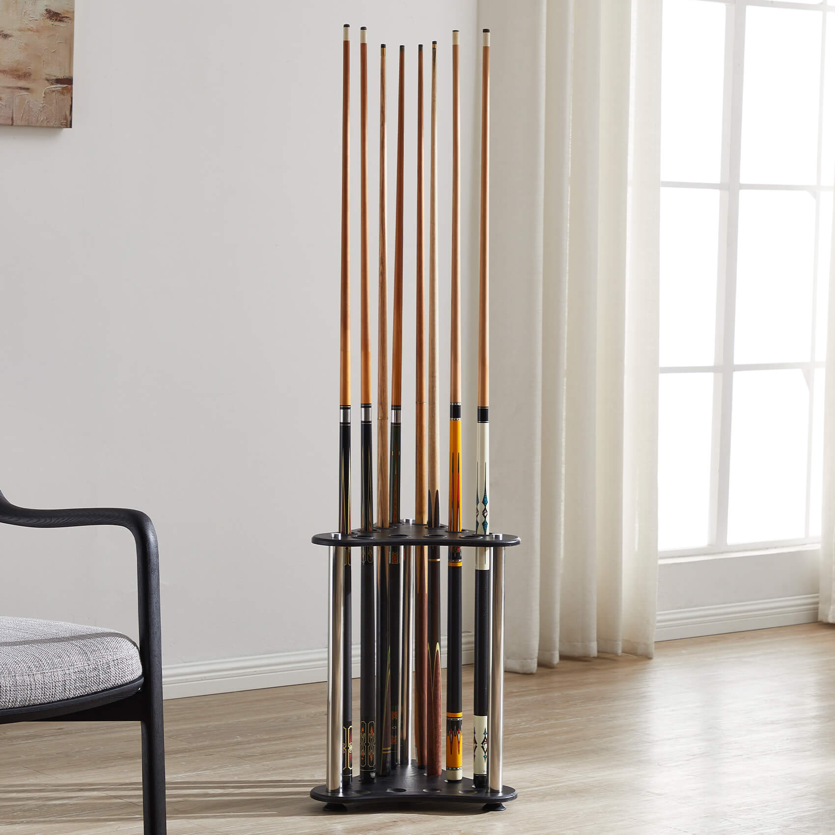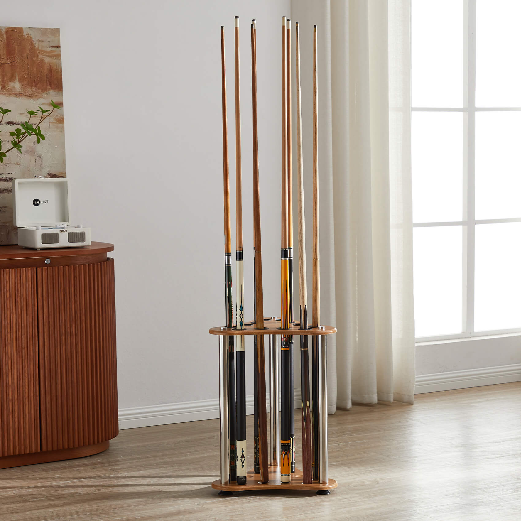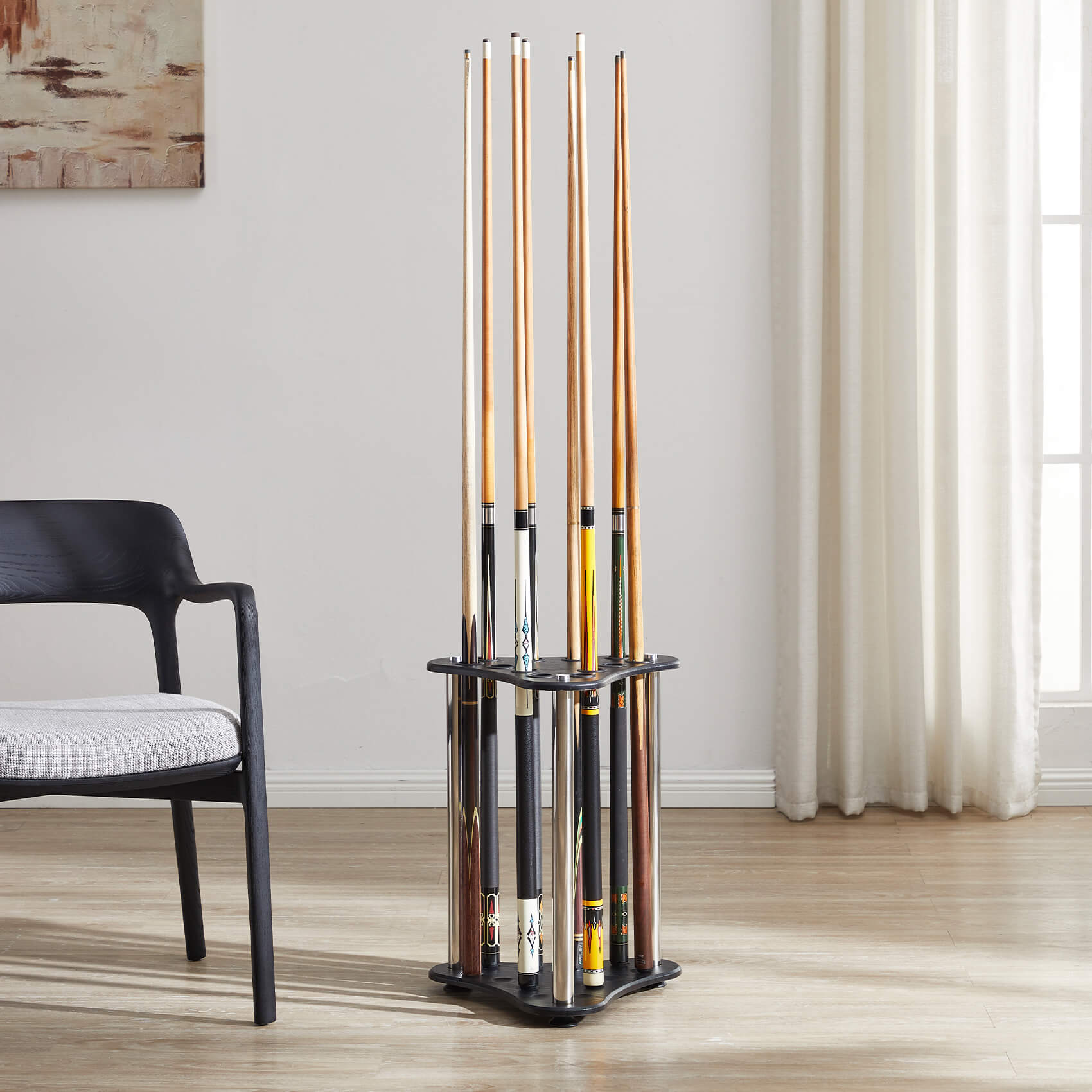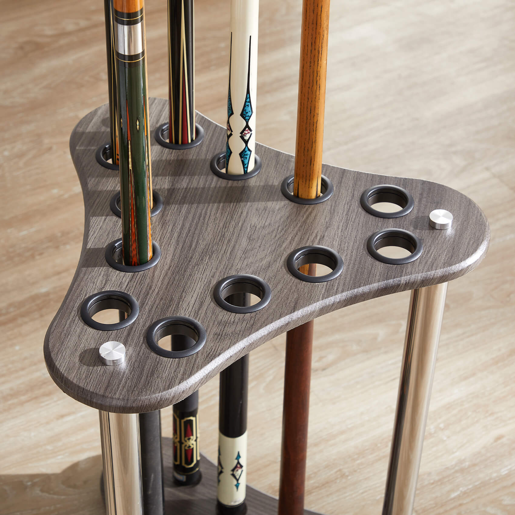 It holds 12 cues, arranging four on each of the three sides. This clever design means your favourite cue is always within easy reach.