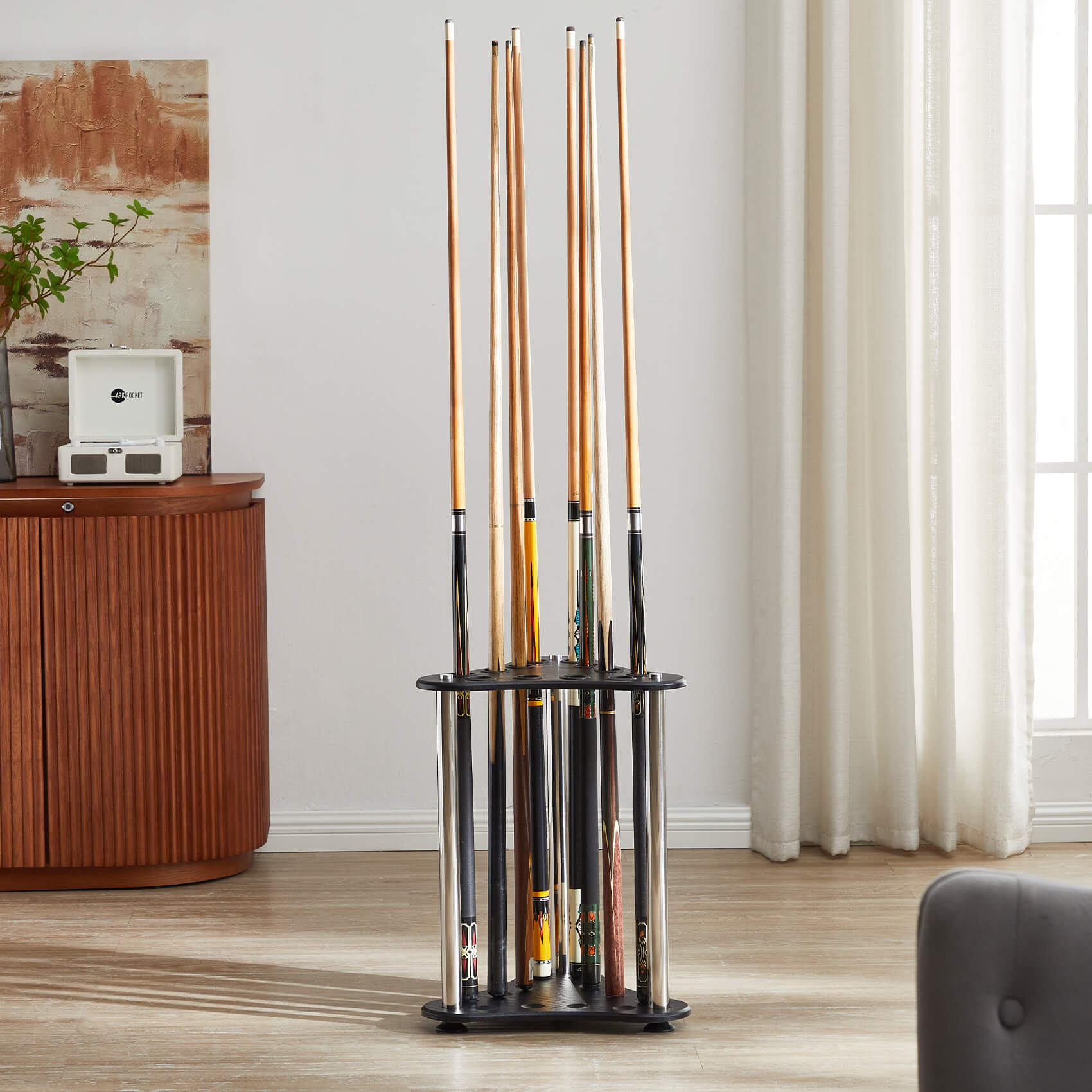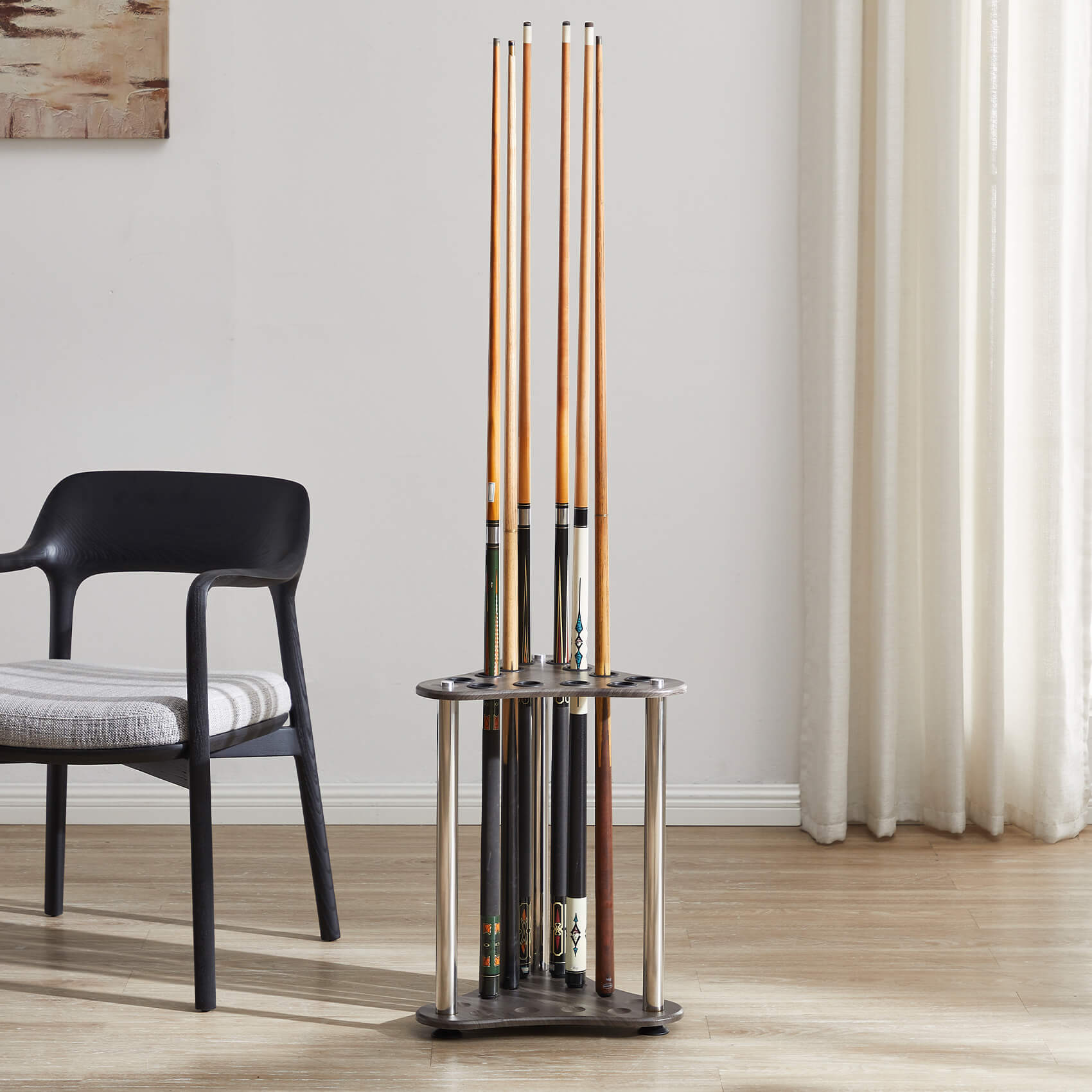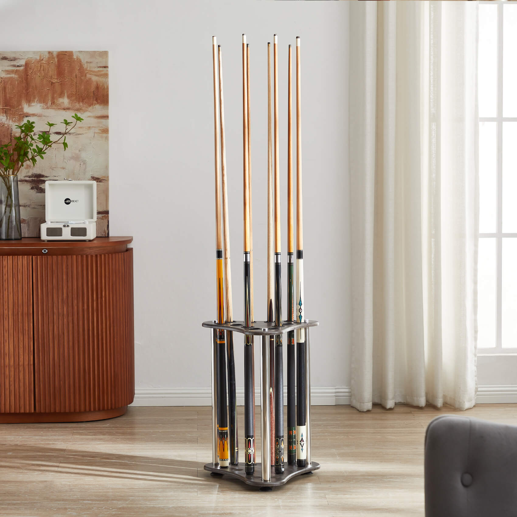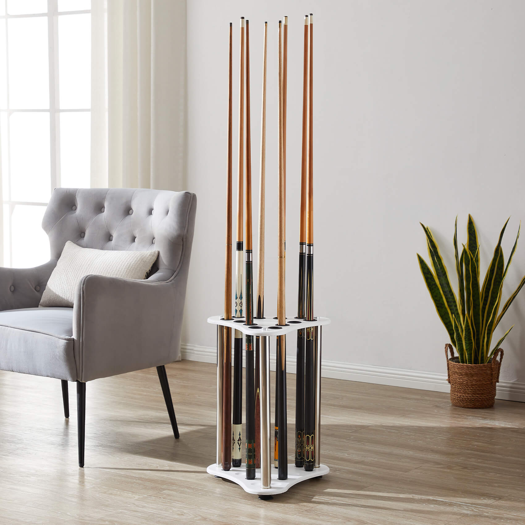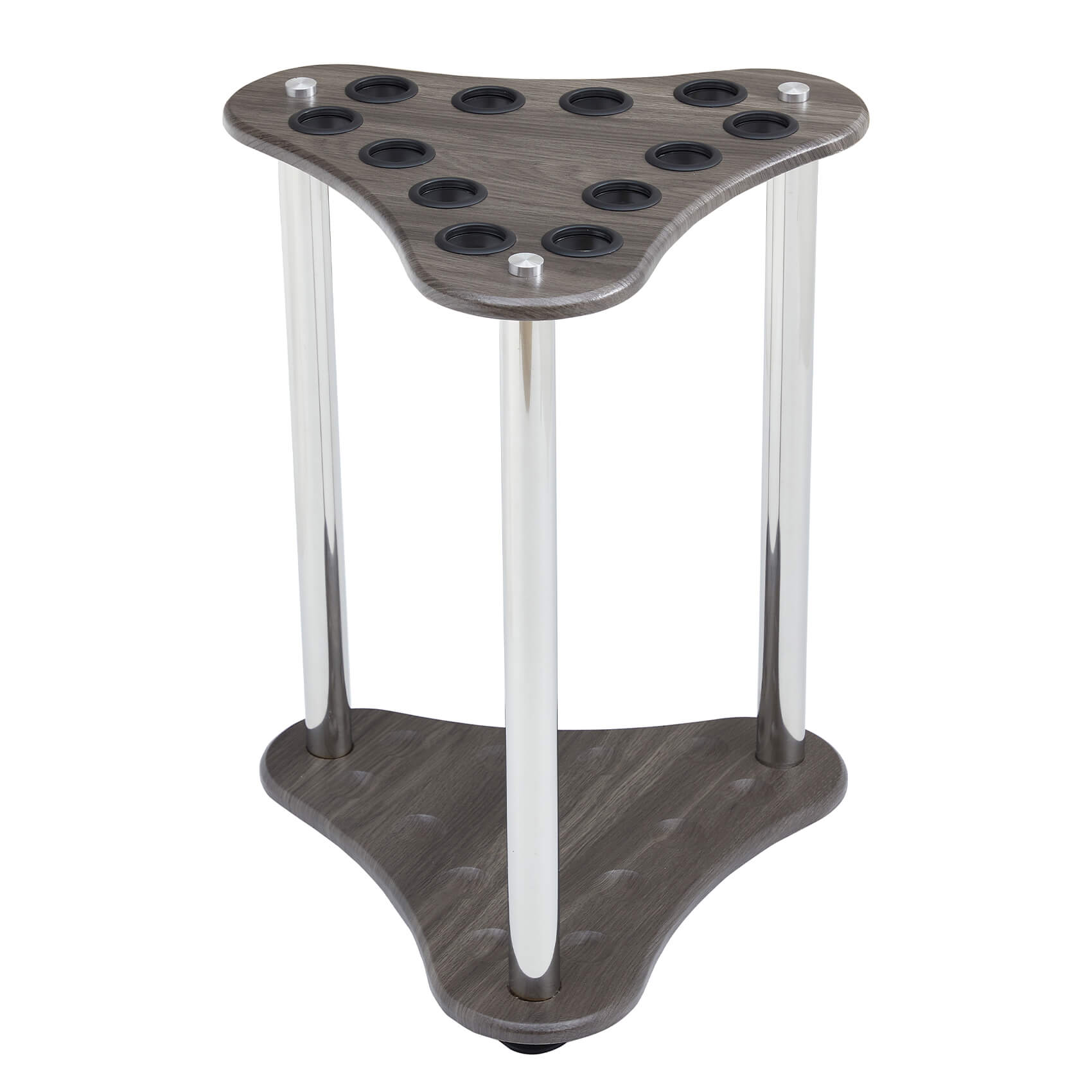 It holds 12 cues, arranging four on each of the three sides. This clever design means your favourite cue is always within easy reach.