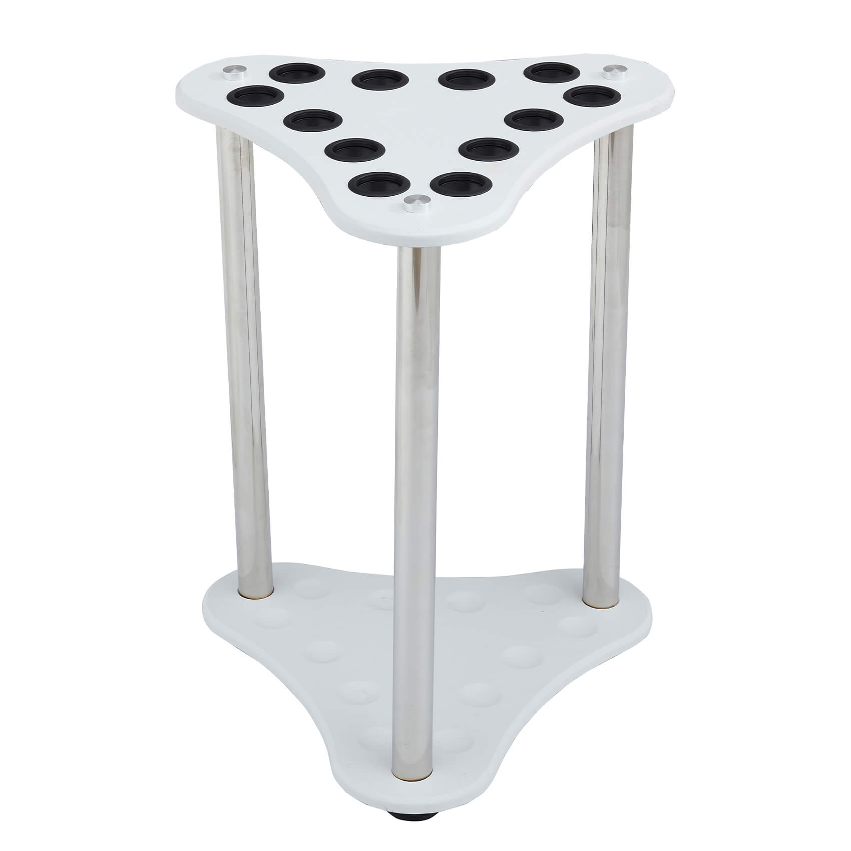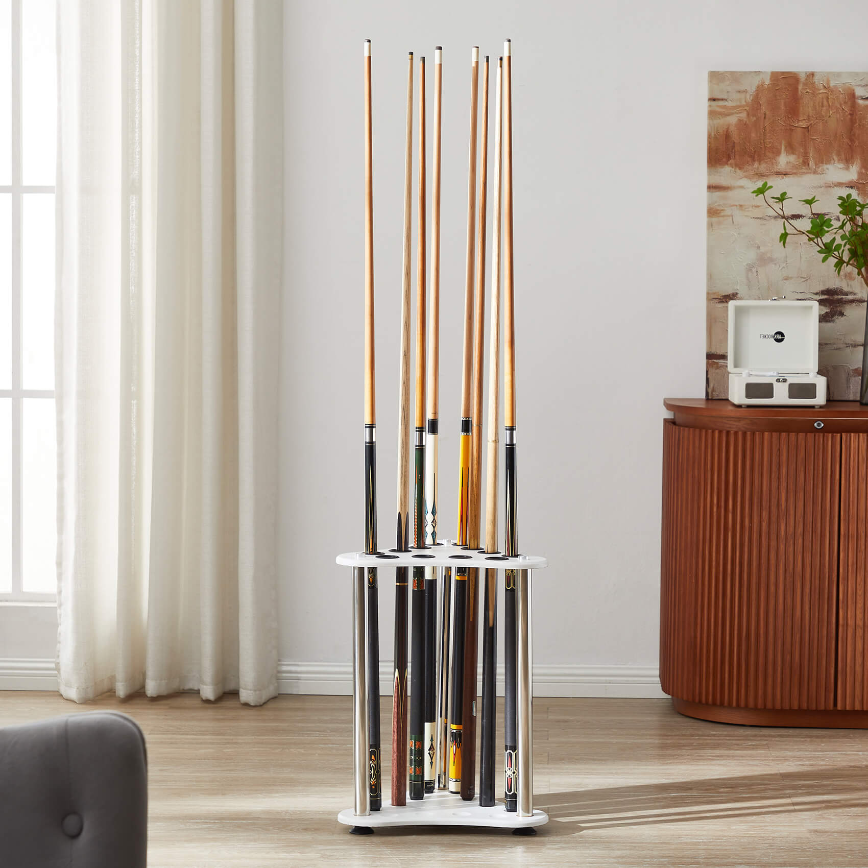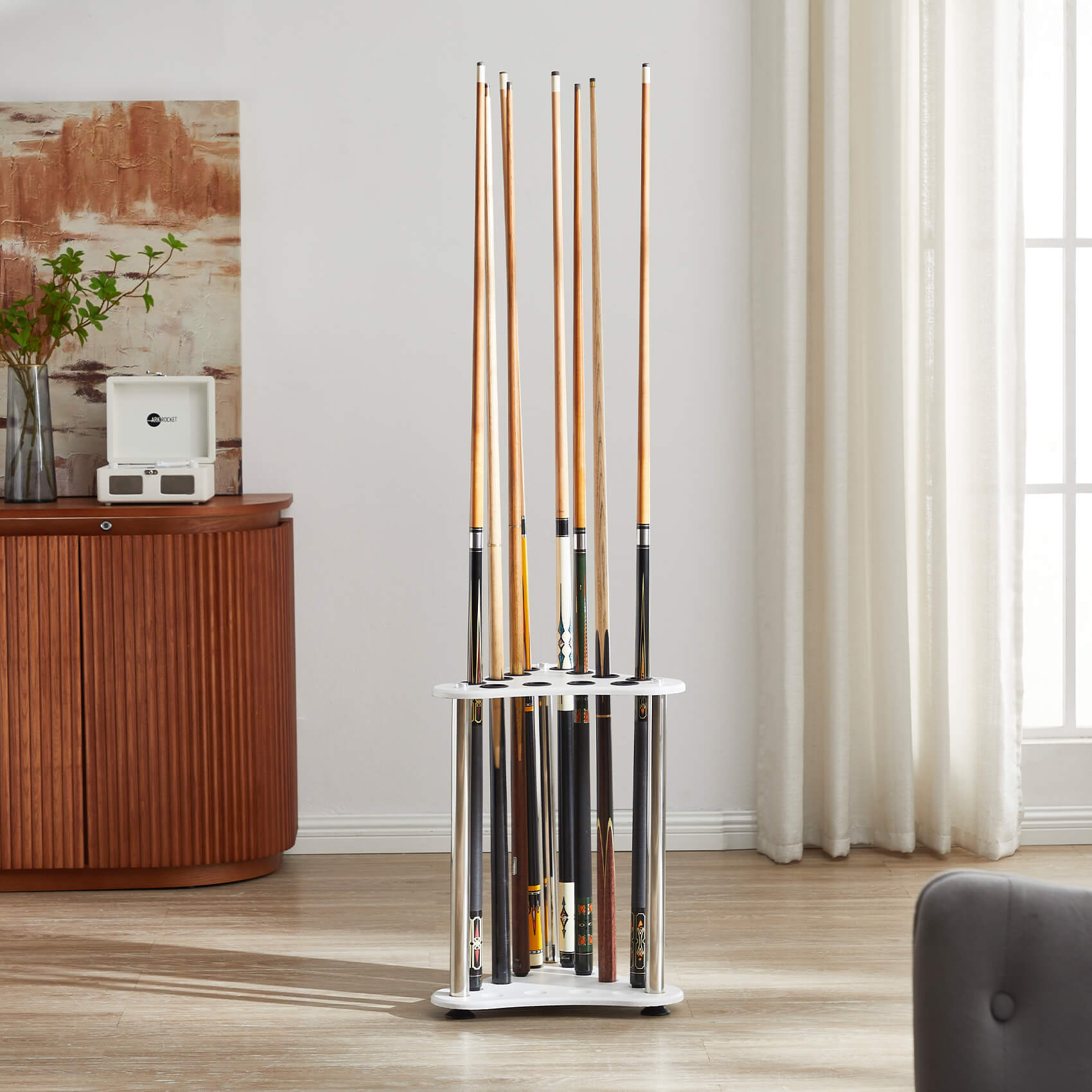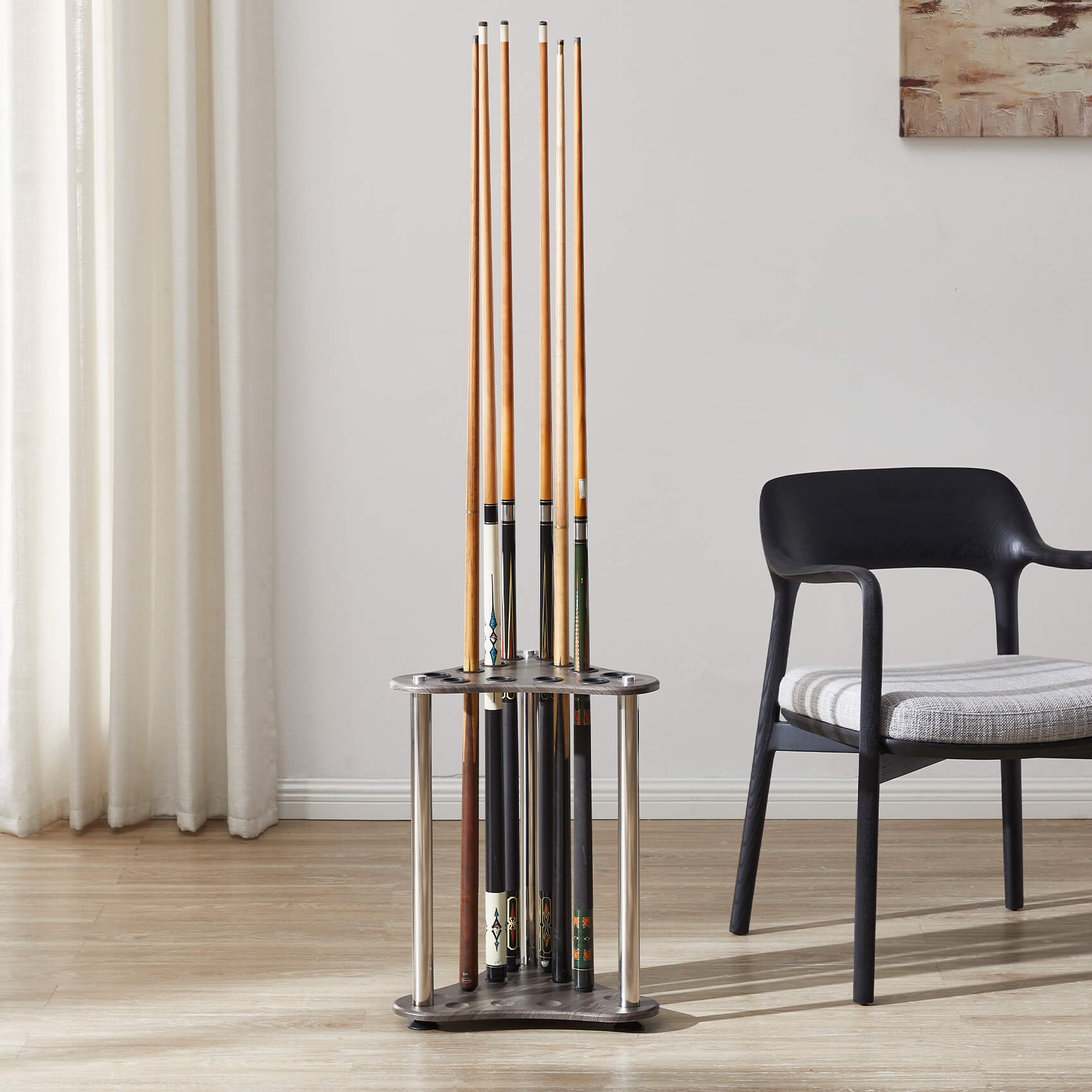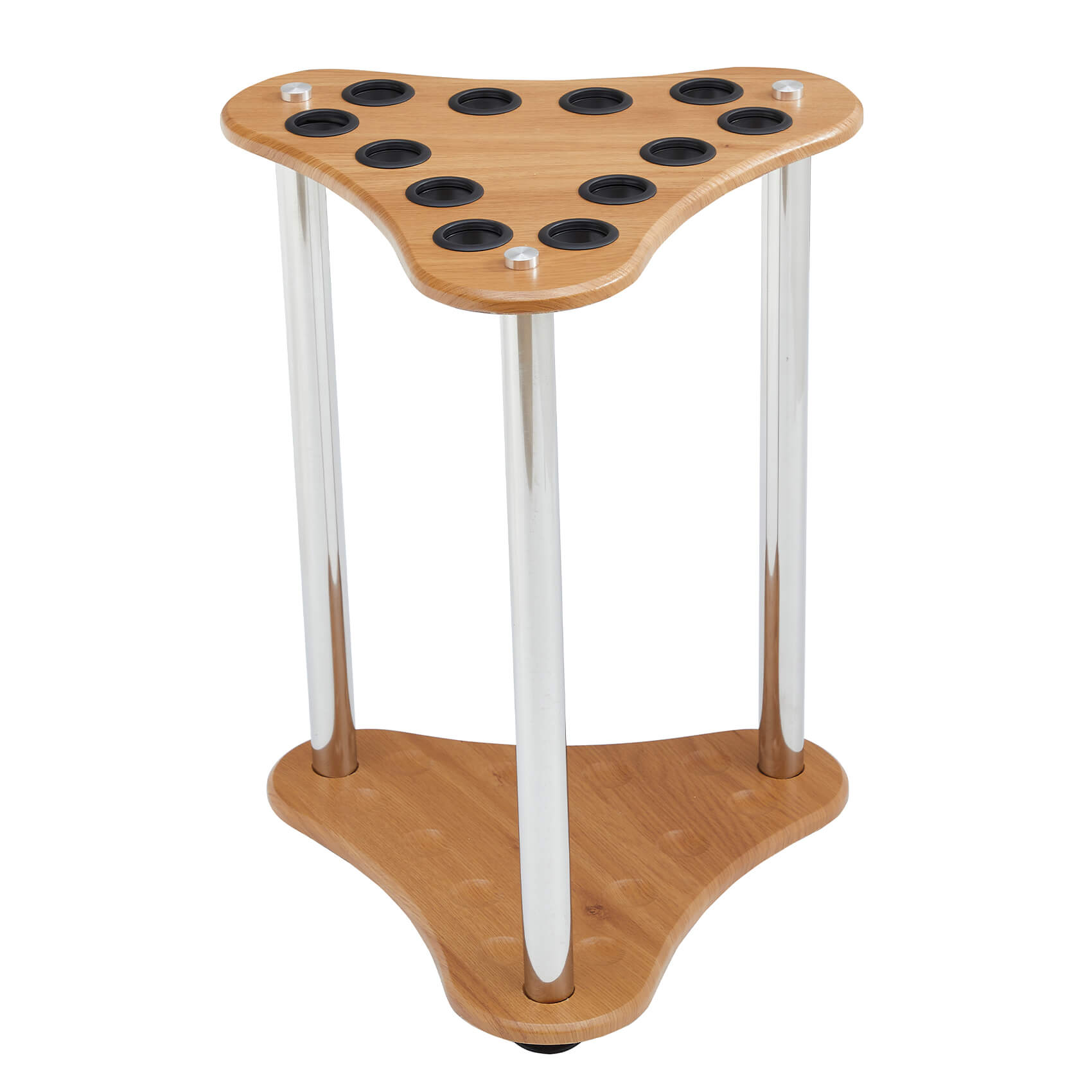 It holds 12 cues, arranging four on each of the three sides. This clever design means your favourite cue is always within easy reach.
