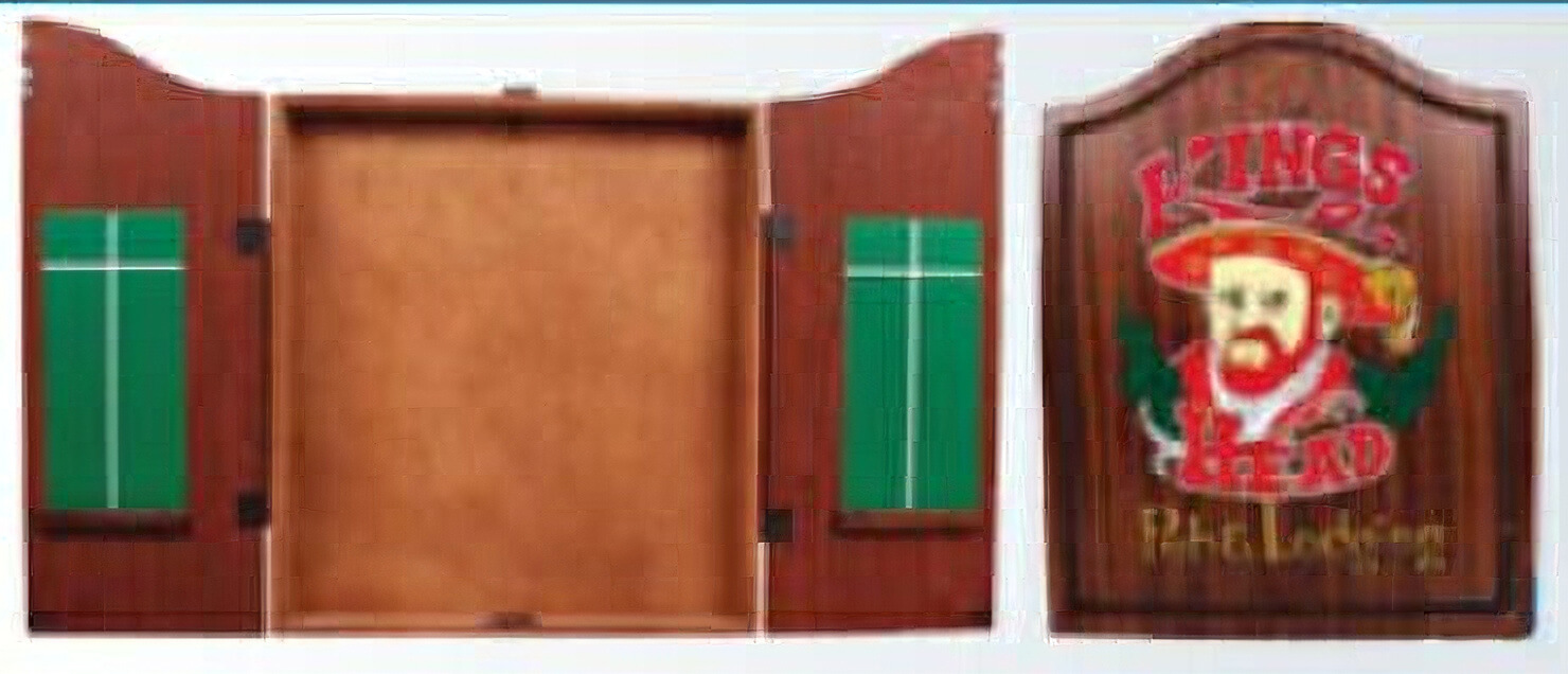 KINGS HEAD COLOURED CABINET Product ref: 8455.000. An MDF wooden Dart cabinet! This wooden cabinet has a black furniture finish and gold motif.