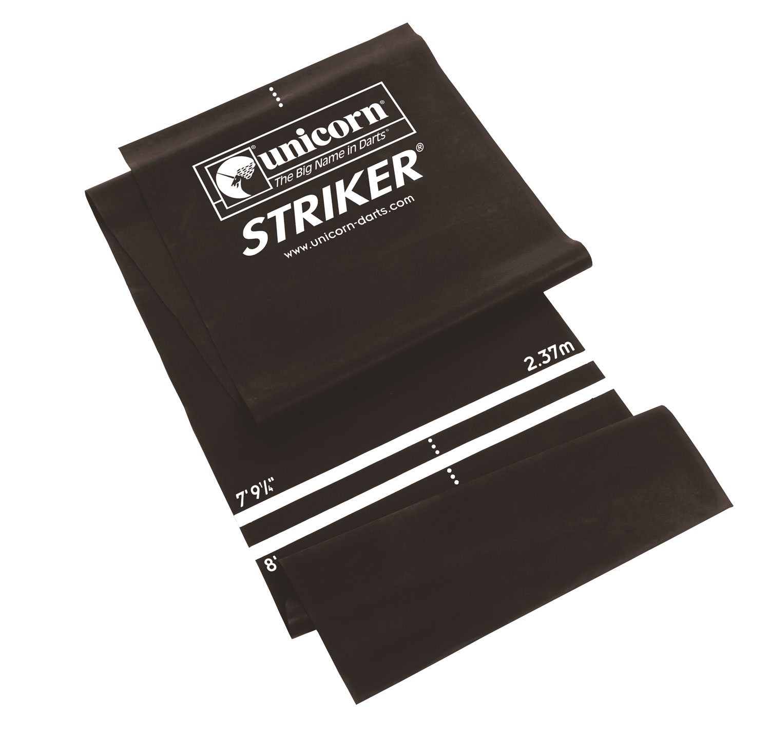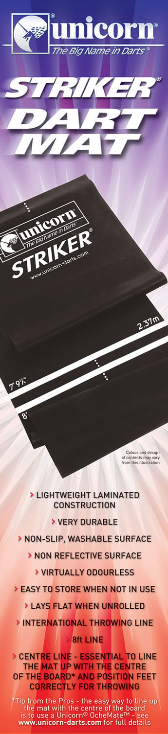 You'll always throw from the right line with the Striker darts mat. Made from hard-wearing EVA, Unicorn's Striker darts mat is durable and flexible. It can be folded or rolled up and stored away when not needed, and has a non-slip coating on the underside, for extra stability on any floor surface.