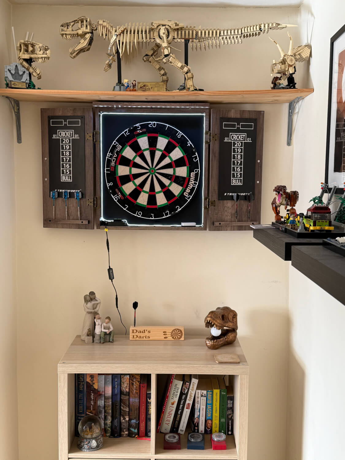 Below the scoreboards there are indents for storing darts - one set of three on each side. This keeps them tidy and out of the way, and presented attractively. The inner bottom shelf of the main cabinet has enough room for chalk and other small accessories.