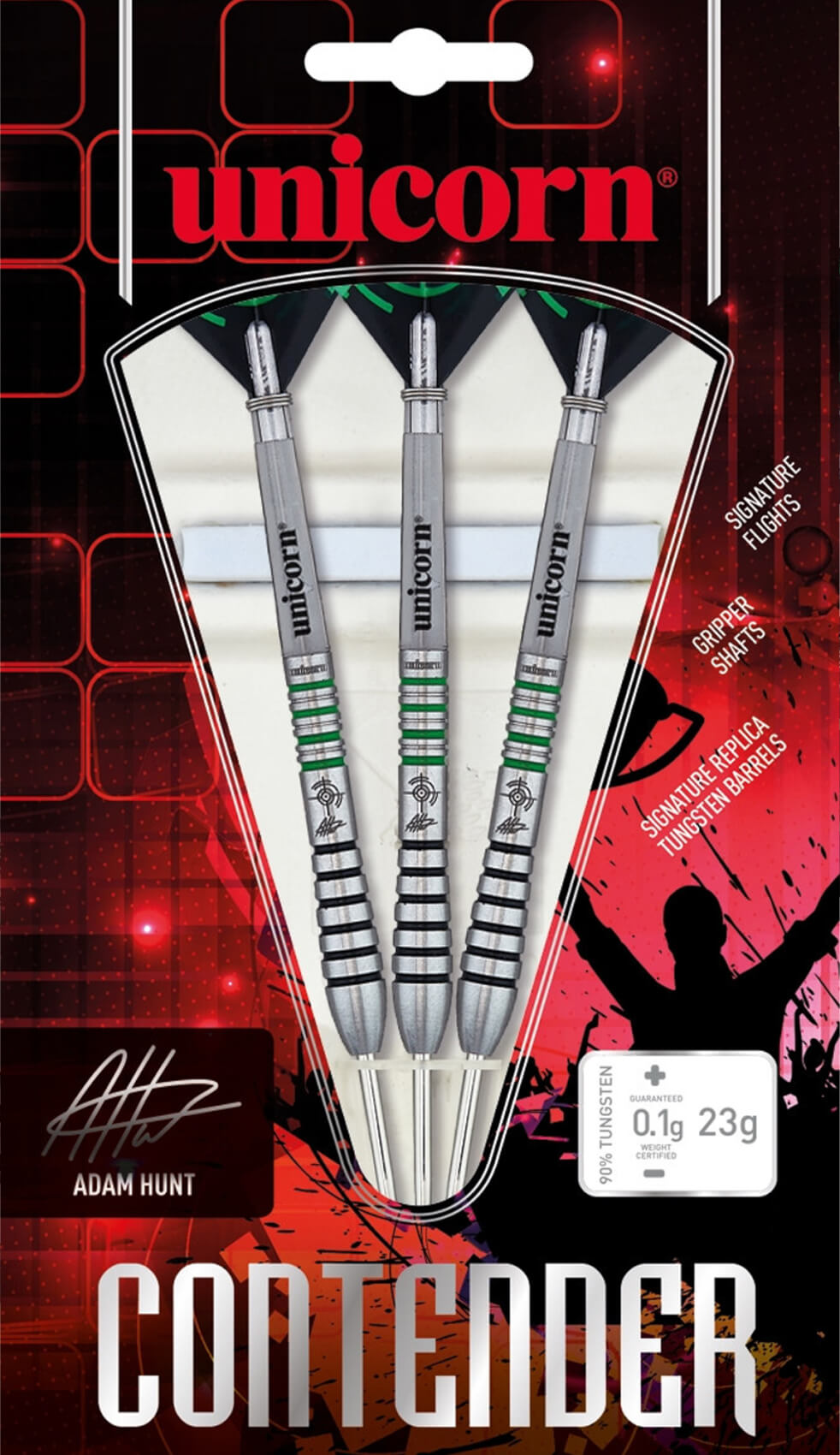 The Contender is the dart of choice for Unicorn ambassador Adam Hunt. They're made from 90% Tungsten and designed for Unicorn's Contender Series members, who are hand-picked darts players and some of the biggest names in the sport!