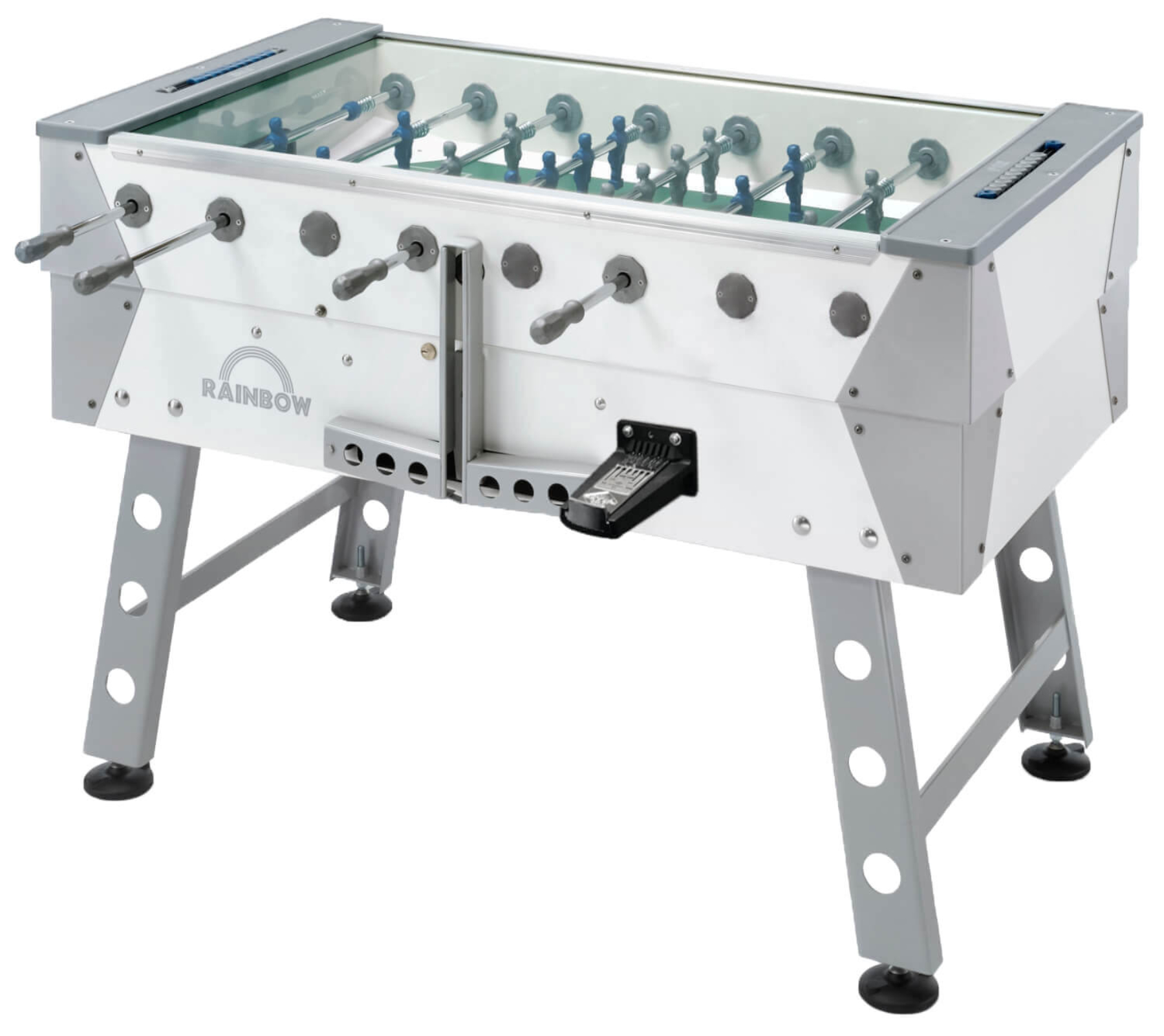 You can be assured that rain will never call off play as the green and silver team players remain dry beneath the watertight toughened glass top (which is also shock resistant for extra safety). There’s even a hinged lid, for access to the optional cash box and coin mech, and for extra storage capacity inside the table. The Rainbow is treated to withstand UV light, making sure it retains its good looks even when left in bright sunshine.