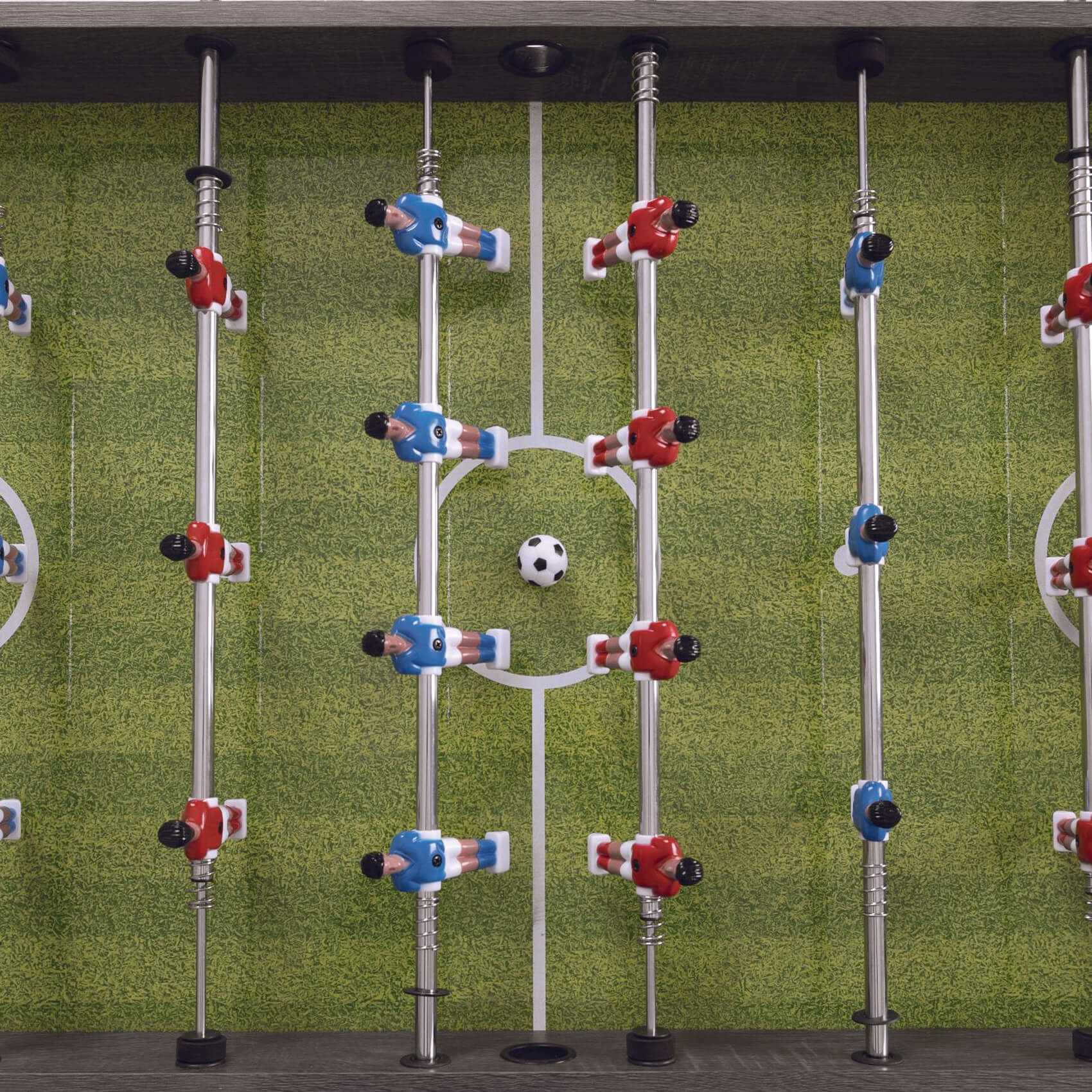 The players are arranged in an unusual 1-3-4-3 formation in order to fit on the compact playfield. This formation is said to allow for a stronger defence and for more variable ball possession than the traditional 1-2-5-3 formation. The goalkeepers are able to spin fully, and all of the players - coloured in either red team or blue team strips - are fastened securely to 13mm telescopic player rods.