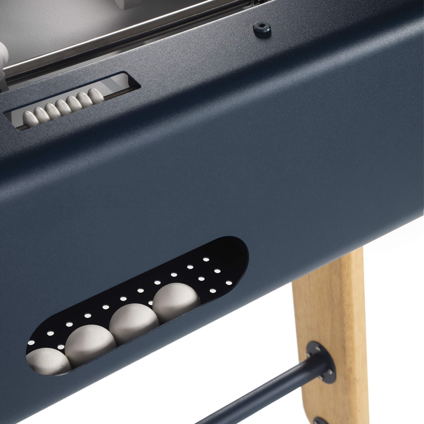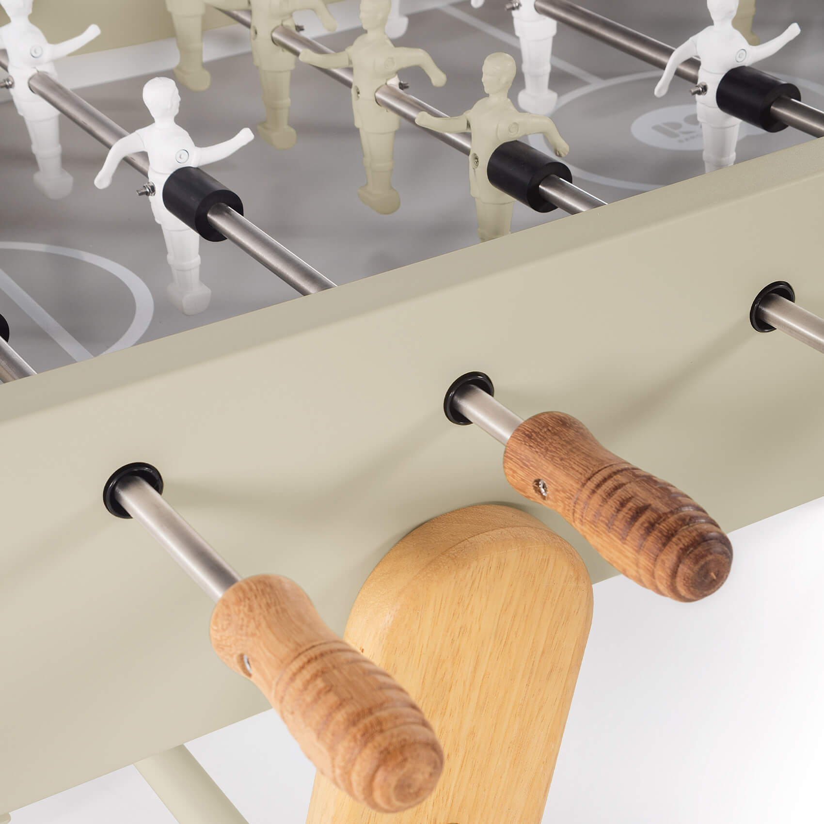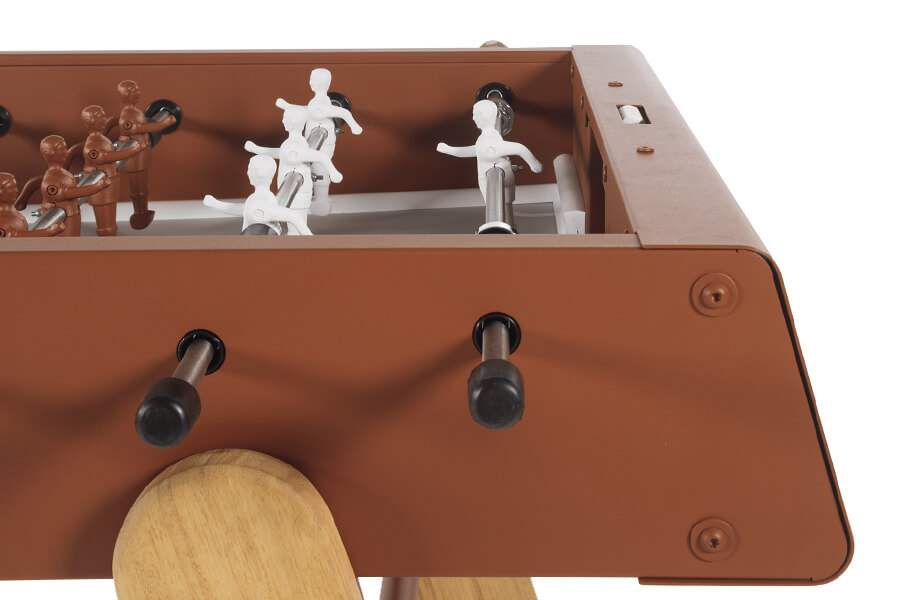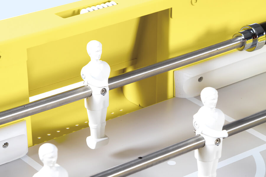 The pitch is formed from quality HPL, and coloured in grey with white pitch lines. Player rods are pass-through solid type, and are fitted with ergonomic iroko wood handles, which feel beautiful in the hand, and safety bungs at the other end. A recessed scoring abacus by each goal allows you to easily keep track of the match.