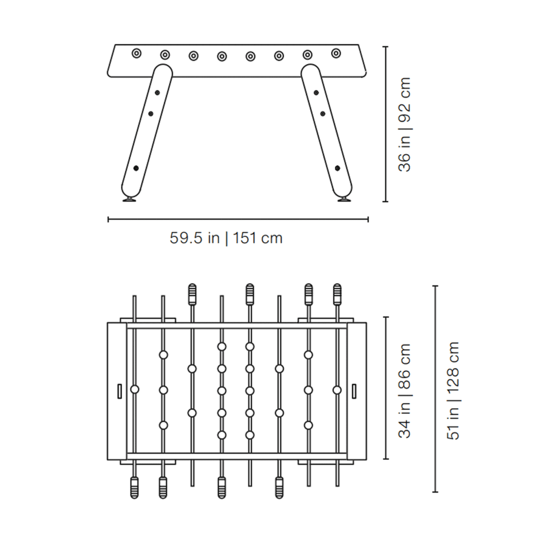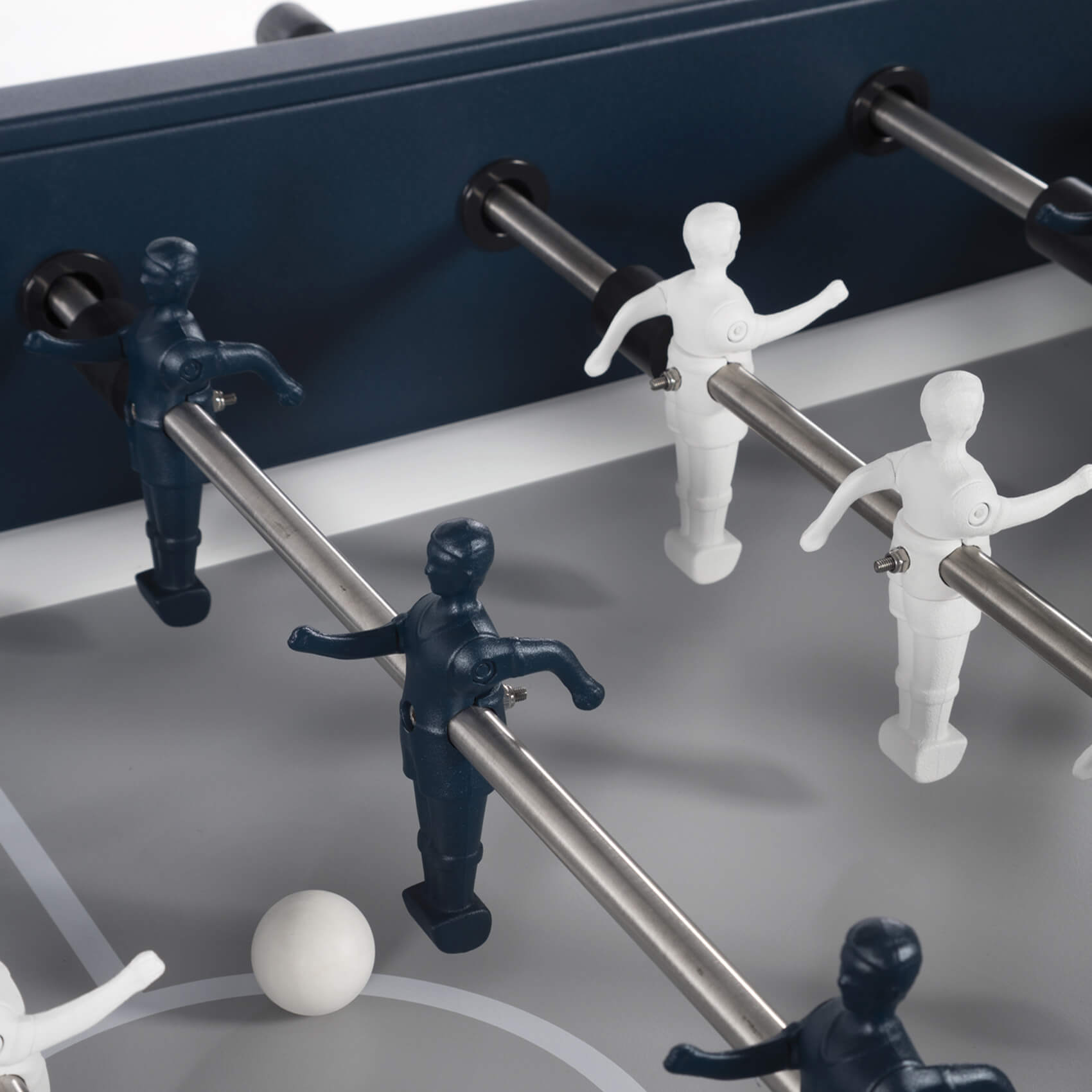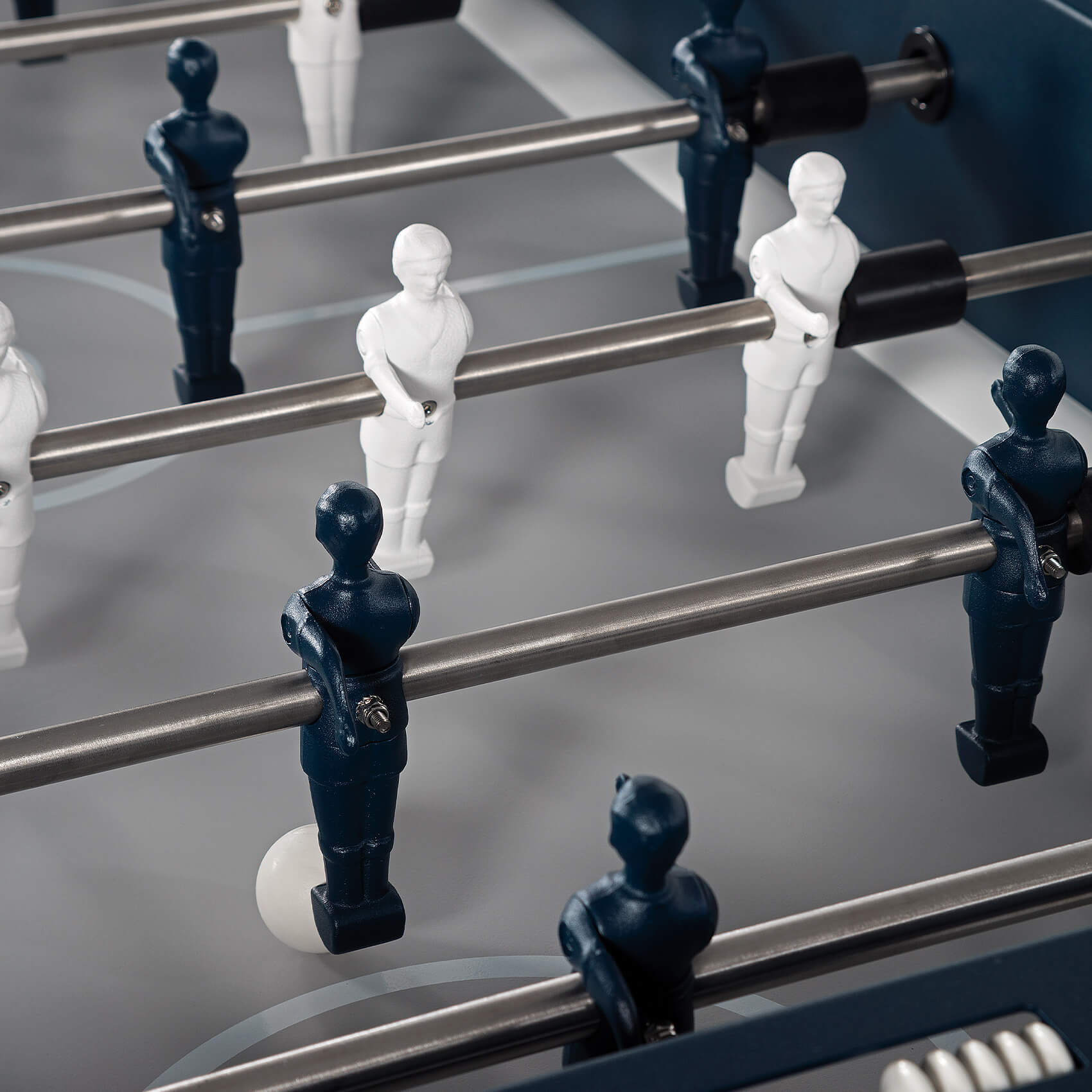 The pitch is formed from quality HPL, and coloured in grey with white pitch lines. Player rods are pass-through solid type, and are fitted with ergonomic iroko wood handles, which feel beautiful in the hand, and safety bungs at the other end. A recessed scoring abacus by each goal allows you to easily keep track of the match.