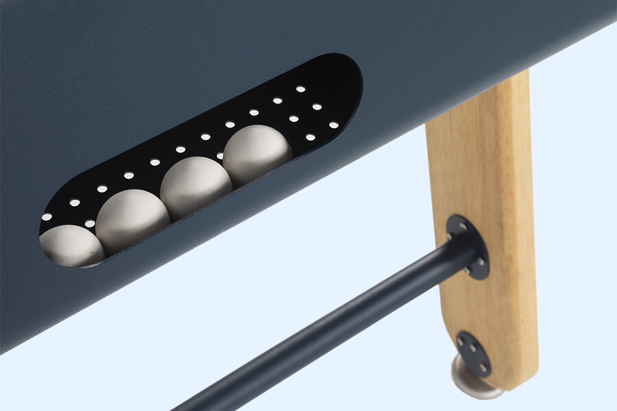 Supporting the table are four strong, tough, iroko wood legs, braced with metal struts that are coloured to match your cabinet finish. Non-slip feet keep the table from moving during intense games, and the cataphoretic coating with coloured powdercoated paint will protect the table from the worst of the weather (we'd advise using a heavy-duty cover and cleaning the table regularly if left outdoors).