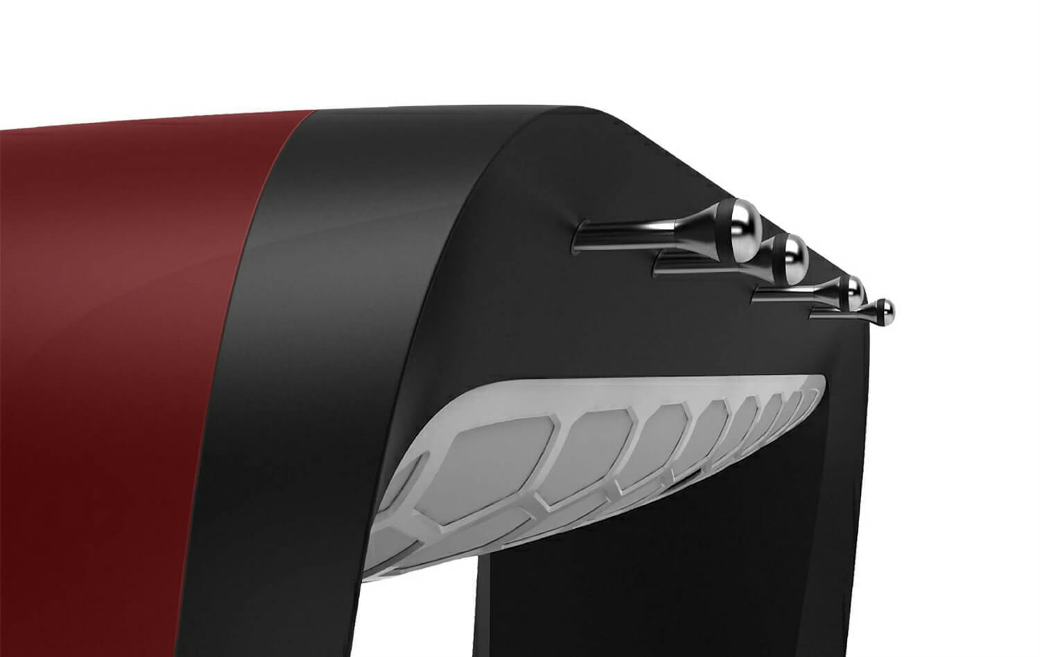 The Blackballs pitch is a tournament-sized Gerflex-coated playfield with chrome-plated, numbered aluminium players and 15mm smooth-rolling handles. Plant the football directly into the honeycomb-style brushed aluminium net and the electronic scoring system detects your goal. The centralised, discreet return directs the ball back to your basin out of sight.