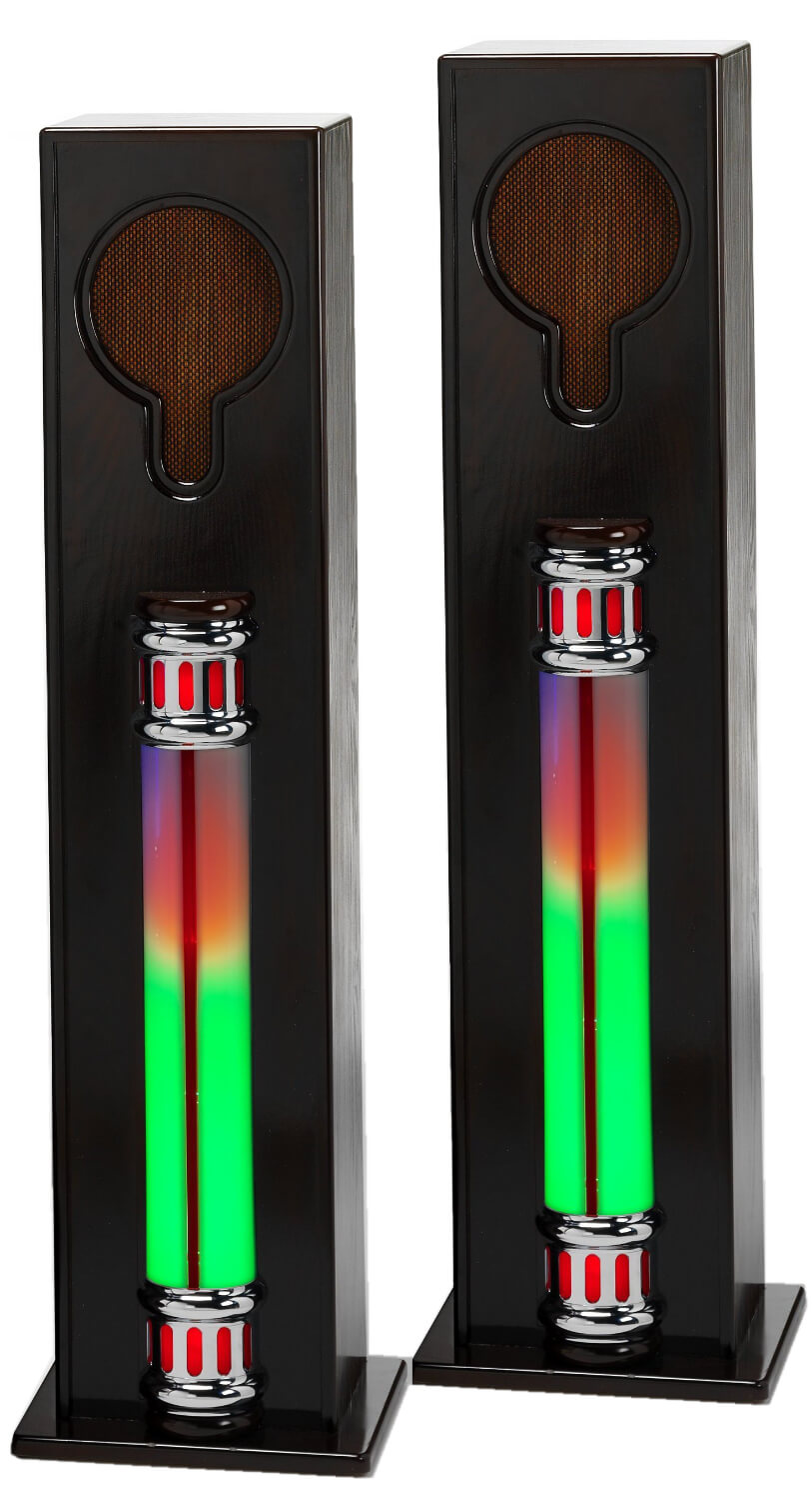 A set of floor standing extension speaker boxes that are compatible with Jukeboxes that have Extension Speaker Sockets! These speakers feature true stereo sound output, a light, dark or black wood veneer finish with Chrome trim and colour changing LED lighting with sound-to-light function when used with compatible jukeboxes.
