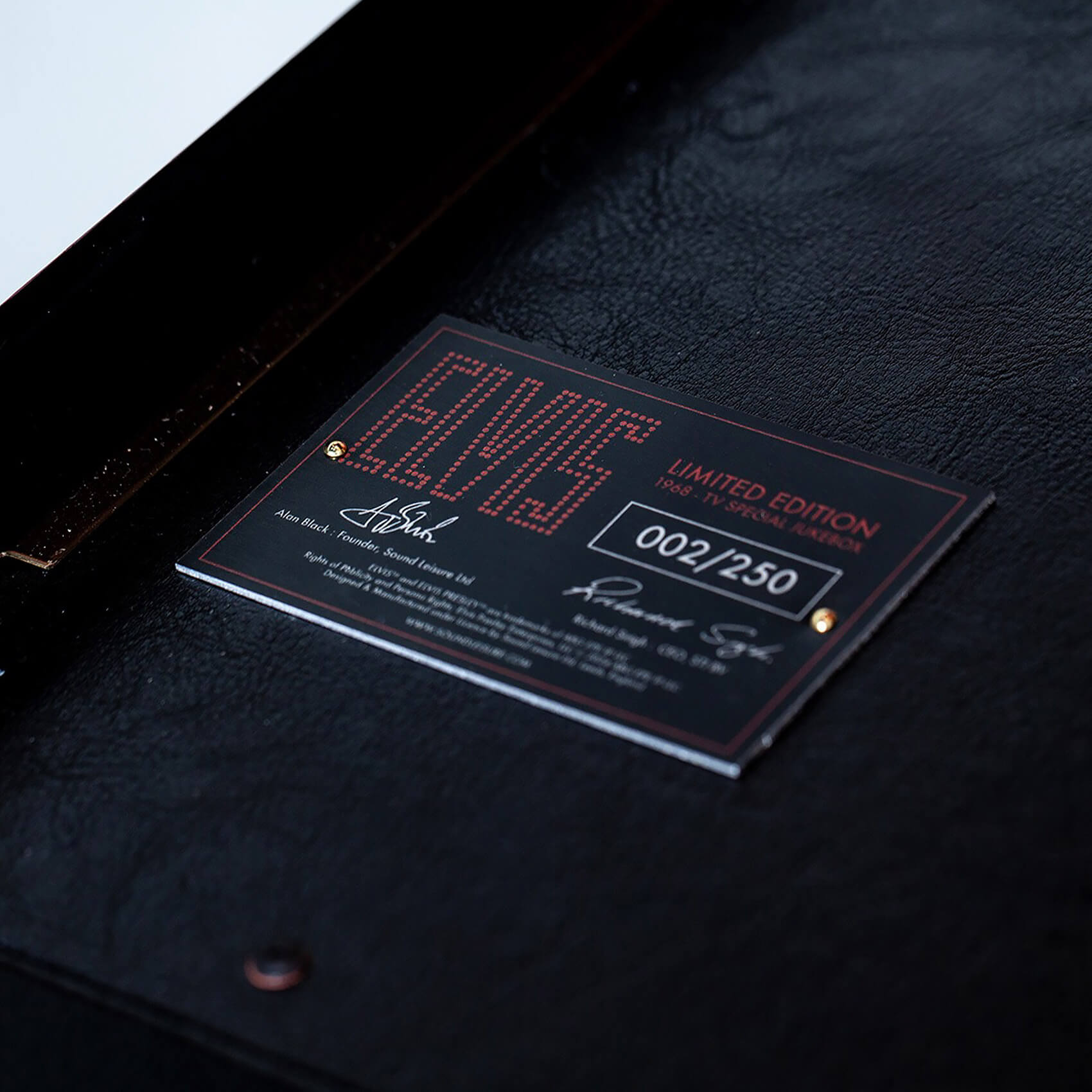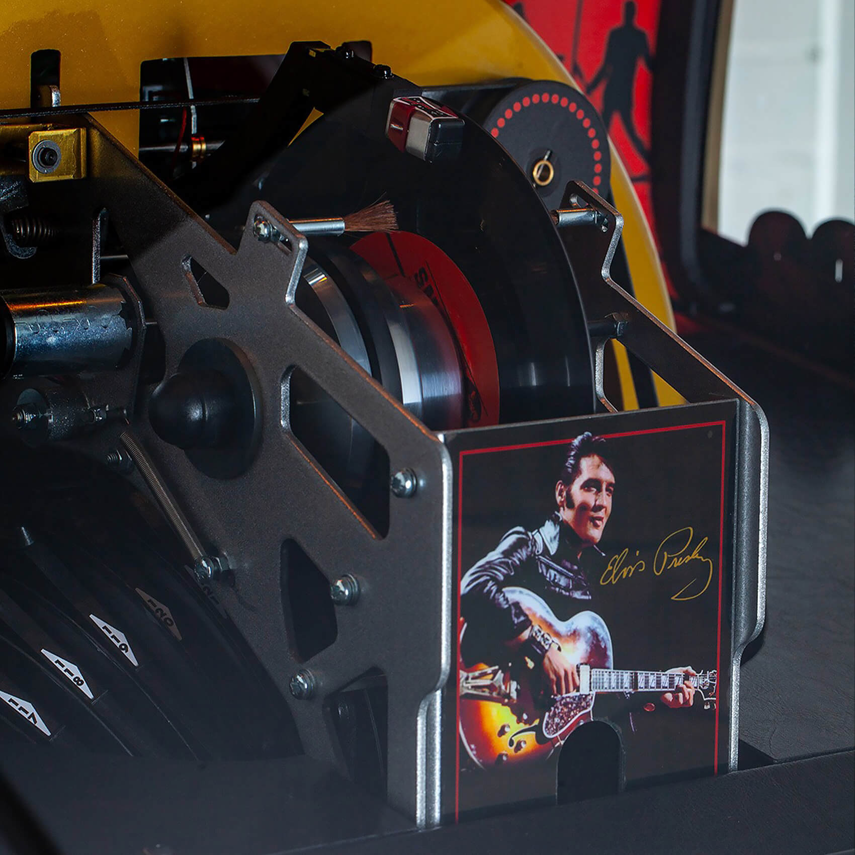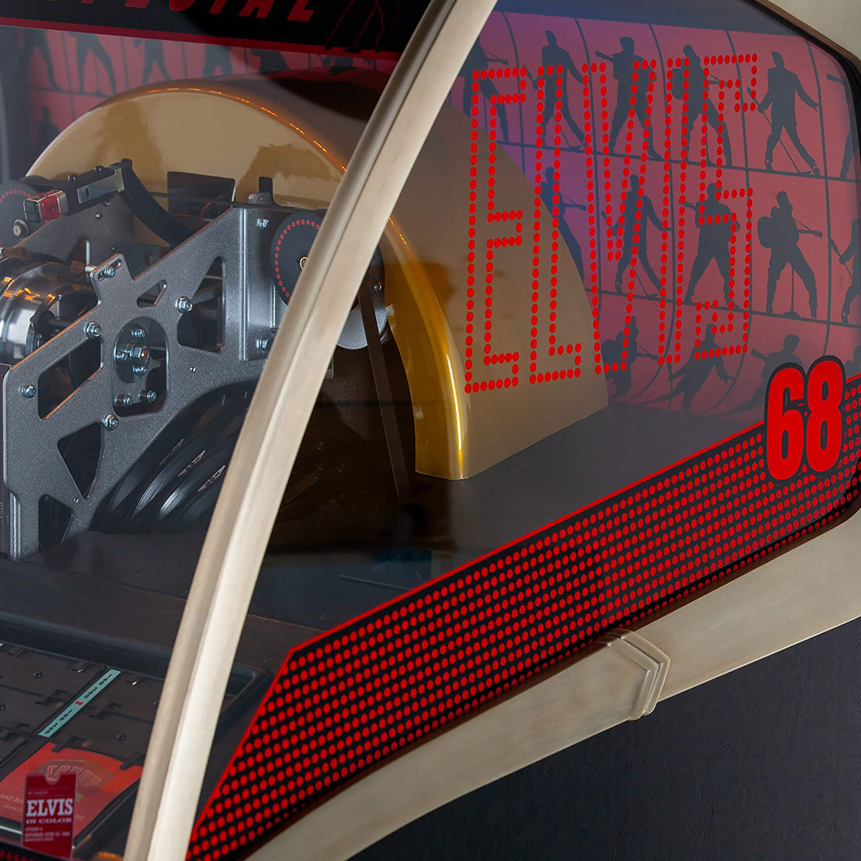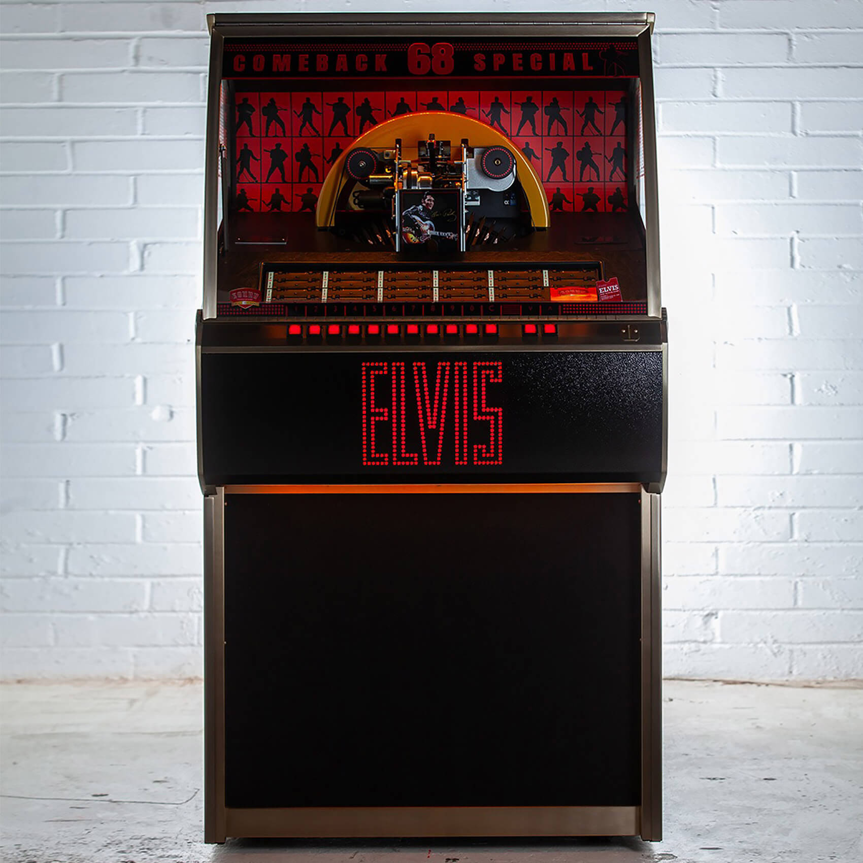 The 68 Comeback Jukebox is fully licensed and designed to pay tribute to “The 68 Comeback Special”. This electrifying 1968 television event marked Elvis’s legendary return to live performances after several years away from the spotlight. He mesmerised fans and showed off his smooth moves while wearing a sleek black leatherette outfit - and this iconic material is replicated on the 68 Comeback's cabinet panels!