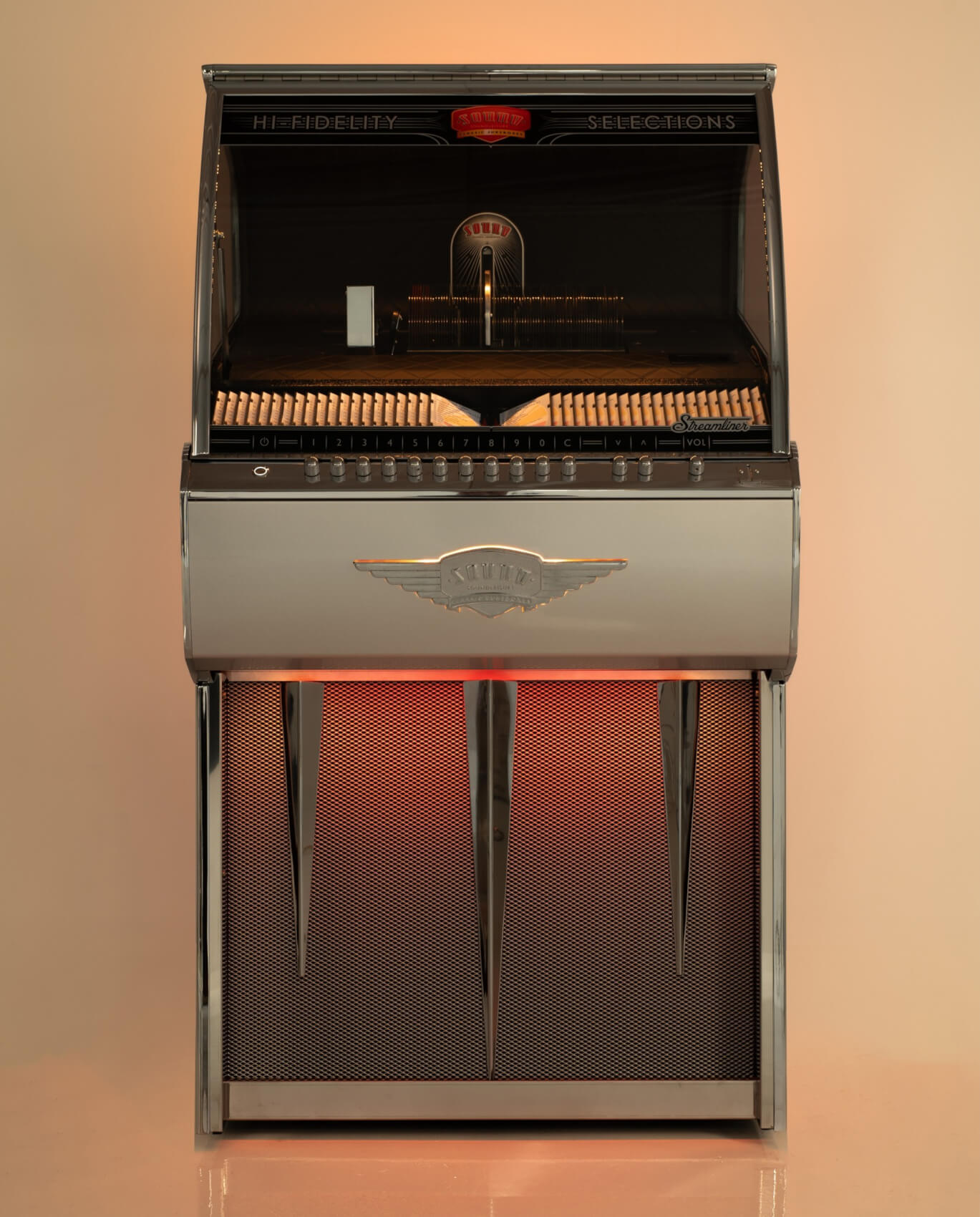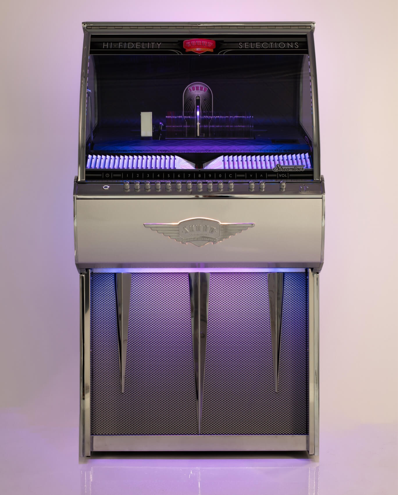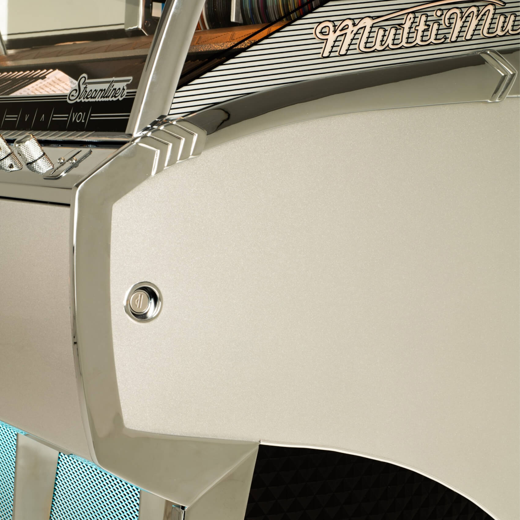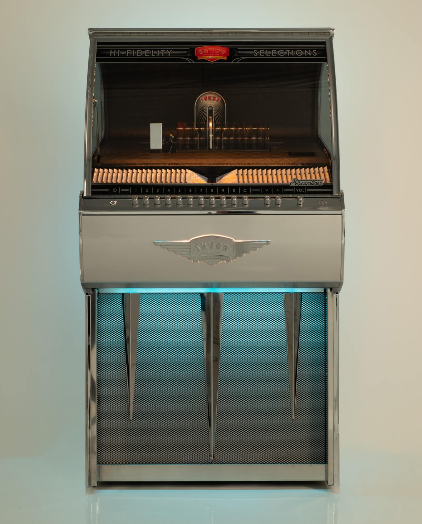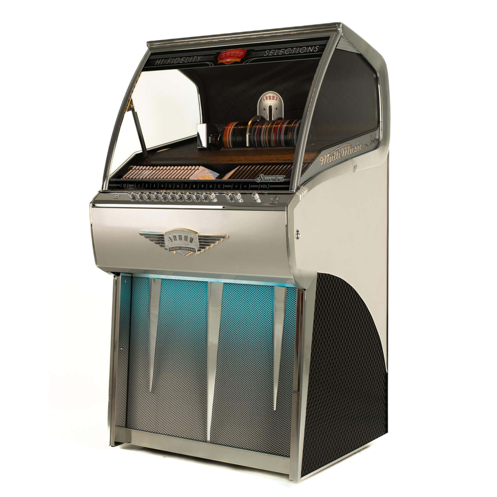 It features a deep gloss silver finish which is expertly created by priming, painting and polishing the cabinet by hand. The Rocket CD jukebox is fitted with high-quality aluminium trimmings, knurled aluminium control knobs and a stylish pyramid texture V-shaped grille base. All of these stand-out details come together perfectly to make the Rocket CD Jukebox a go-to centrepiece suitable for any home, office or hospitality space!