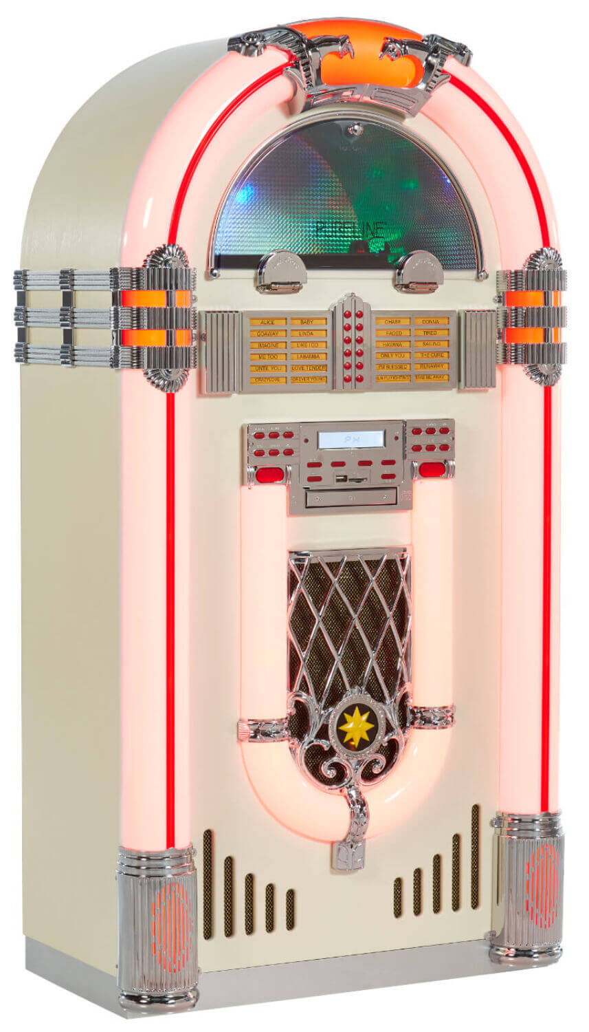 The record player, selectable for 33/45/78rpm records, forms the heart of the jukebox, and it sits on display behind the window at the top of the machine. This enables easy operation and is a great talking point - who doesn’t love watching a piece of precision-cut vinyl spinning away? CDs are inserted into a front-loading drawer, and track selections are controlled by the buttons on the front of the machine.