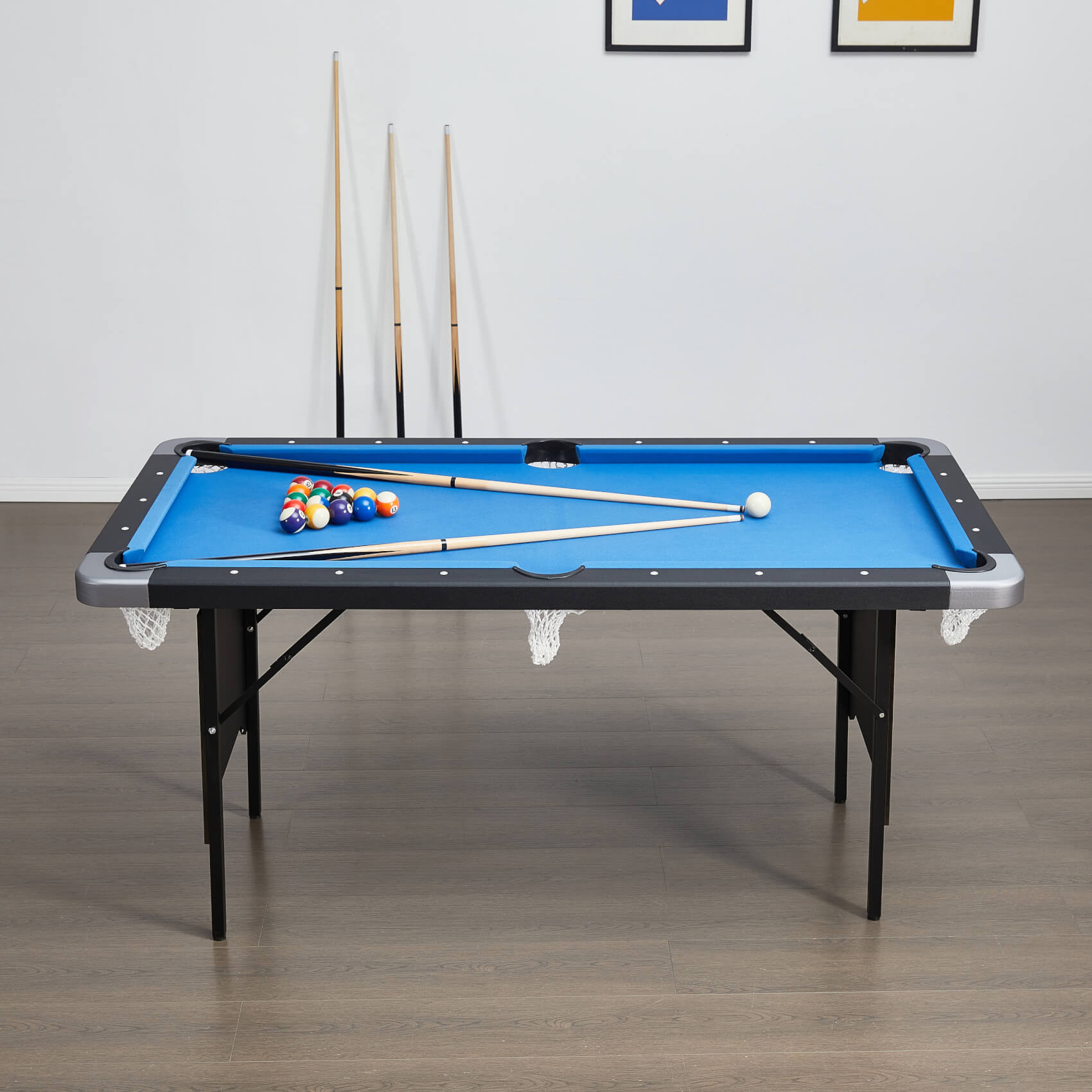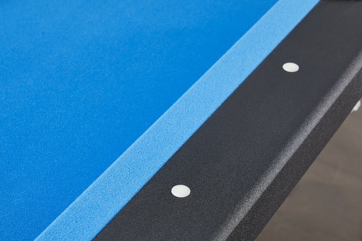 Responsive rubber cushions surround the playfield, which is clad in a striking blue speed cloth. Balls perform consistently and accurately, so you can learn and develop your game. Underneath the pool table bed, three metal supports keep the surface perfectly flat.