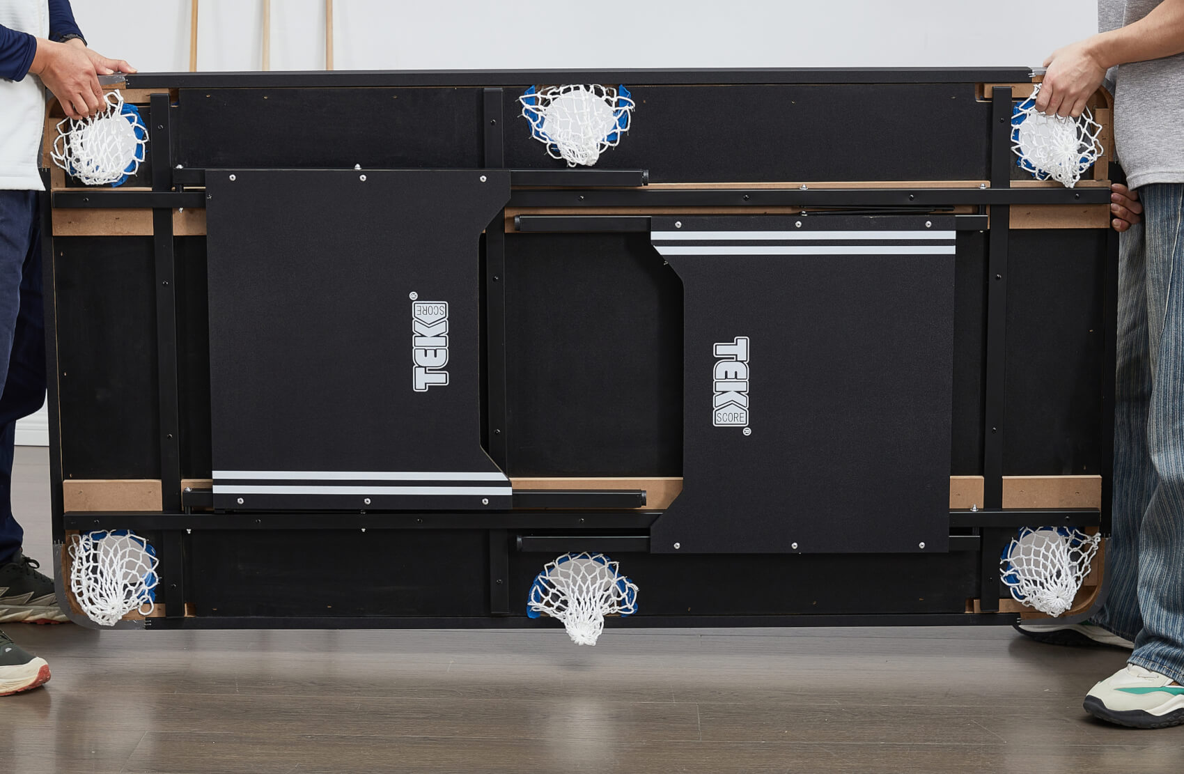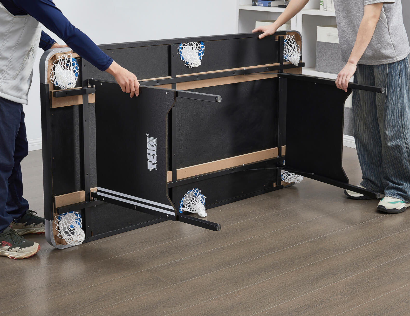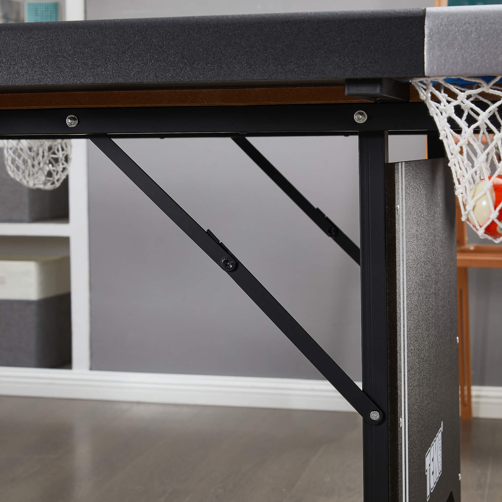 The Tekscore's folding metal leg structure and subframe provide excellent strength and durability. The table is heavy enough to keep it planted when in play. The feet are individually adjustable, so you can easily level the table when you set it up.