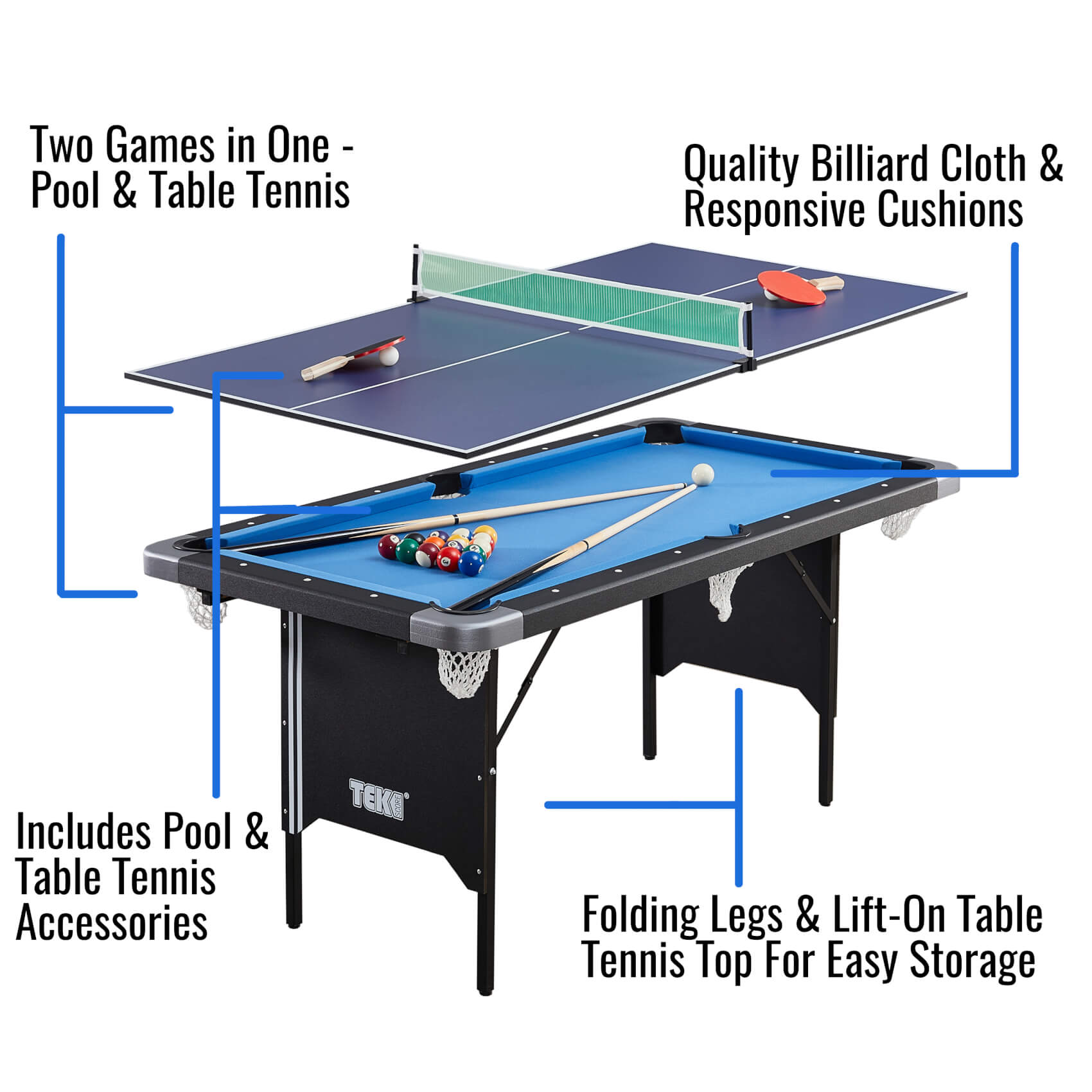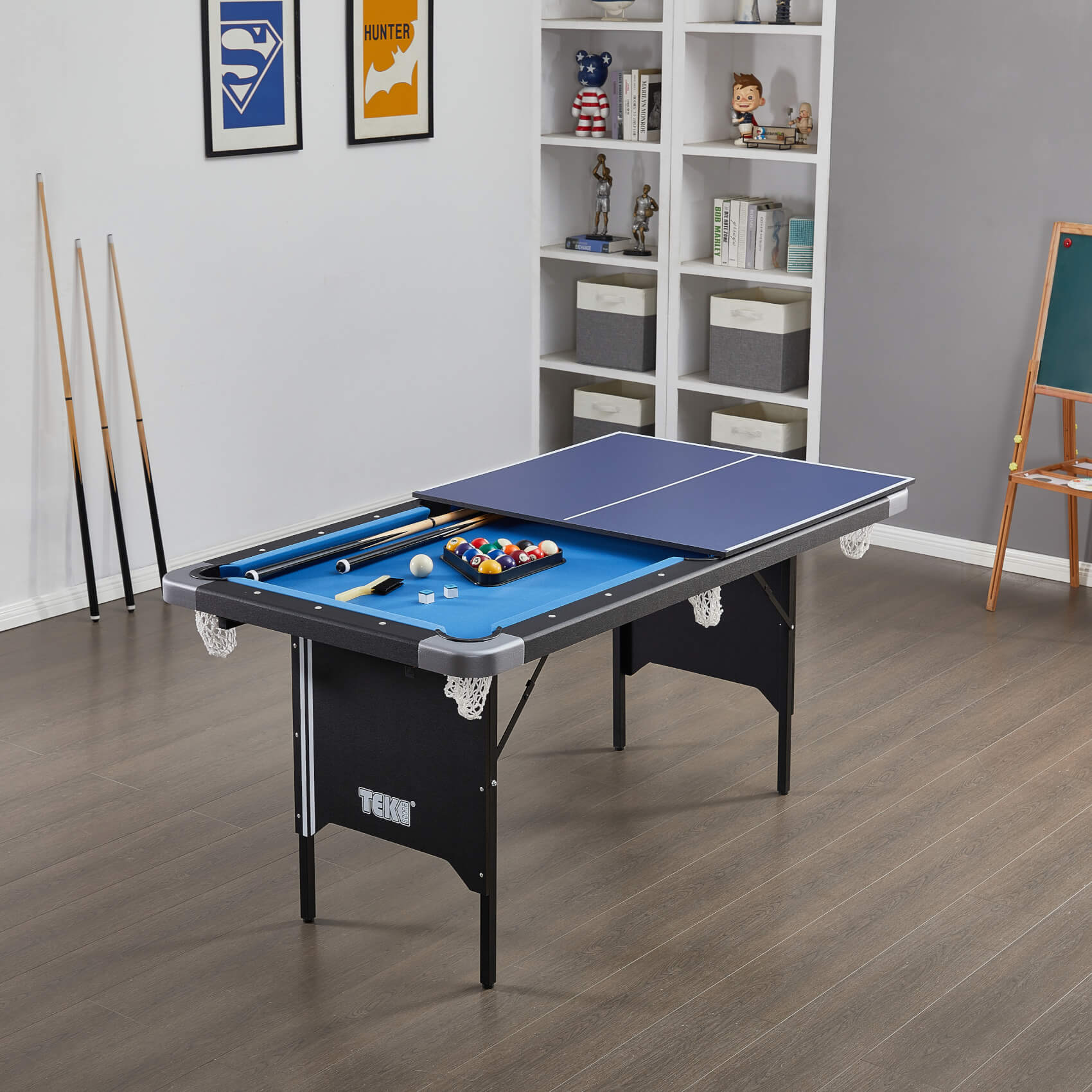 Featuring a sturdy MDF pool table and a table tennis top, the dual-purpose Tekscore can be folded up and stored away in seconds after use, so you can make the most out of the room that you have.