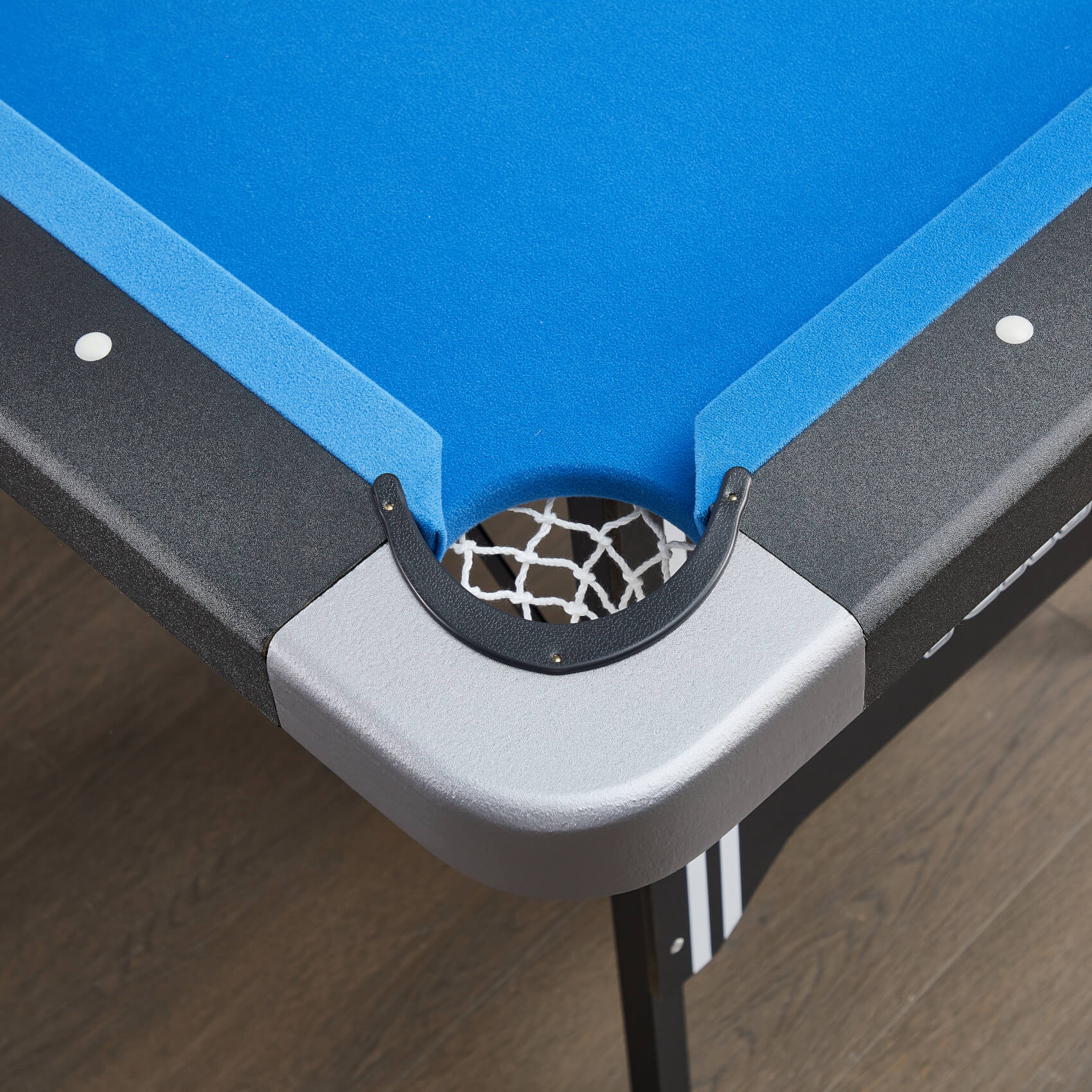The full size rail around the table gives plenty of room for cueing and is fitted with sights, which can be used to calculate shot angles and rebounds. Each drop pocket is fitted with a net.