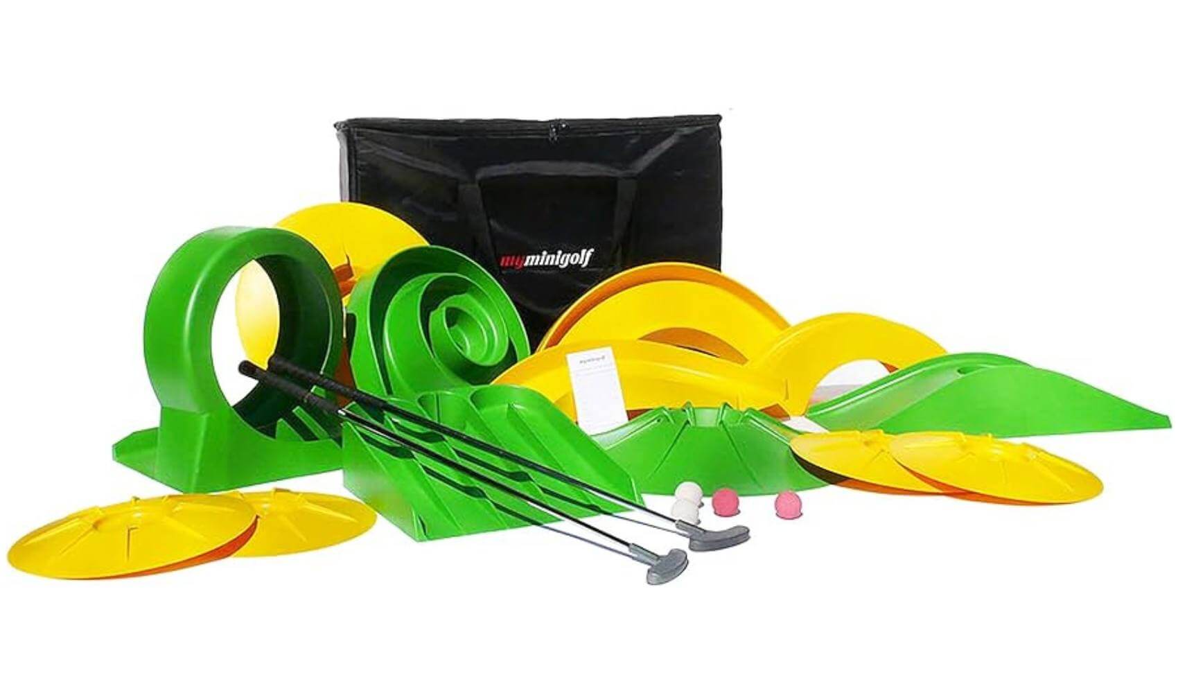 The Myminigolf professional mini golfing set includes everything you need to play. It's a fantastic choice for anyone looking to enjoy the thrill of mini golfing in a convenient and versatile package. This strong, durable and compact set offers convenience, longevity, and versatility, making it an excellent choice for mini golf enthusiasts.