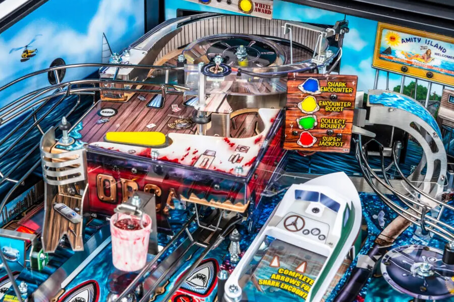 It's Stern's most impressive playfield yet! Take your pick of the interactive, moving playfield models, using the ramps and wireframes to move around. Try the Ben Gardner's Boat captive ball with its three optical sensors, and trigger the automated Great White Shark that breaks through the boat! Hit the Chum Bucket Newton ball, and target the moving Shark Fin that traverses right across the playfield. Strike the Orca Barrel, the Fish Finder targets and so much more as you build your score and battle the biggest fish of all!