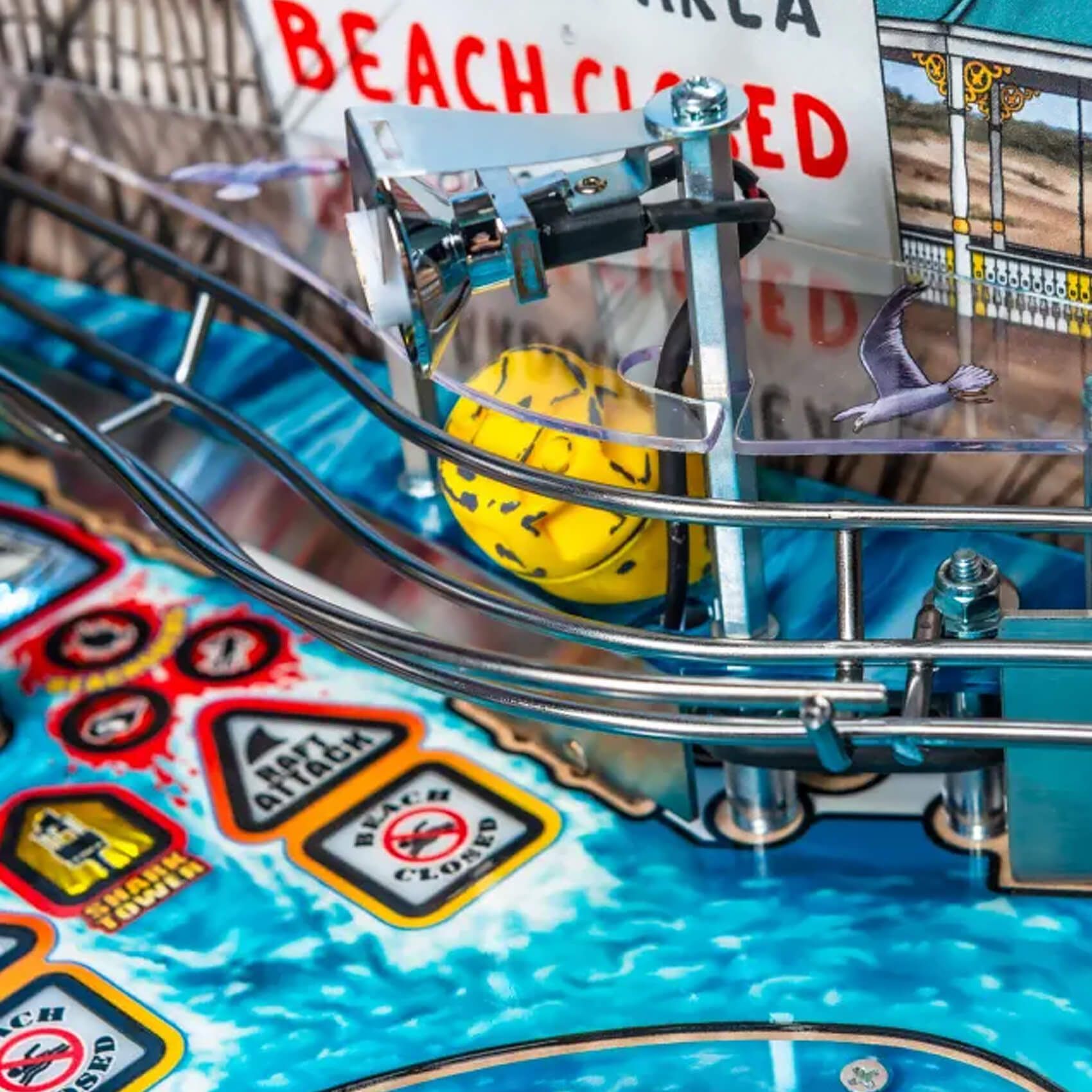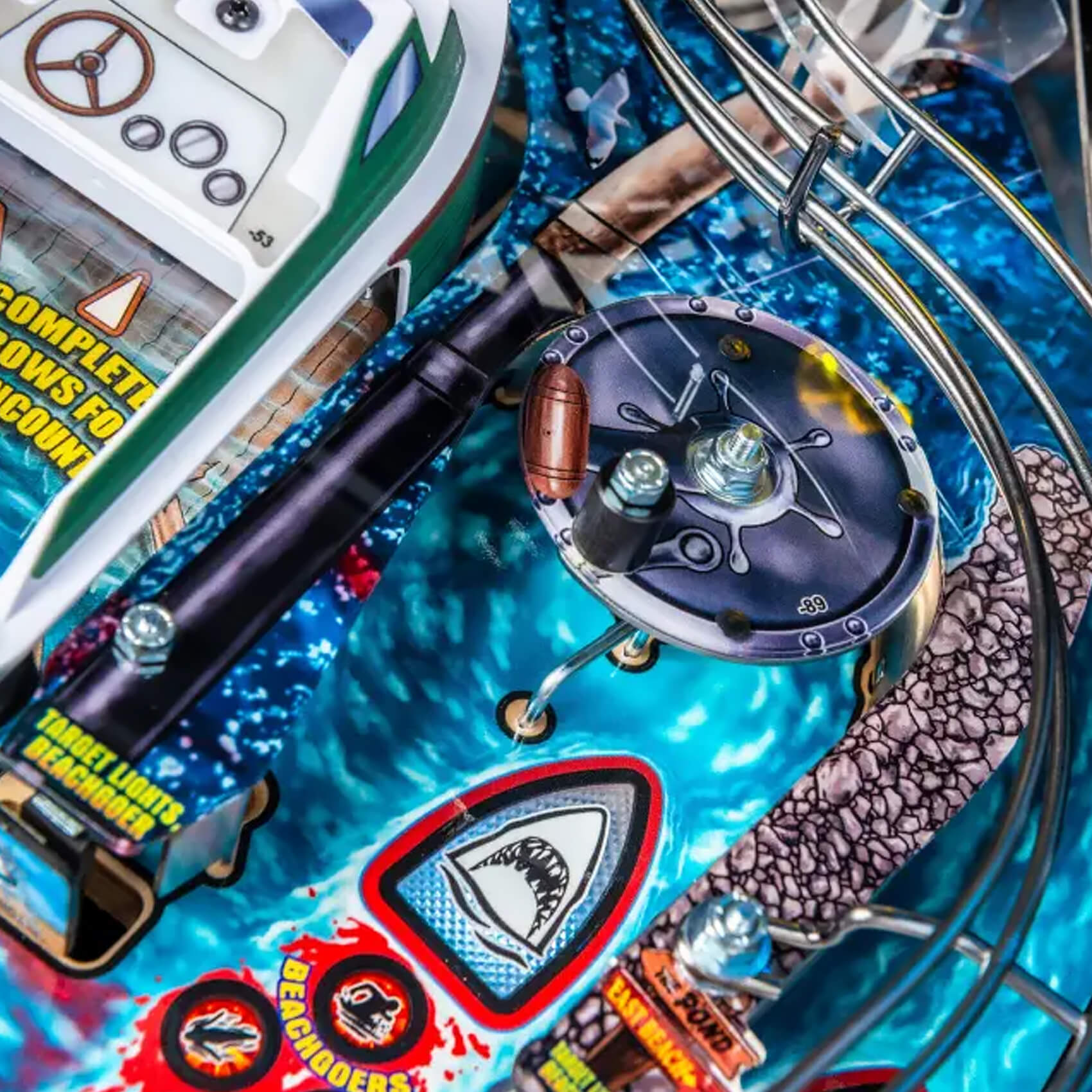 Use the Wave ramp to fire your shots up and into the secondary upper playfield, themed on the Orca boat itself. Up here you'll discover a Lookout Tower and a reverse 180 wireform ramp return, plus a Ship's Wheel spinner and a Radio stand-up target. Jaws LE really does give you - literally - the most immersive pinball experience!
