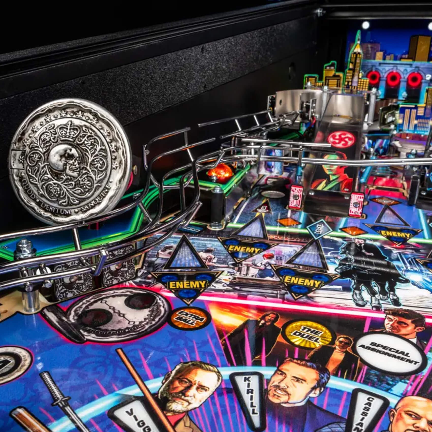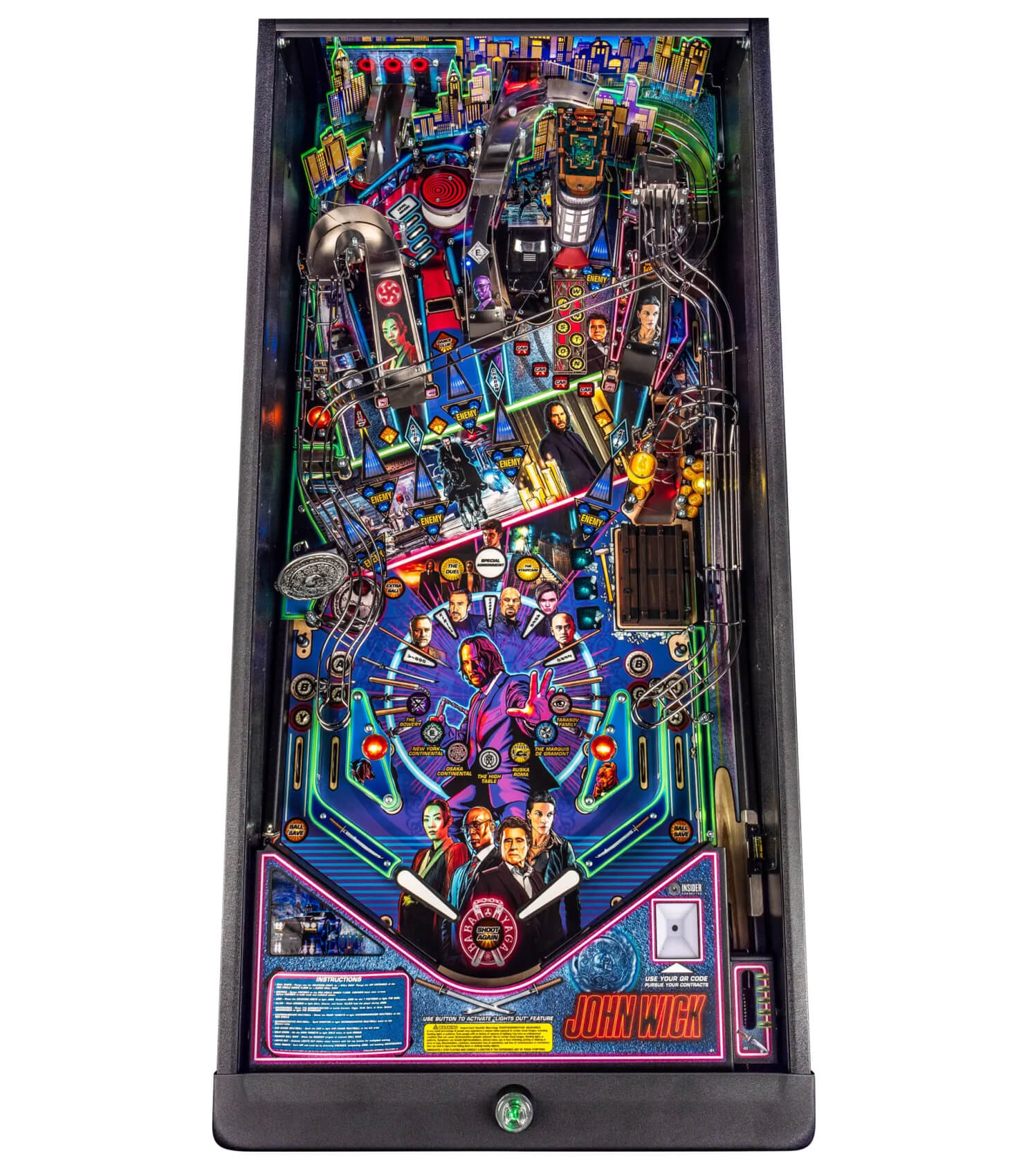 The playfield is a wizard's delight of targets, toys, shots and features. Check out the muscle car - hit it with an orbit shot to watch it drift and start the multiball mode! Or hit the Blood Oath Marker, with its special 'Reveal' feature and backlit fingerprint illuminations. Strike the Weapons Crate to access weapons and missions and discover the secret shot! Or go for the large Continental Hotel with its captive ball target.