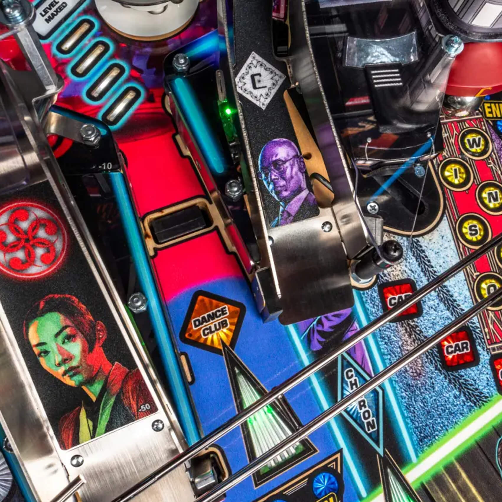 Elevate your game with the three ramps, each complete with a return wireform feeding back to the flippers. Fill the Red Circle lock with three balls, or access the Red Circle Club itself via the selective drop target entrance. In here is a special small arena complete with slingshots, pop bumper and the chance to boost your score even more! There's a reverse eject scoop too, and more targets than you can shake a Glock 34 at.