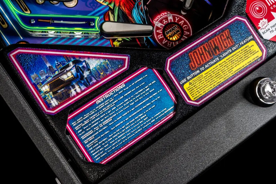 The cabinet is beautifully decorated in custom artwork designed by Randy Martinez. It shows the New York Continental Hotel, John Wick himself, and various enemies and allies too. The translite follows the same theme, and below this is the video screen, where in-game events are illustrated on the video screen using real cut-scenes from the movies. Stereo speakers are driven by a three-channel amp, creating atmosphere with the special Charlie Benante soundtrack and Ian McShane custom speech clips.