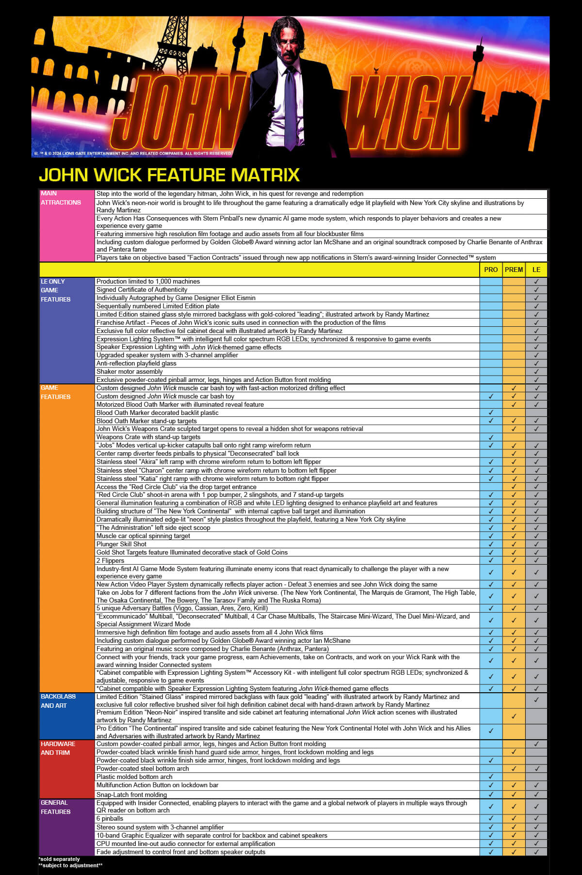 The Premium features more immersive playfield features and different artwork, whilst the LE is the most collectible of the three, with upgraded lighting, sound and machine components. It's also limited to a production run of 1,000, making it the only choice for true John Wick aficianados! Check out all the other editions below, and look at the Features Matrix here to see all the differences in detail.