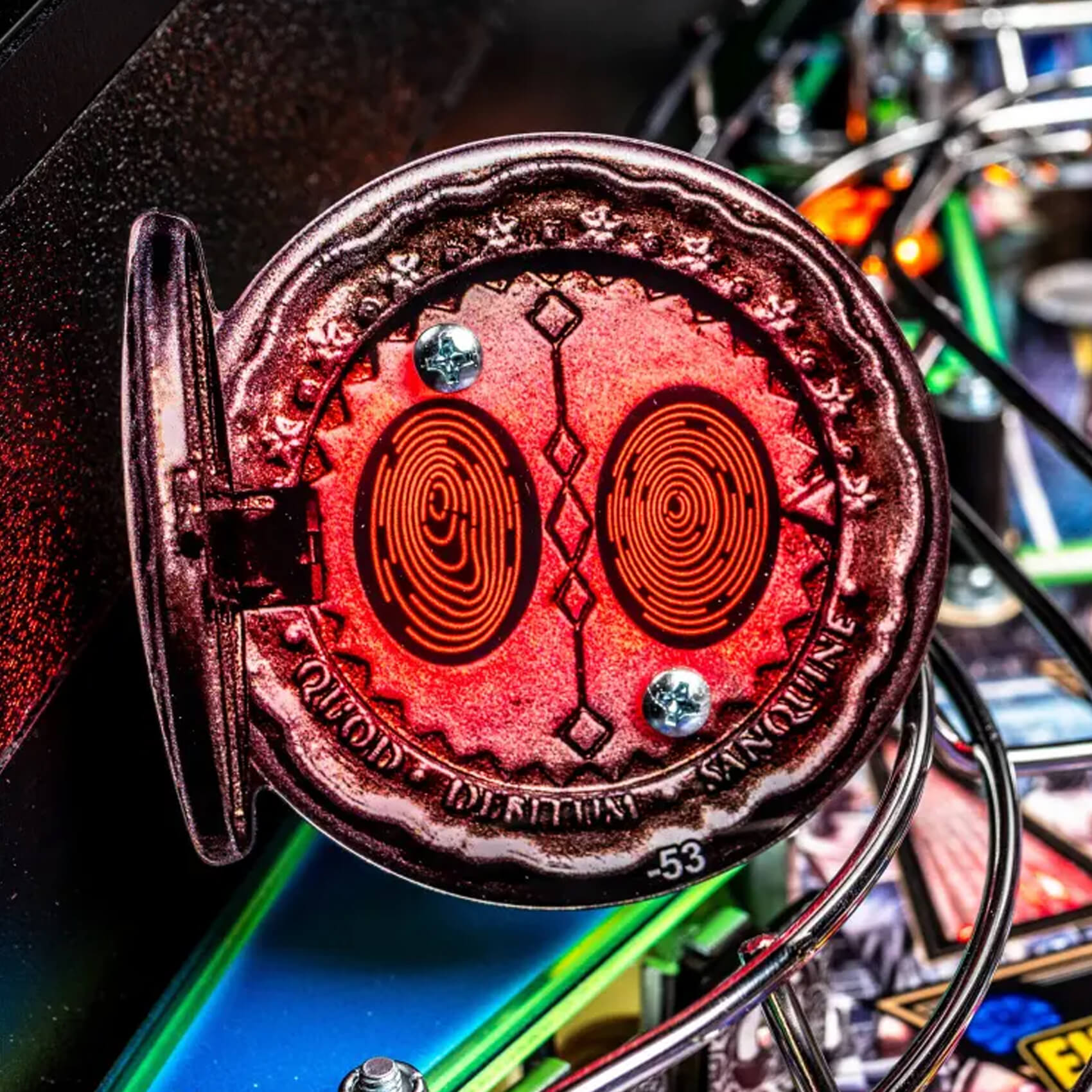Interact on the playfield with the muscle car bash toy, Blood Oath Marker, Weapons Crate stand-ups and so much more. Use the up-kicker to catapult the ball onto the wireform return, and target the three ramps - Akira, Charon and Katia - to feed the ball back to your flippers. Access the Red Circle Club mini-arena, complete with stand-up targets plus two slingshots and a pop bumper.