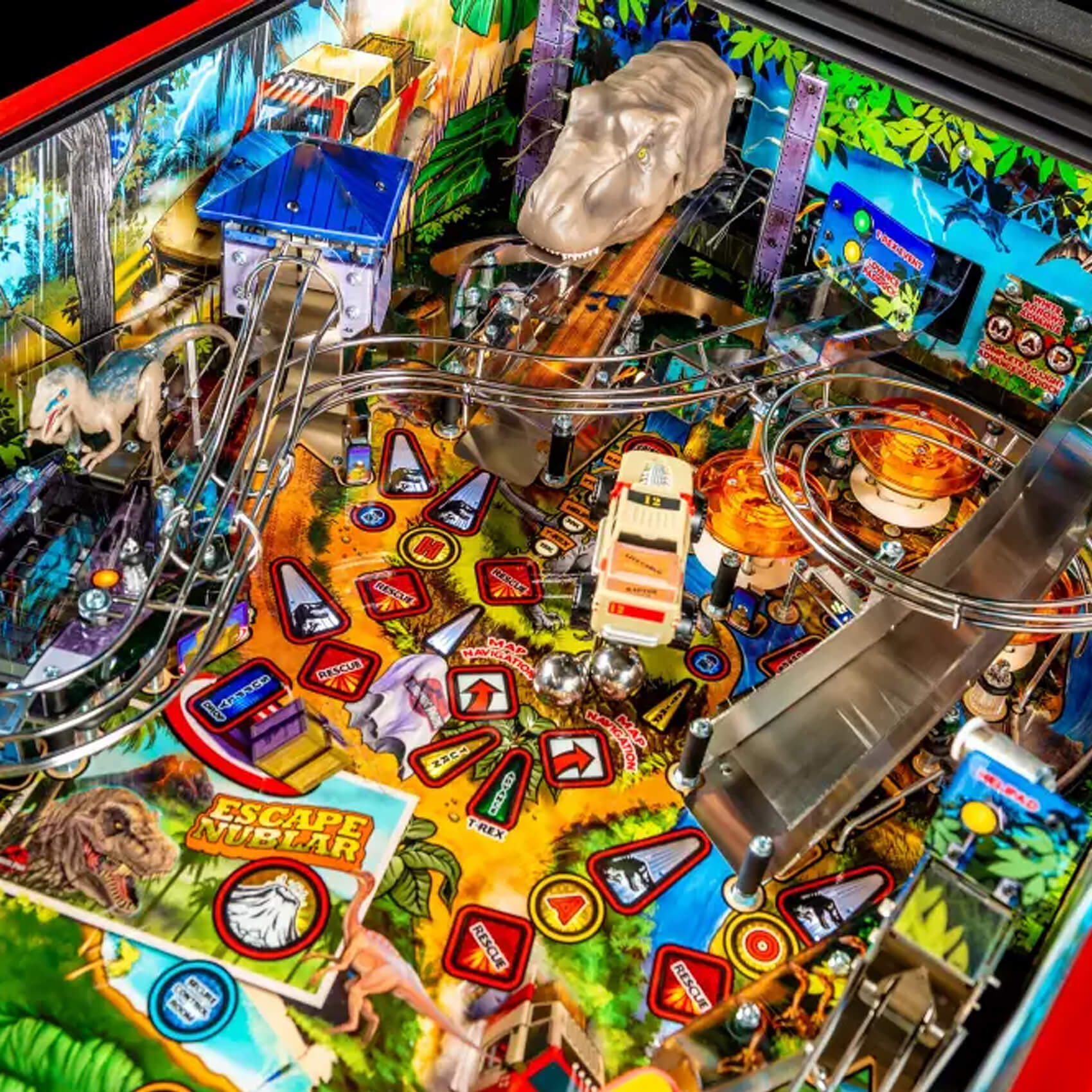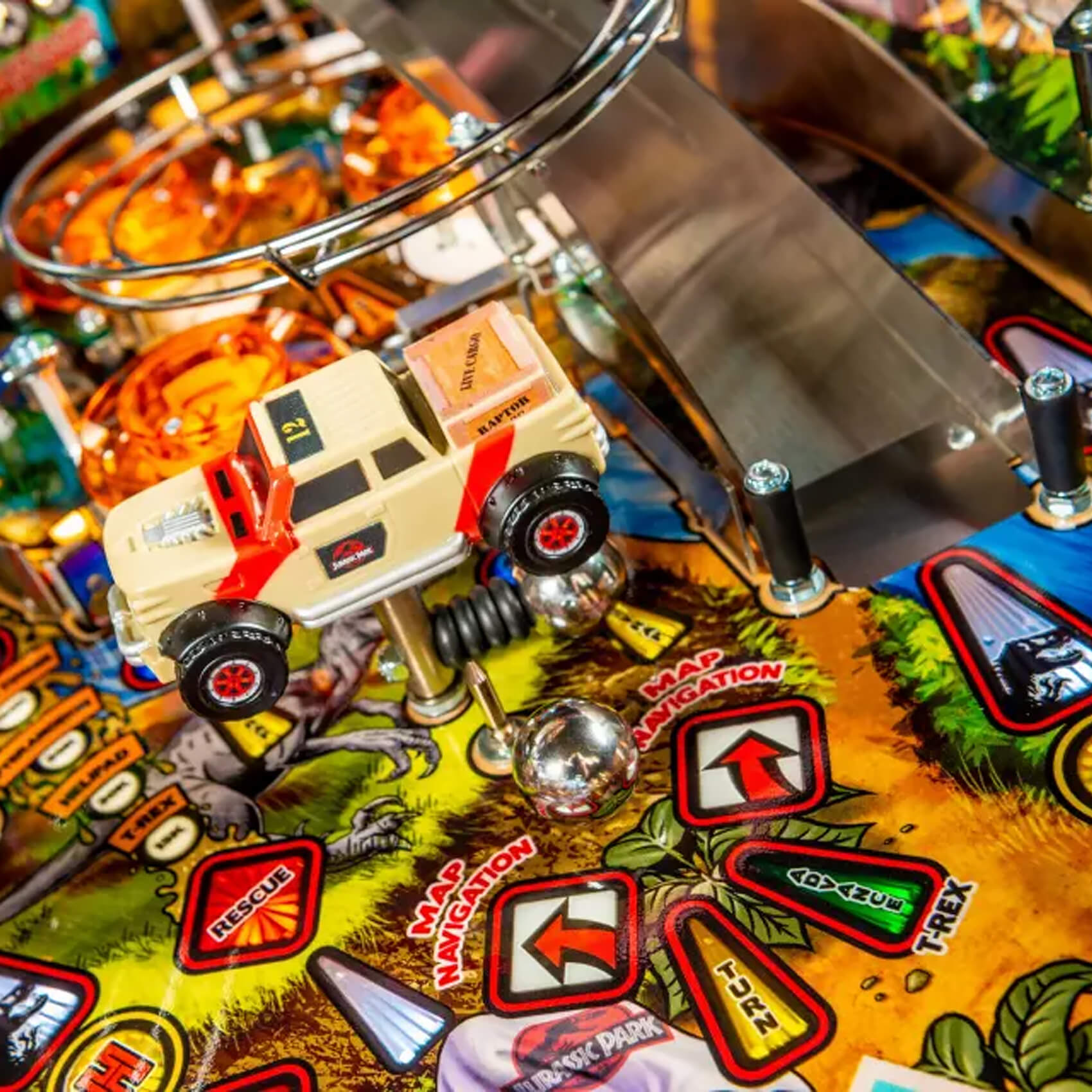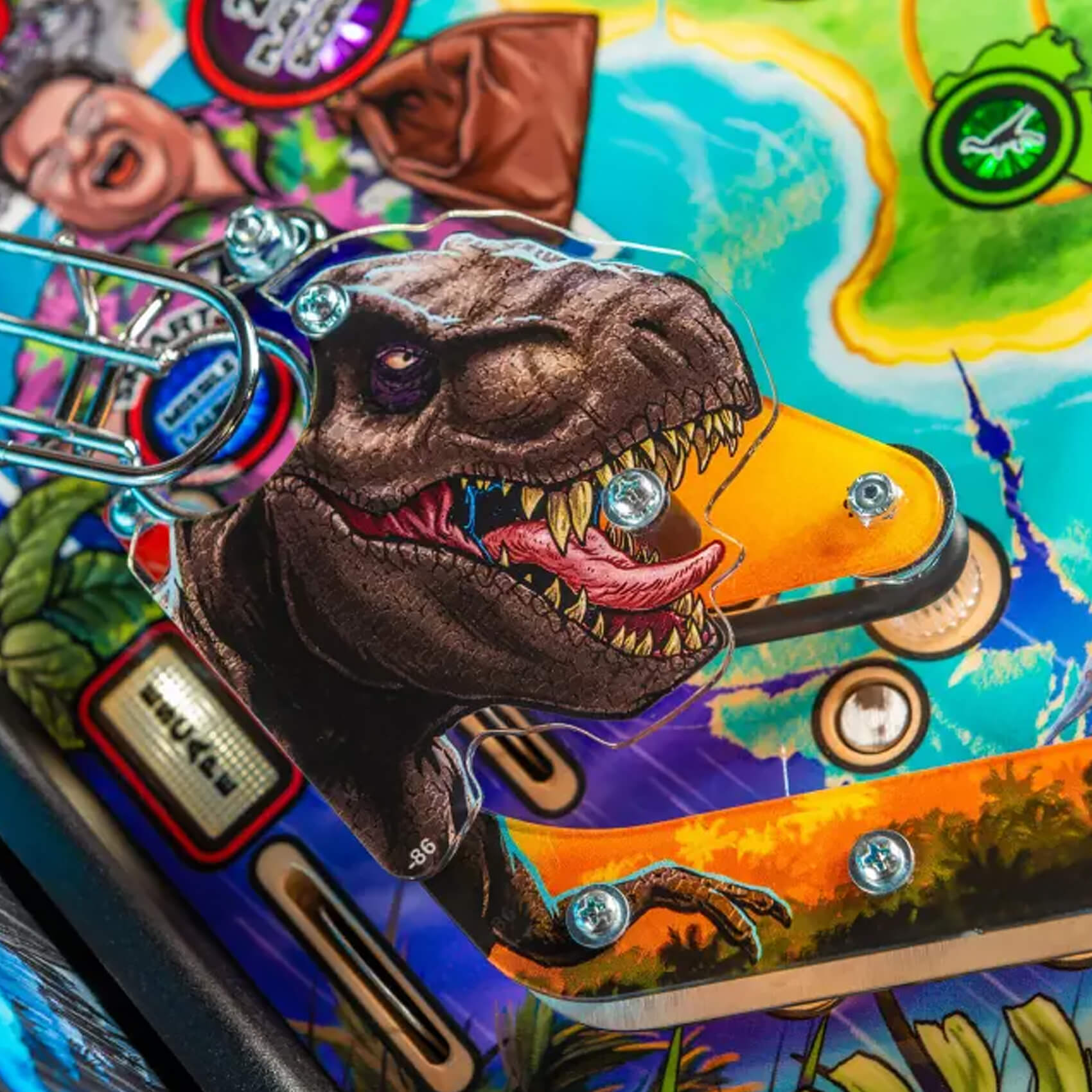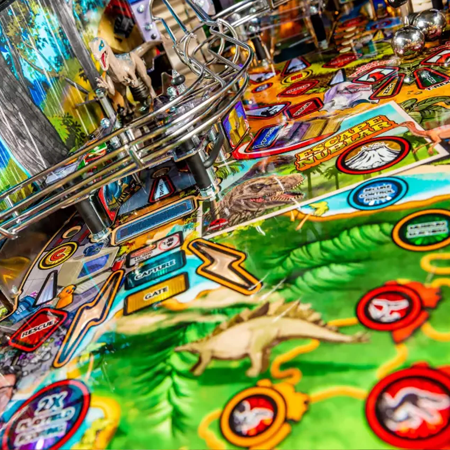 A paddock map and a detailed mode system engineers longevity into your games for many years to come. Score on the three mini jackpots and reach the super jackpot, or unlock the four Multiball modes (T-Rex, Raptor Tri-Ball, King of the Island and Chaos) with up to six pinballs on the playfield at once!