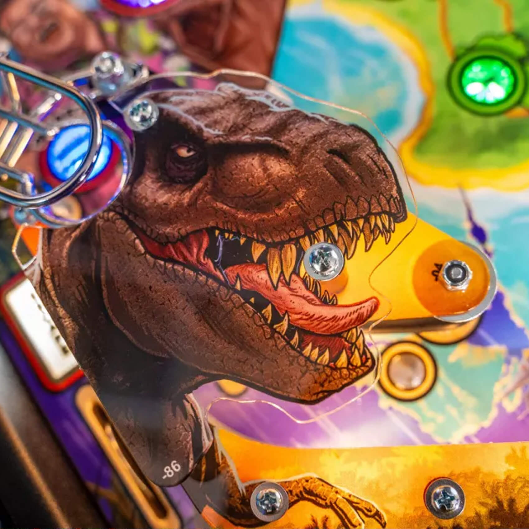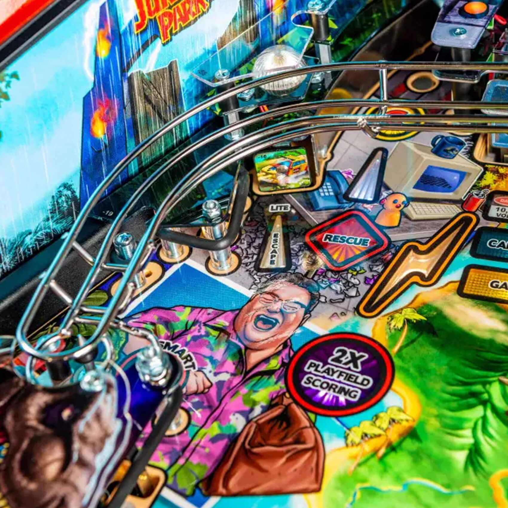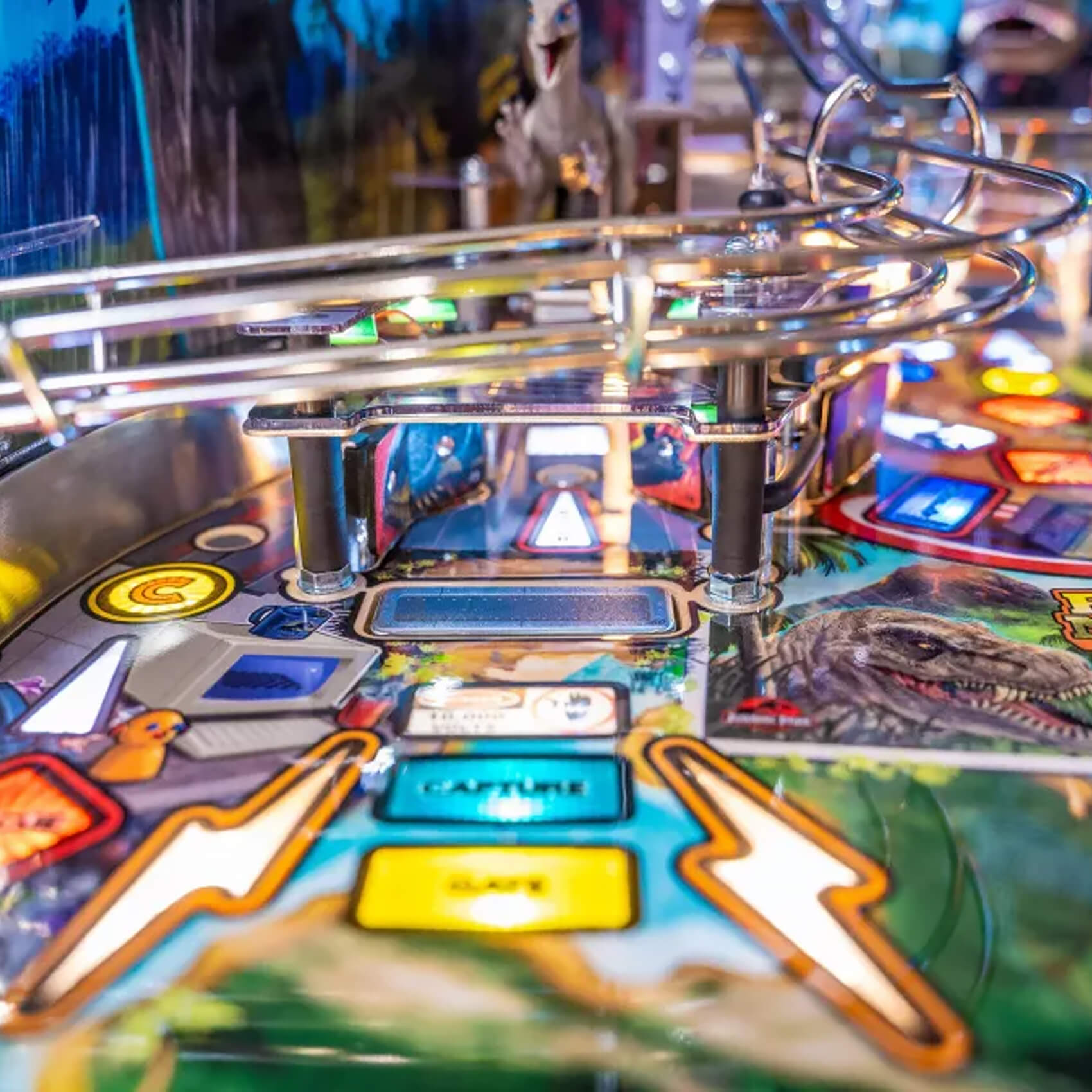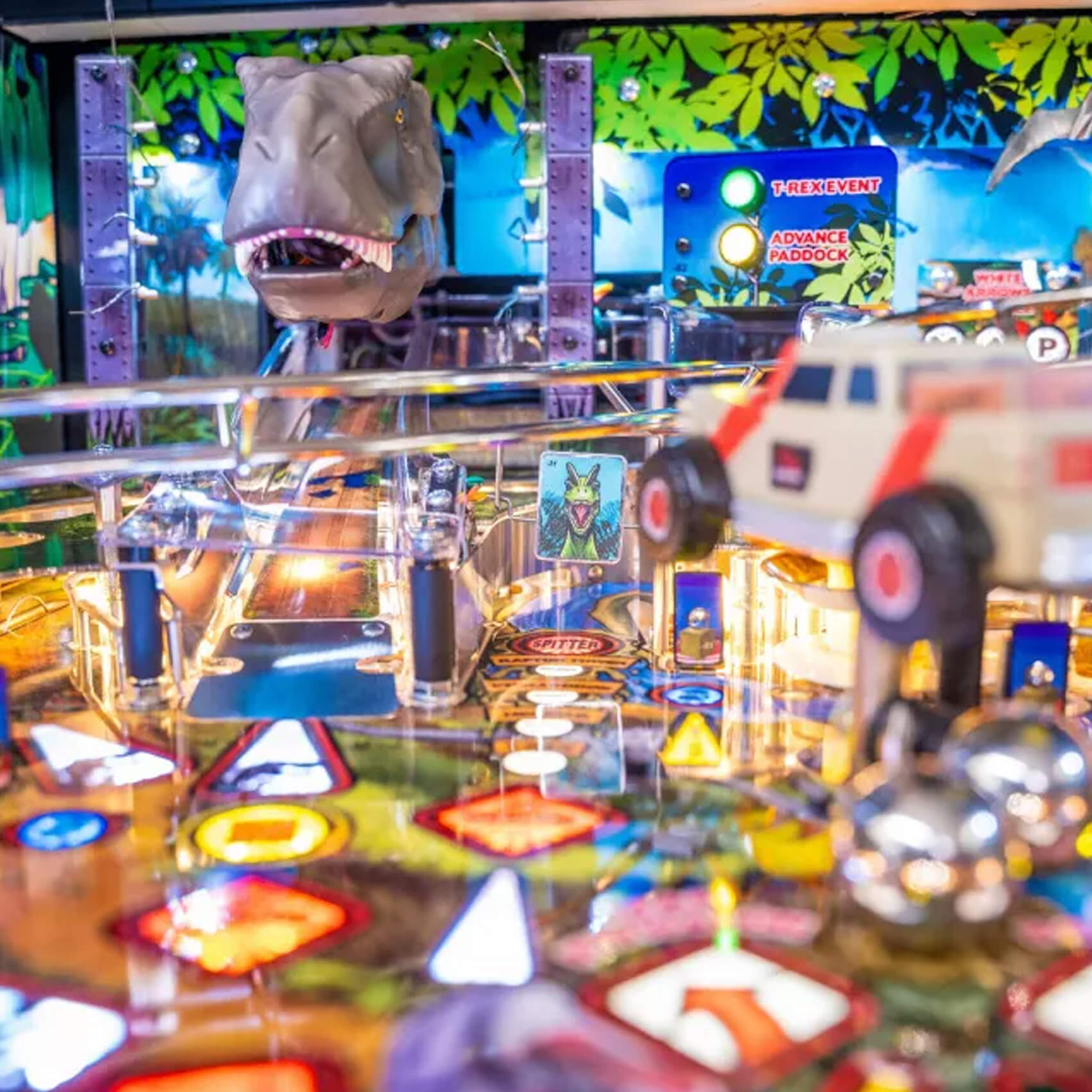 A paddock map and a detailed mode system engineers longevity into your games for many years to come. Score on the three mini jackpots and reach the super jackpot, or unlock the four Multiball modes (T-Rex, Raptor Tri-Ball, King of the Island and Chaos) with up to six pinballs on the playfield at once!