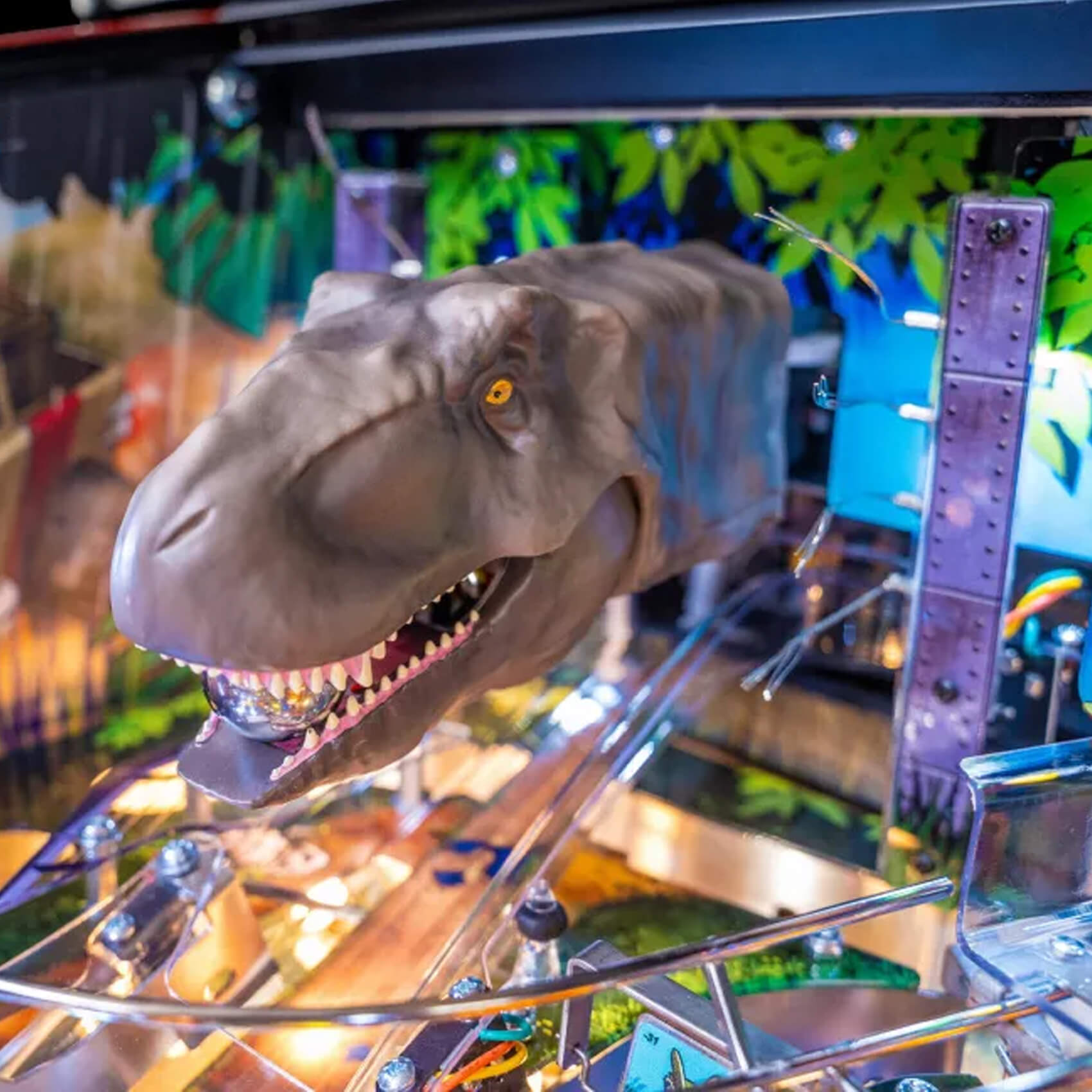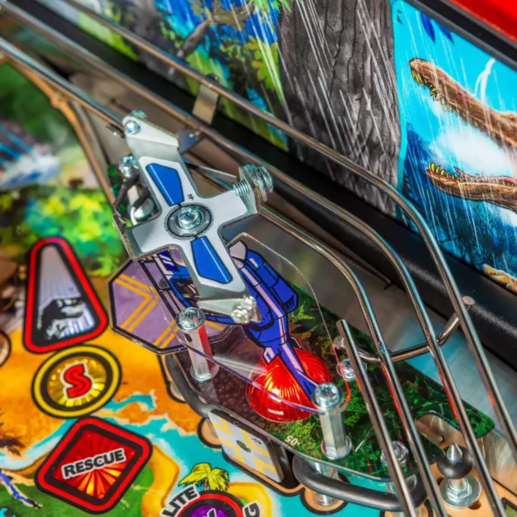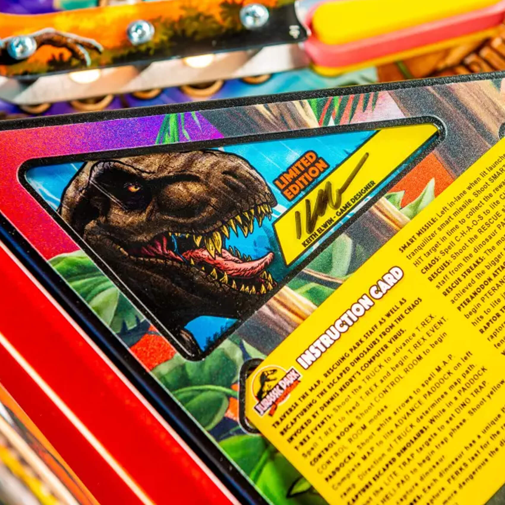 With a playfield left mostly unchanged from the original LE, the gameplay is just as exciting as ever! It's a three-dimensional riot of targets, ramps, wireforms and reactive, moving features, like the T-Rex head that catches and throws pinballs right across the board! Add in the helicopter blade spinner, the amber mosquito pop bumper cap, the motorised velociraptor that lunges at your pinball as it passes, and you'll know what it feels like to be in the jungle!