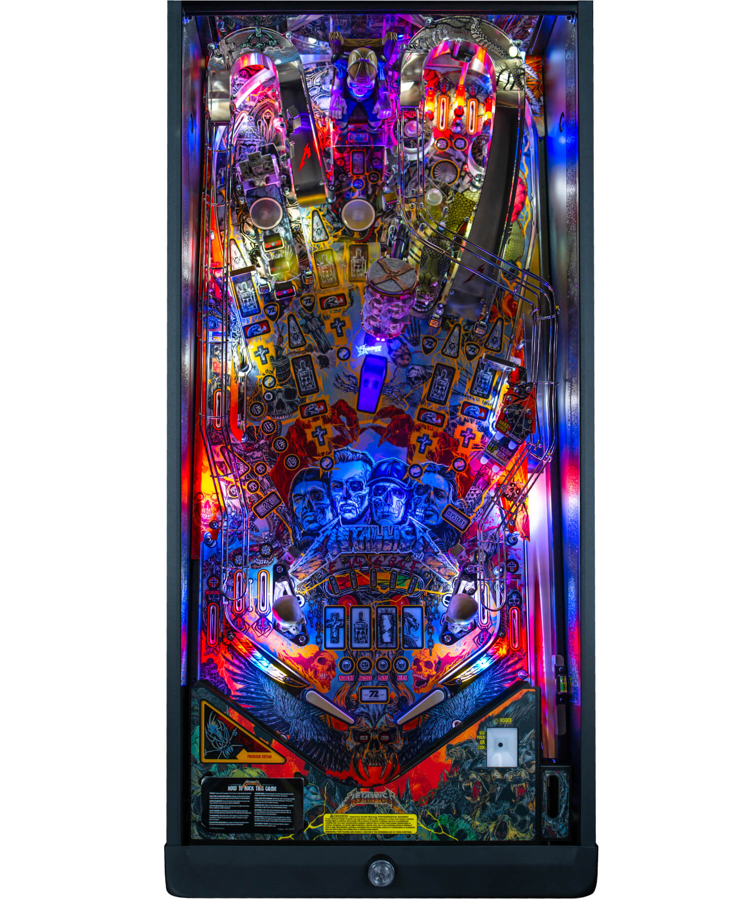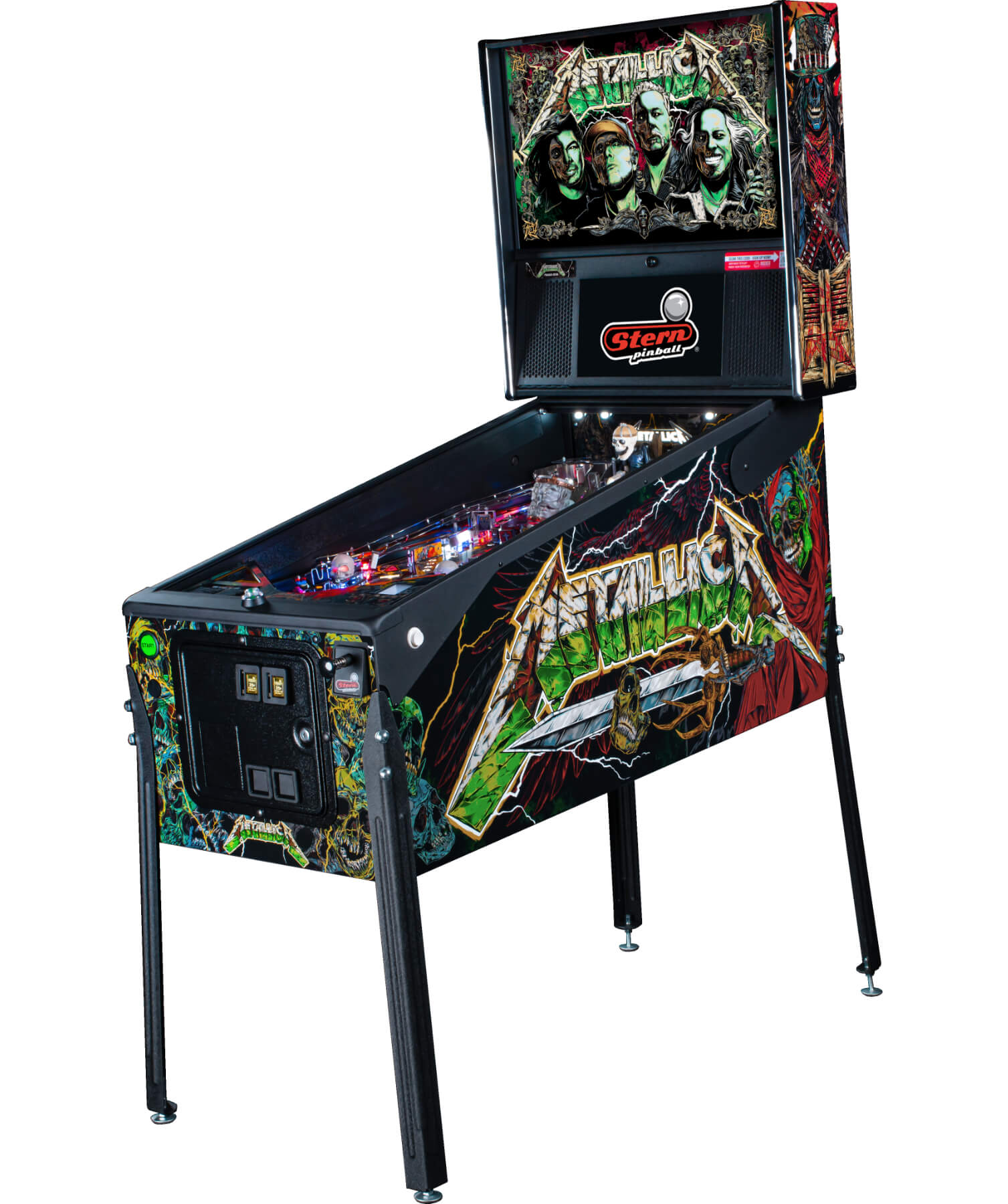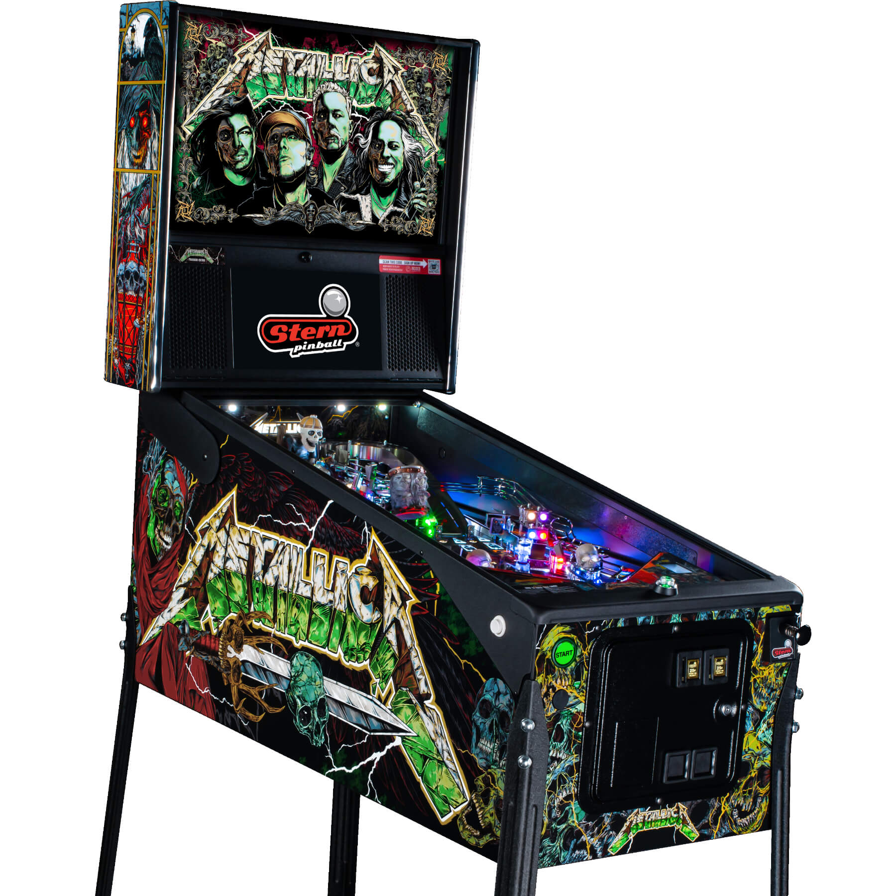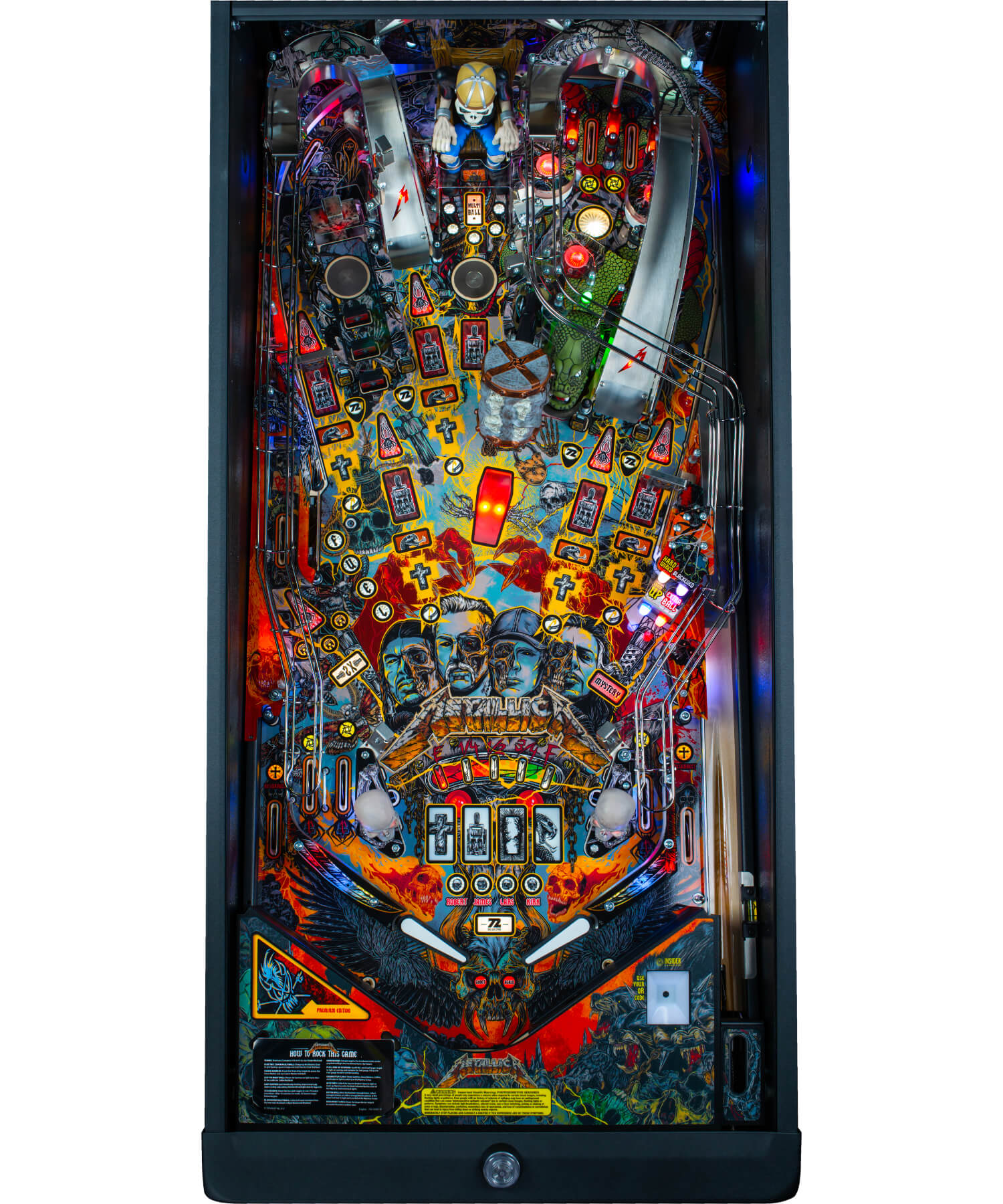 The Remastered Premium is resplendent in all-new high-definition graphic livery, especially drawn for the machine by Metallica's own artist, Rhys Cooper. The translite art crowns the machine with gorgeous artwork, also by Cooper. The cabinet is protected by black powder-coated armour on the sides, hinges, lockdown bar and the legs, plus a steel bottom arch and a Snap-Latch front molding, making internal access super-easy. The sound is important on a Metallica-themed machine and the Remastered Premium doesn't disappoint, with full stereo sound through a three-channel amp, with 10-band graphic EQ, fade adjustment and a line-out - so if you really want to max out that powerful soundtrack, you can hook it up to your own home audio setup!