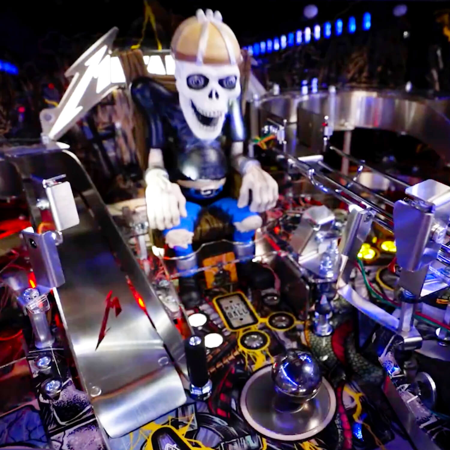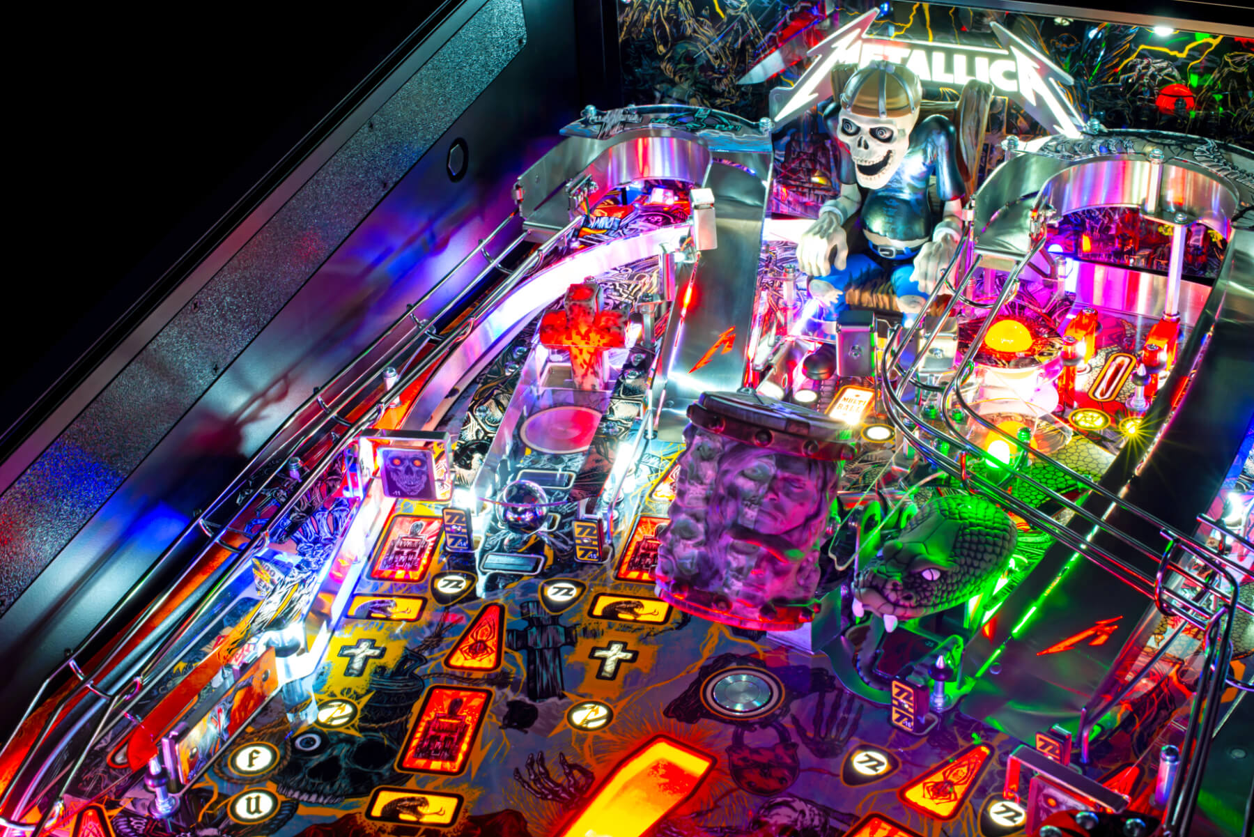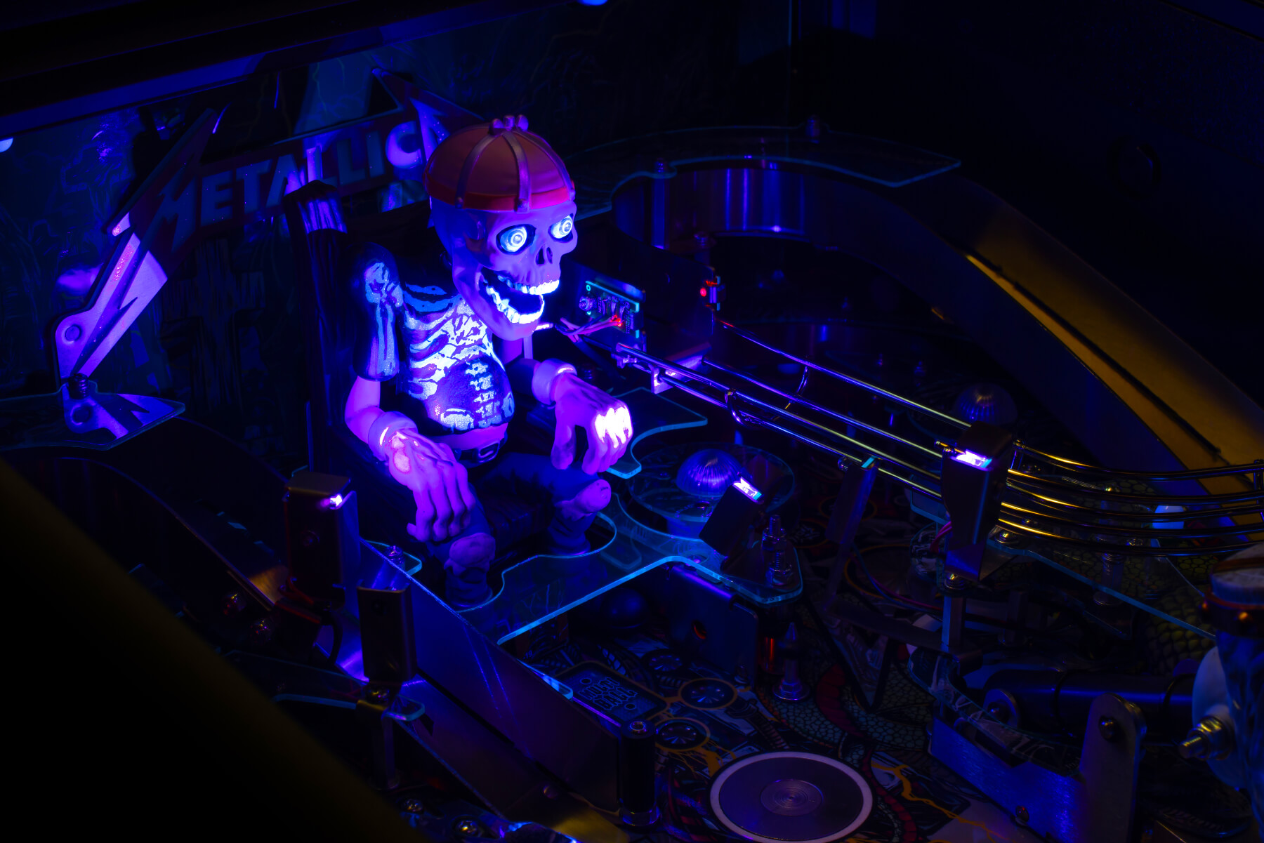 Wherever You May Roam on this exciting, upgraded playfield, you'll be amazed at the depth of playability and the immersive interactivity of sculptures, targets and more. Sparky's Electric Chair is fully articulated and responds to ball strikes. Electrocute him and watch spectacular UV lightning effects ripple through his body! Target the Master of Puppets Grave Marker targets and watch as the magnet seizes your ball and throws it across the playfield! Witness the all-new Gavel dispensing Justice For All, smashing your ball down into an underground Coffin ball lock - that's visible through the playfield!