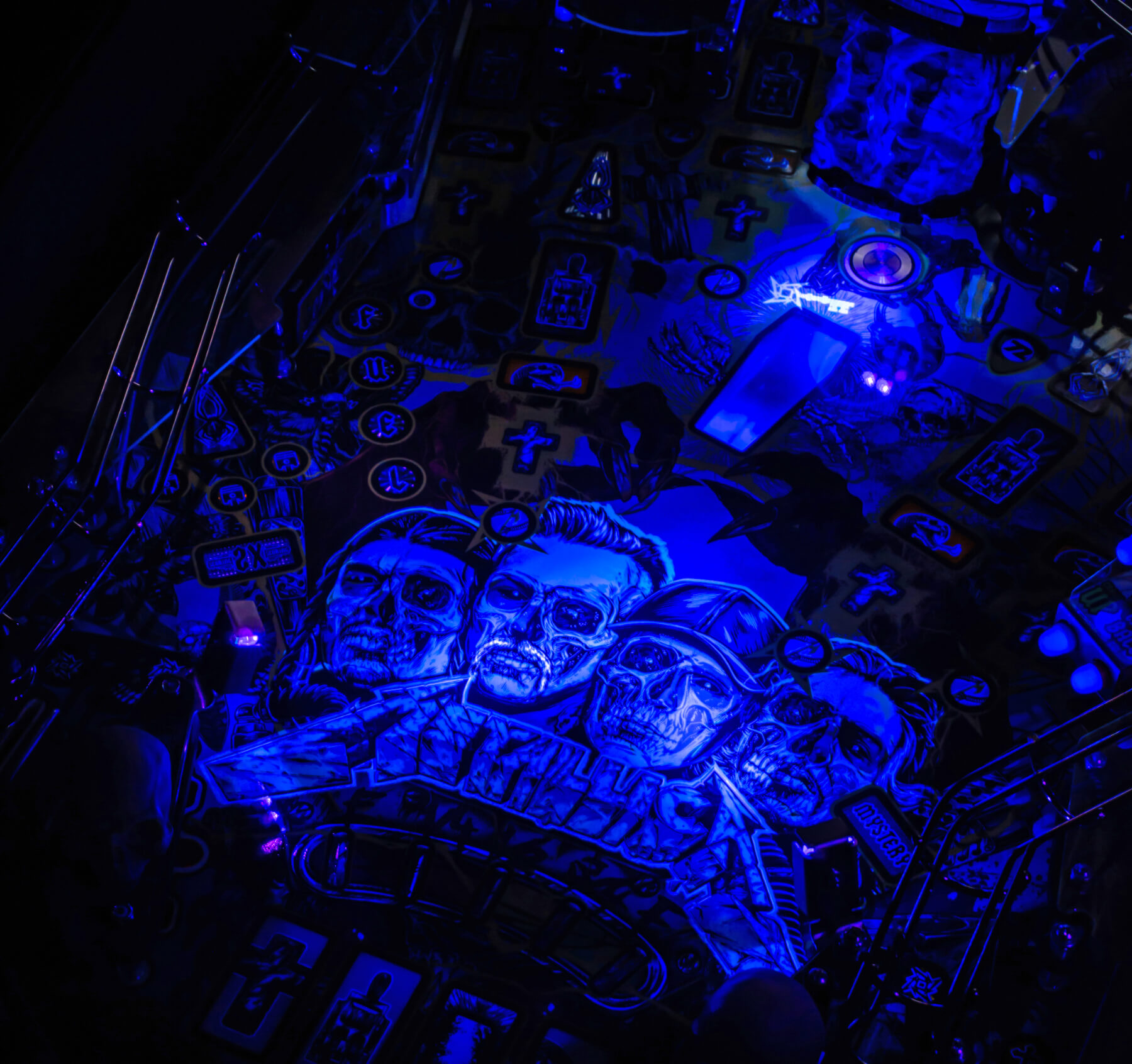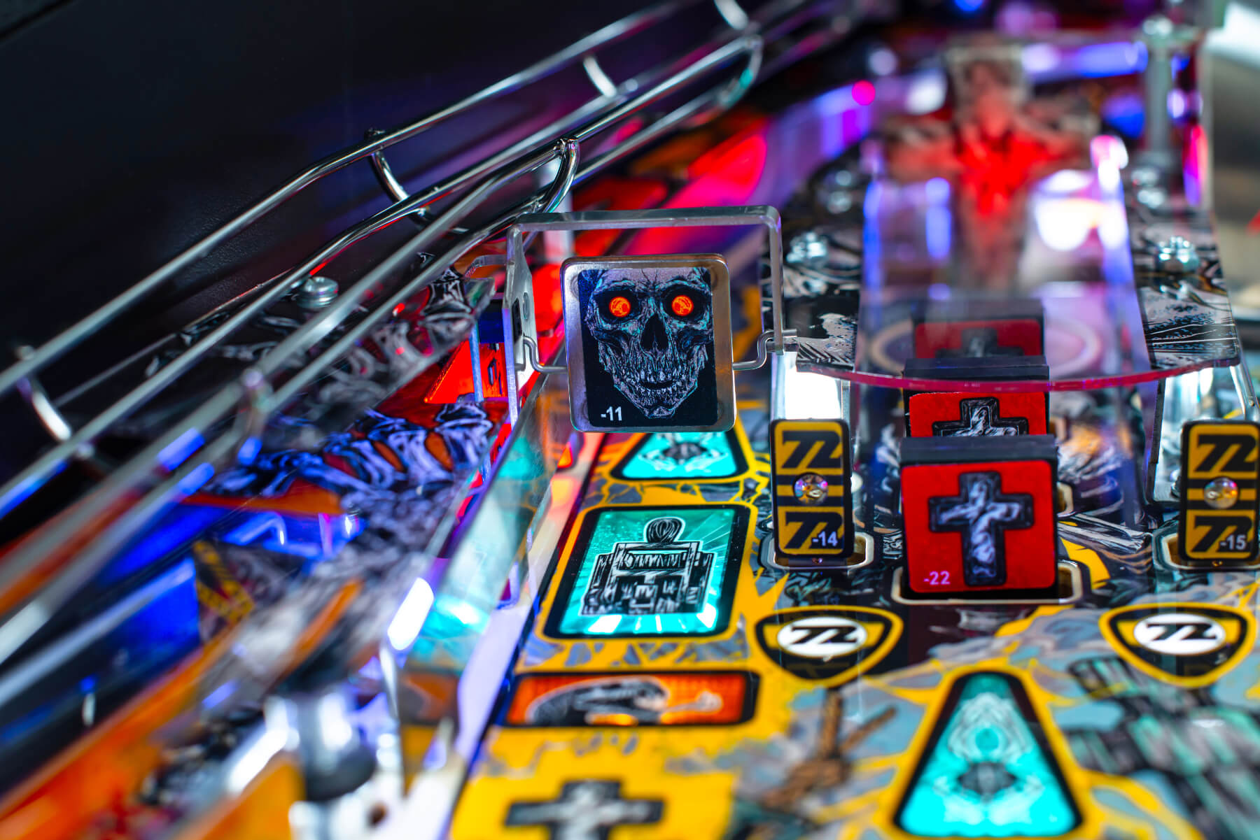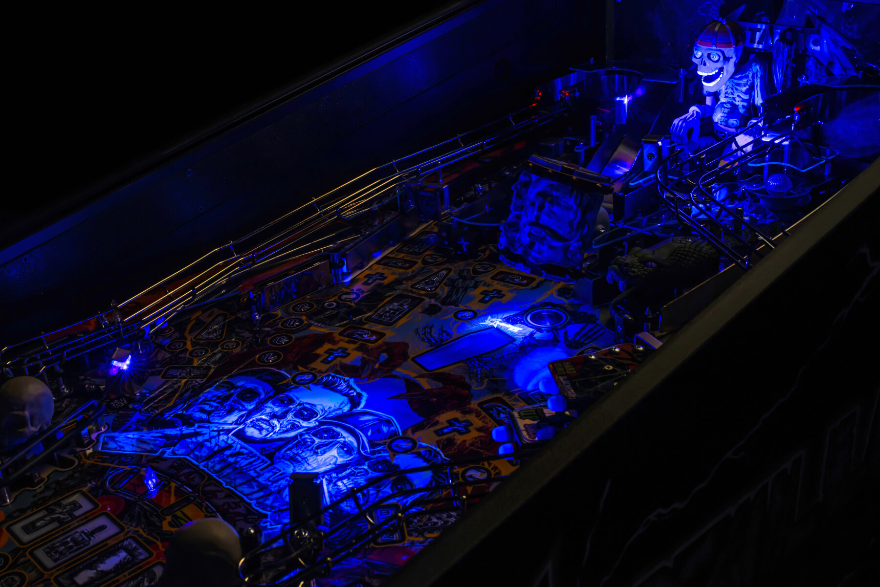 Wherever You May Roam on this exciting, upgraded playfield, you'll be amazed at the depth of playability and the immersive interactivity of sculptures, targets and more. Sparky's Electric Chair is fully articulated and responds to ball strikes. Electrocute him and watch spectacular UV lightning effects ripple through his body! Target the Master of Puppets Grave Marker targets and watch as the magnet seizes your ball and throws it across the playfield! Witness the all-new Gavel dispensing Justice For All, smashing your ball down into an underground Coffin ball lock - that's visible through the playfield!