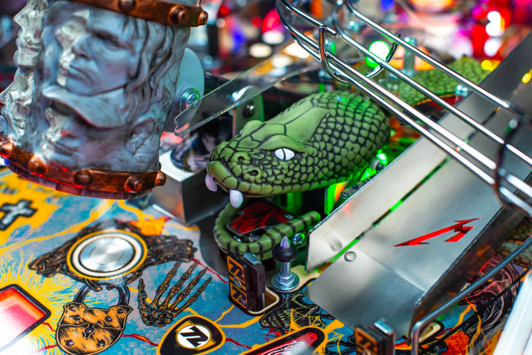 Tangle with the animated Snake that will grab and spit out your ball! Traverse the 'M'-engraved left and right ramps, and the new chromed wireforms, and roam the whole playfield. Snipe targets like the optical spinners, 'Fuel' bar, 72 Seasons stand-ups, Dead End stand-up, RGB-lit pop bumpers and the Power Scoop ball eject. The new lighting system brings unnatural life to the playfield as you play, with spectacular UV and LED visual effects responding at lightning speed to your gameplay and your score. To succeed, you must truly Ride The Lightning! See all the features, modes, components and specification in the Features Matrix, shown in the Gallery.