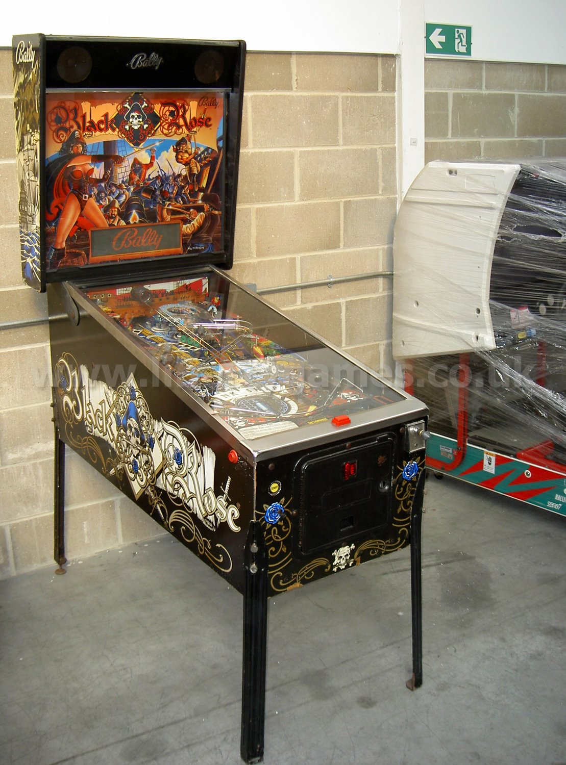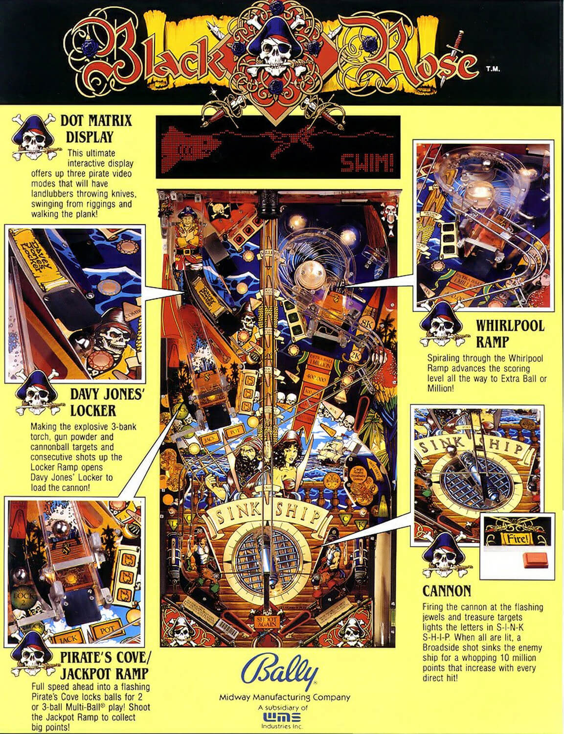 BLACK ROSE - Pinball Machine. Manufacturer: Midway Year of Release: 1992 About the Game: Shiver me timbers - Black Rose is a fun, feature-packed game from Midway with a pirate theme with an interactive dot matrix display that offers up three pirate video modes that will have players throwing knives, swinging from the rigging and walking the plank.