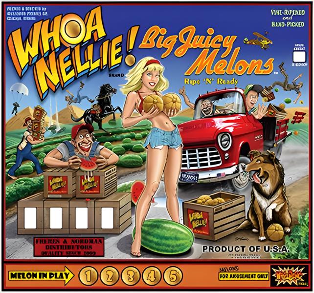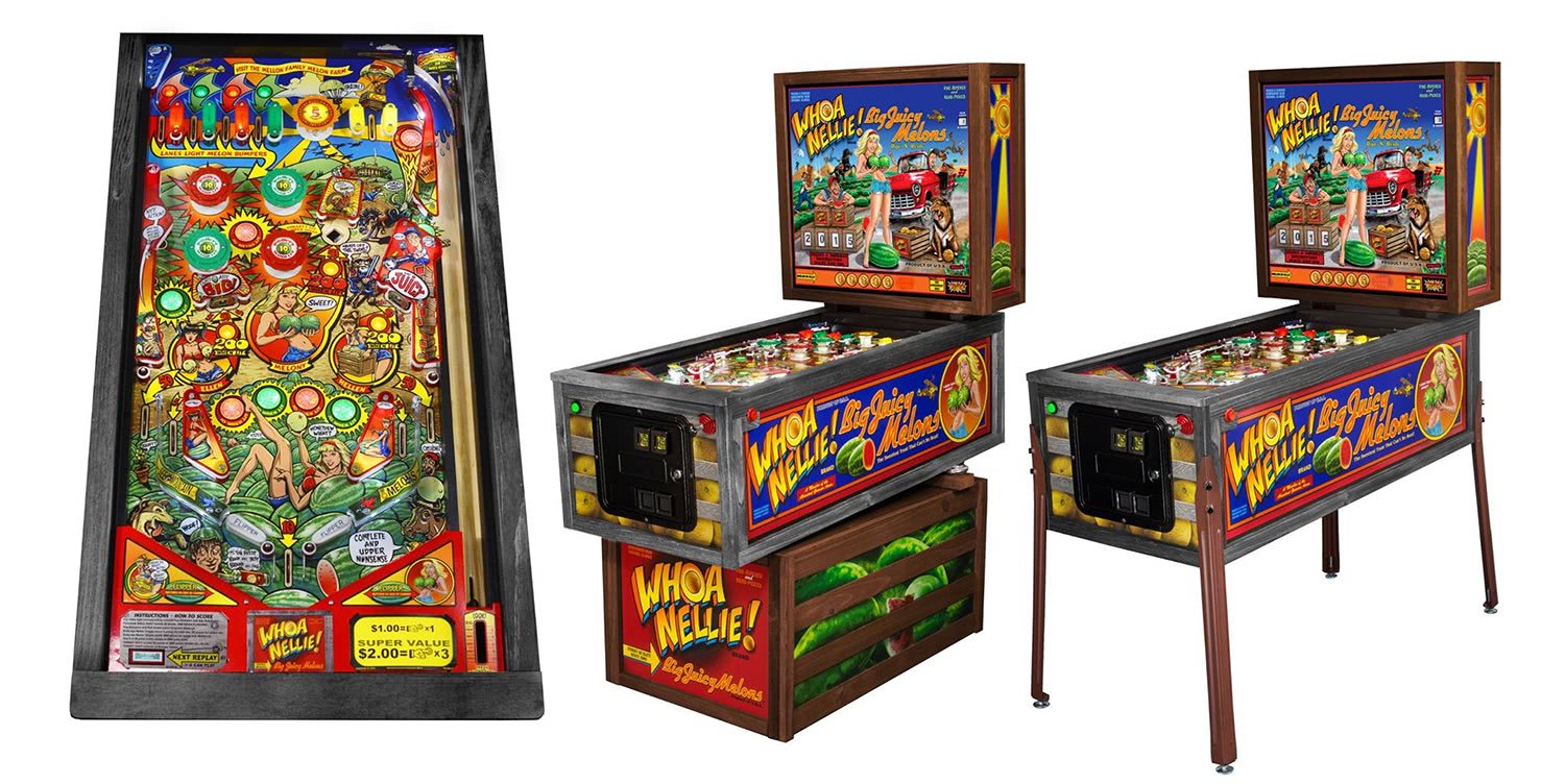 "Whoa Nellie! Big Juicy Melons" is possibly Stern's greatest machine yet! It includes a weathered fruit crate stand with hand painted.......you guessed it melons on the side. To give the playfield the correct angle, Stern have hand crushed themed "Woah Nellie!" beer cans in between the crate and cabinet. A set of powder coated legs are also included with the machine, just in case the crate isn't your thing!