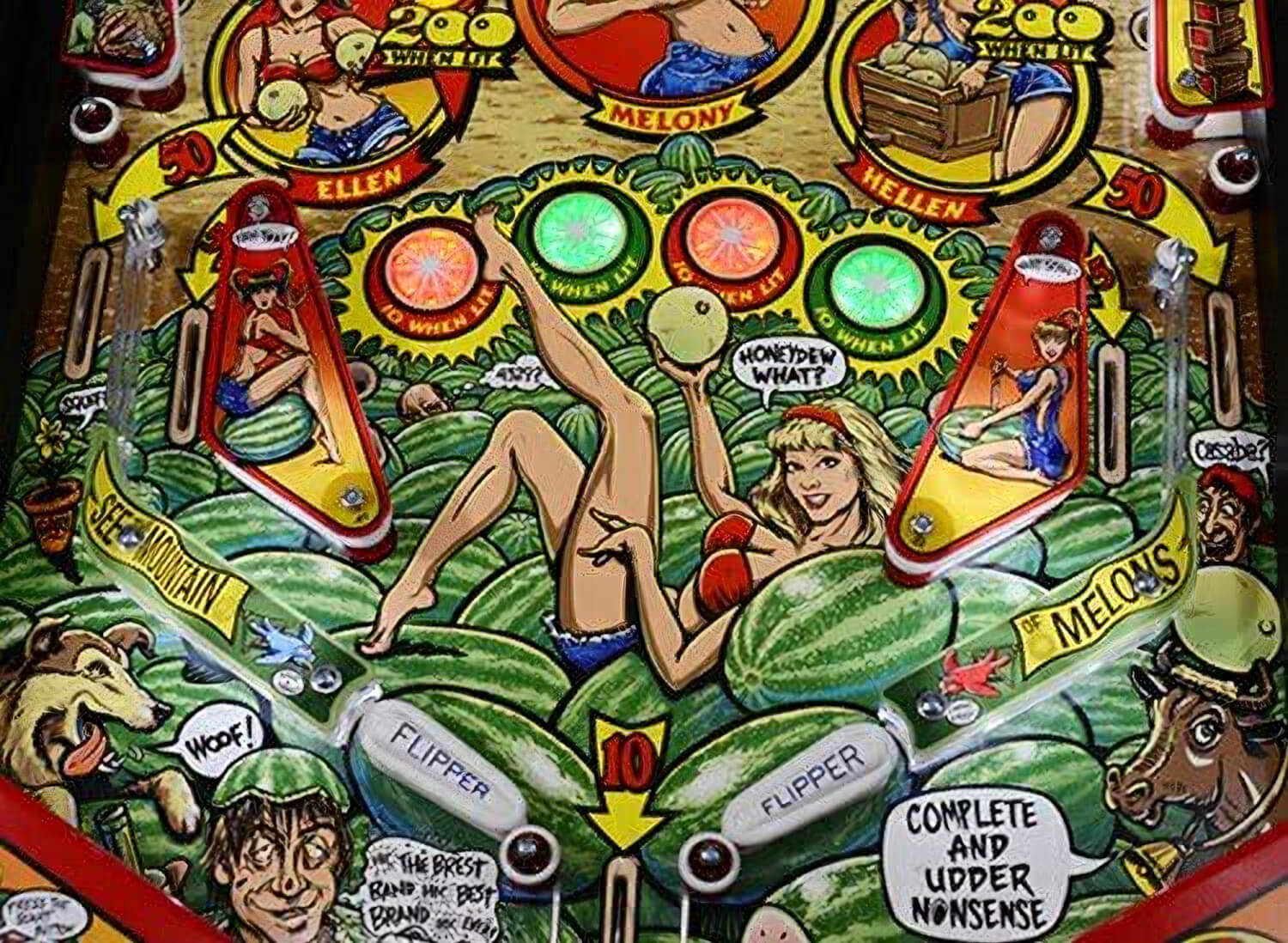 The colourful graphics on this machine have been exclusively hand drawn by Greg Ferres. They include detailed drawings of Mellony Melon, her father and her twin sisters Ellen and Hellen. Other notable illustrations include the farm animals, fruit and balloons!