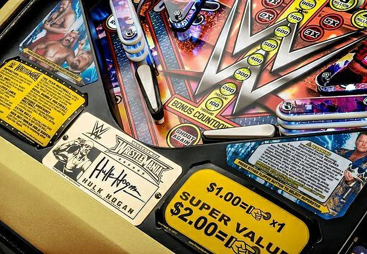 Stern's latest limited edition pinball machine perfectly incorporates the undeniable character and excitement of the WWE brand with top quality game play. This superb looking LE machine has been inspired by the WWE story stretching back to the iconic era of Hulk Hogan, The Ultimate Warrior, Andre the Giant right through to the current wrestling superstars.