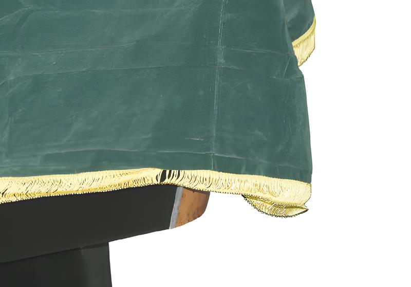 DELUXE GREEN TABLE COVER Product ref: 3356.01 A deluxe green table cover with gold coloured fringe, available in 12ft size! This luxurious plastic cover for 12ft snooker tables has an incredible deep green colour and a gold coloured fringe.