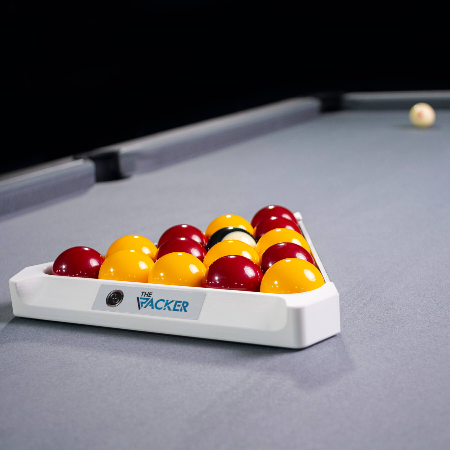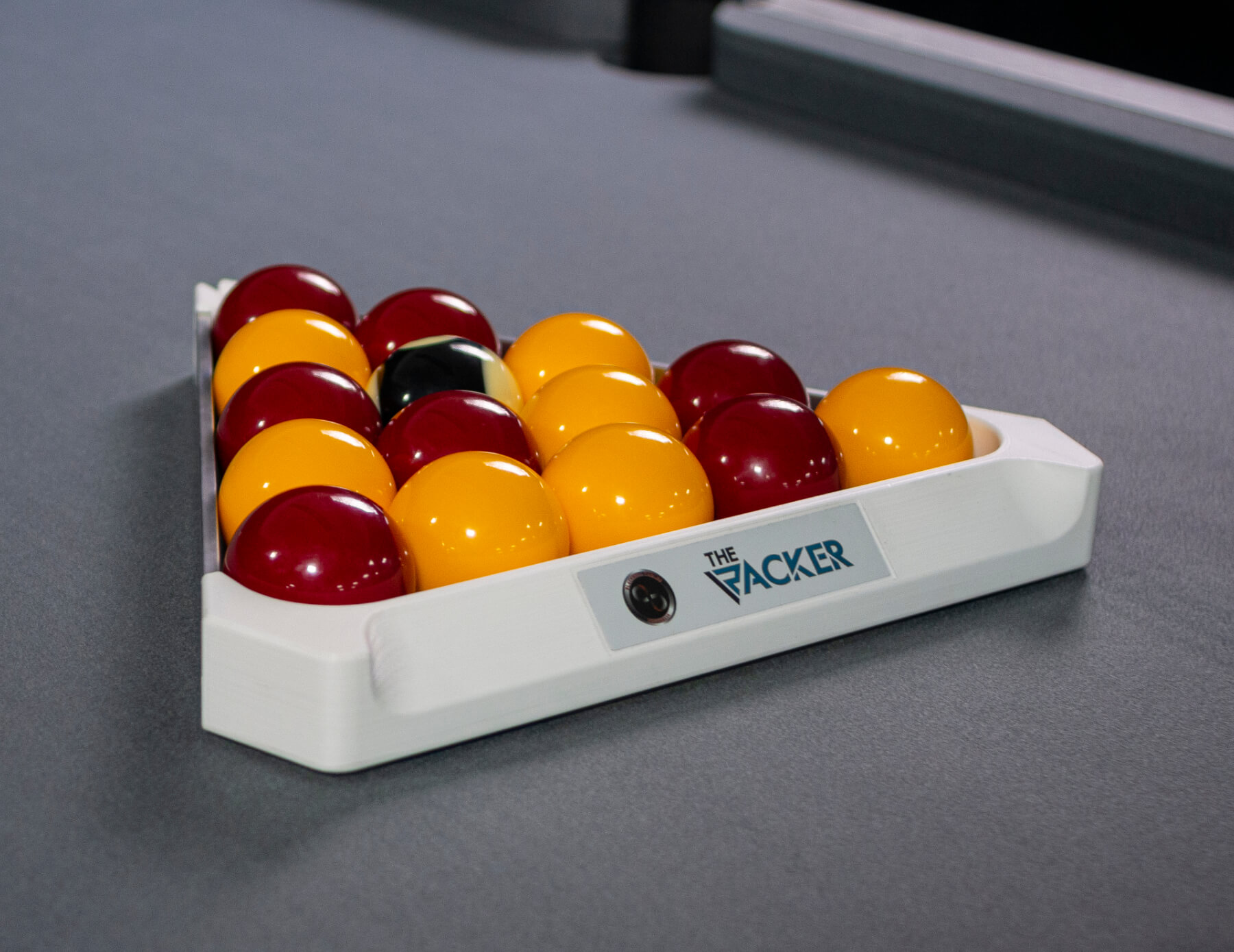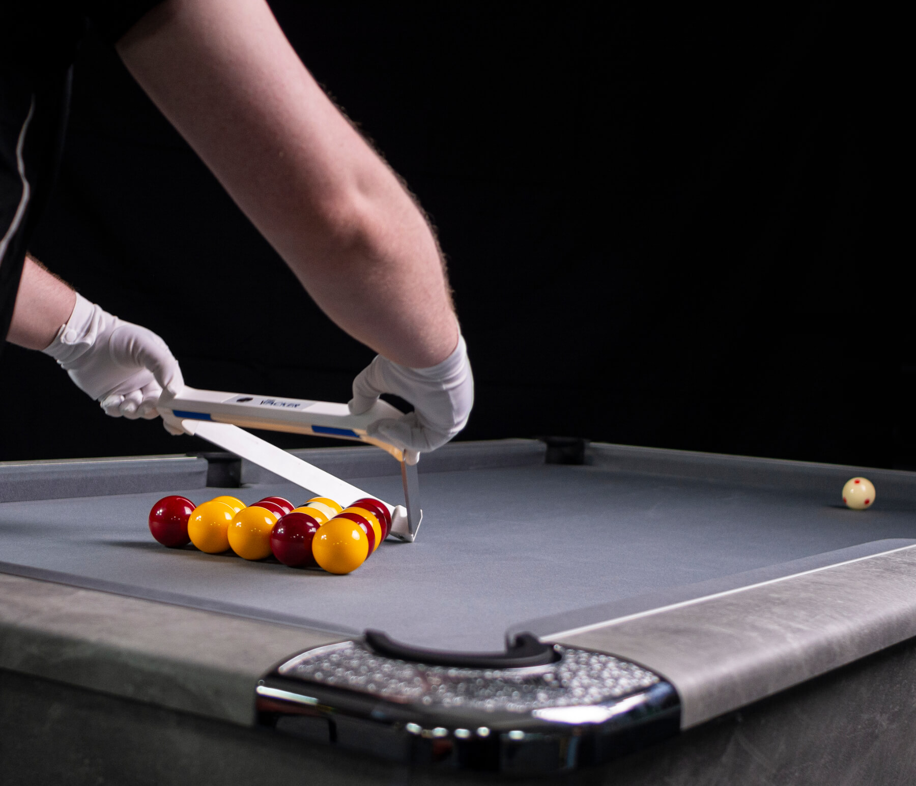 The Pro Racker allows you to precisely calibrate each rack when you're setting up a game of English pool with 2-inch balls. Instead of dropping the black ball onto the spot, which can eventually damage your cloth, you can use the slot on the front of the triangle to set its position.