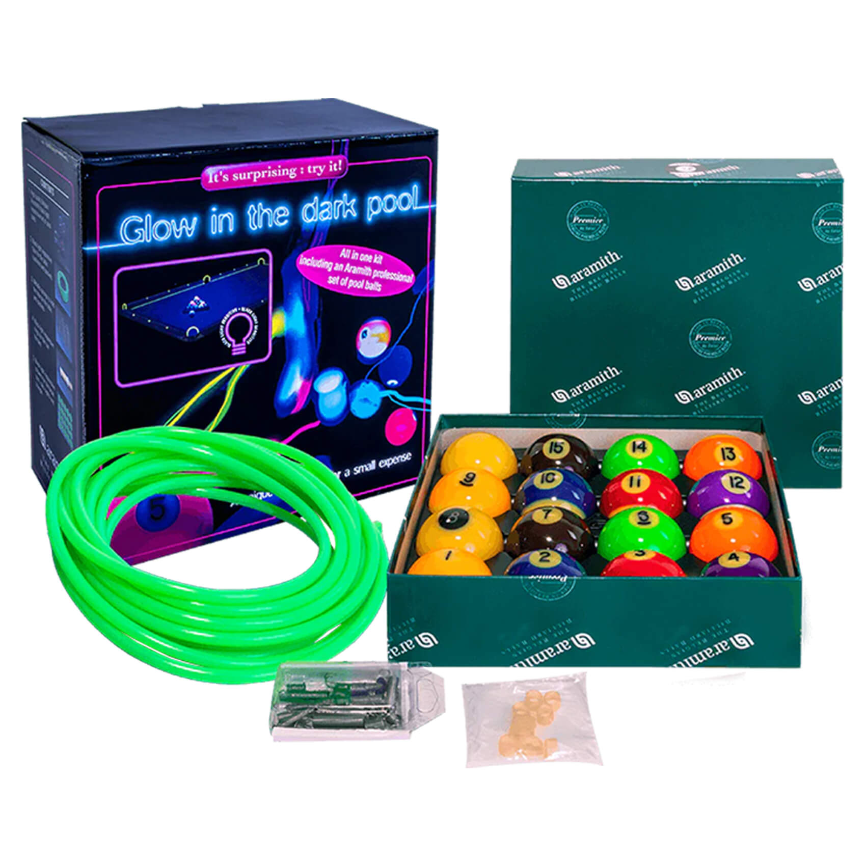 It's provided with an Aramith Fluo Table Conversion Kit which features reflective cushion tubes with fastening springs, cue rings that fit to the ferrules, plus stickers for your break spot, rail sights and triangle placement. These extra kit pieces shine brightly to create a spectacular visual effect.