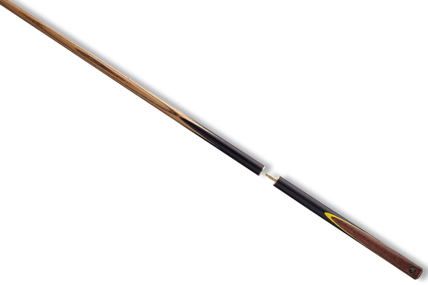 The butt section is made of hand-spliced ebony, with a beautiful thuya burl decal that’s been decorated with a yellow veneer.