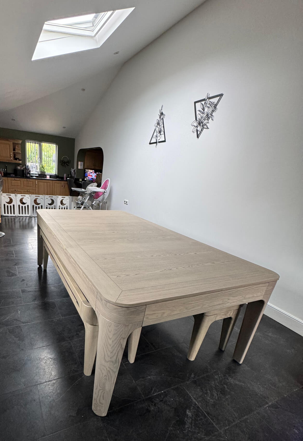 Available with your table as an optional upgrade is a dining top that matches your chosen finish perfectly. This dining top comes in three pieces, which makes the tops easier to handle and to conceal for storage. The tops are simply lifted into place, and small metal pegs slot together to ensure a perfect fit.