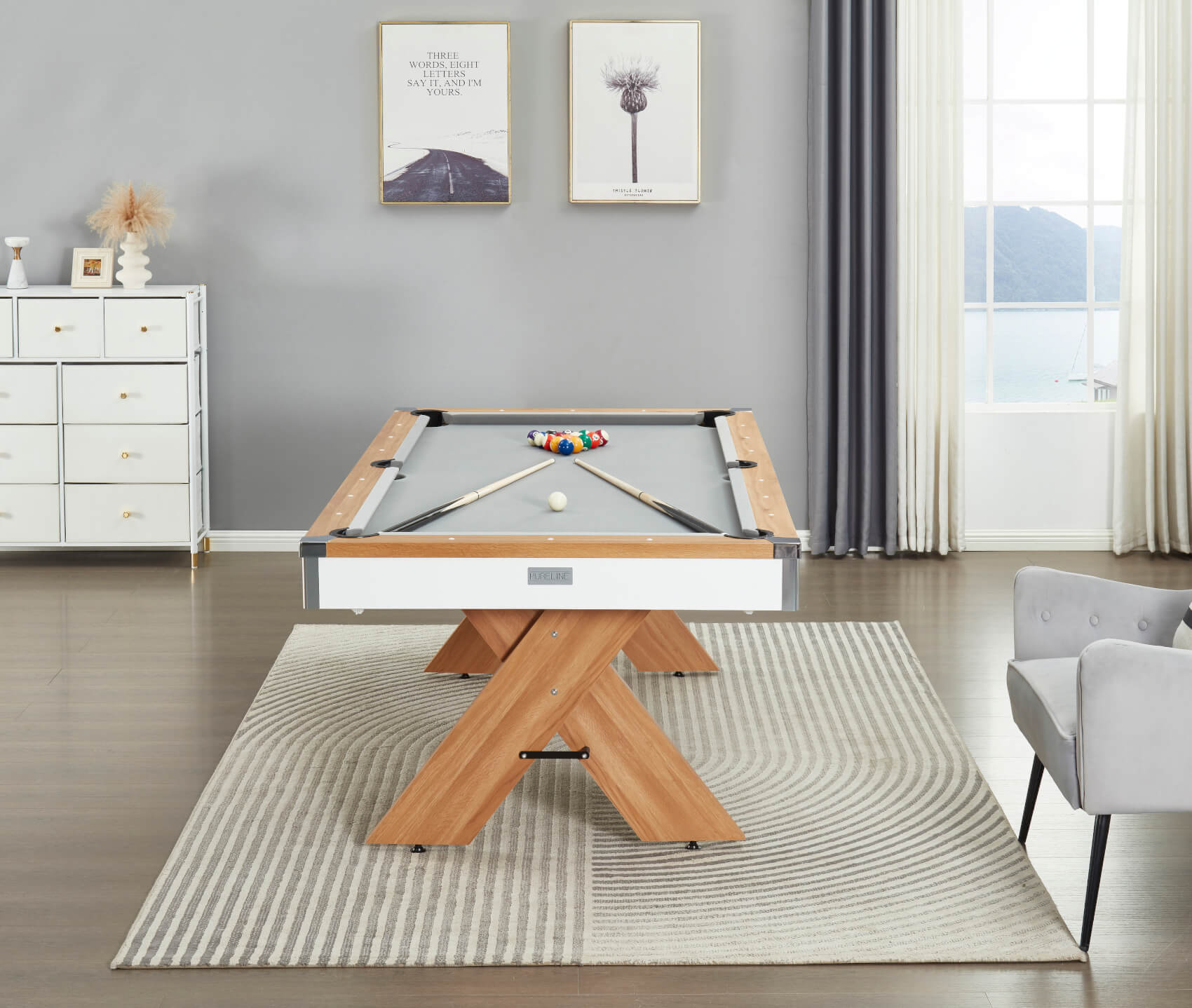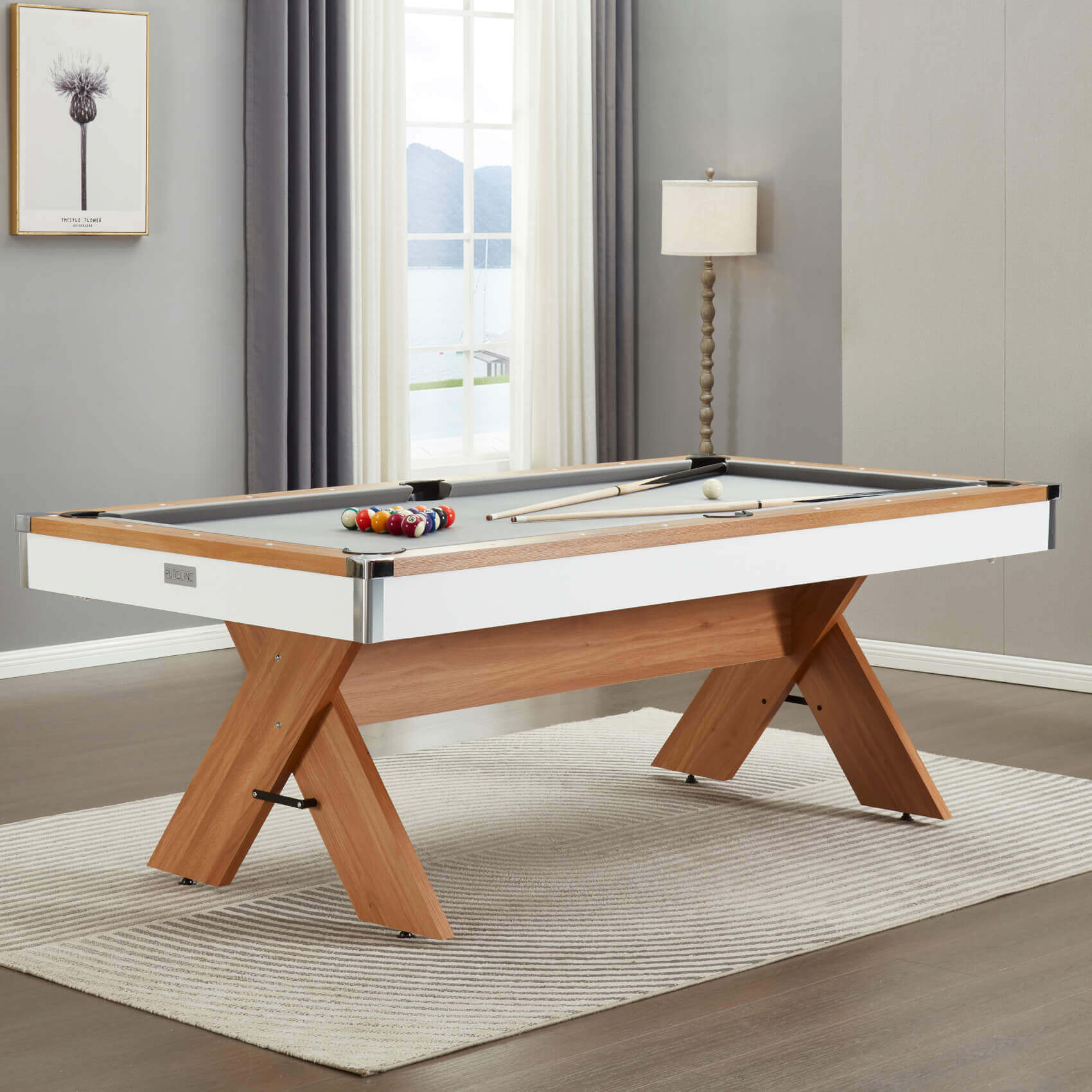The stylish Twist is a premium composite-bed pool table in your choice of size and finish! Its slimline cabinet is designed for the ultimate in style, and also provides plenty of legroom underneath. A sumptuous, honey-coloured wood grain finish adorns the top rail and the legs, whilst the cabinet body can be chosen in White or Black.